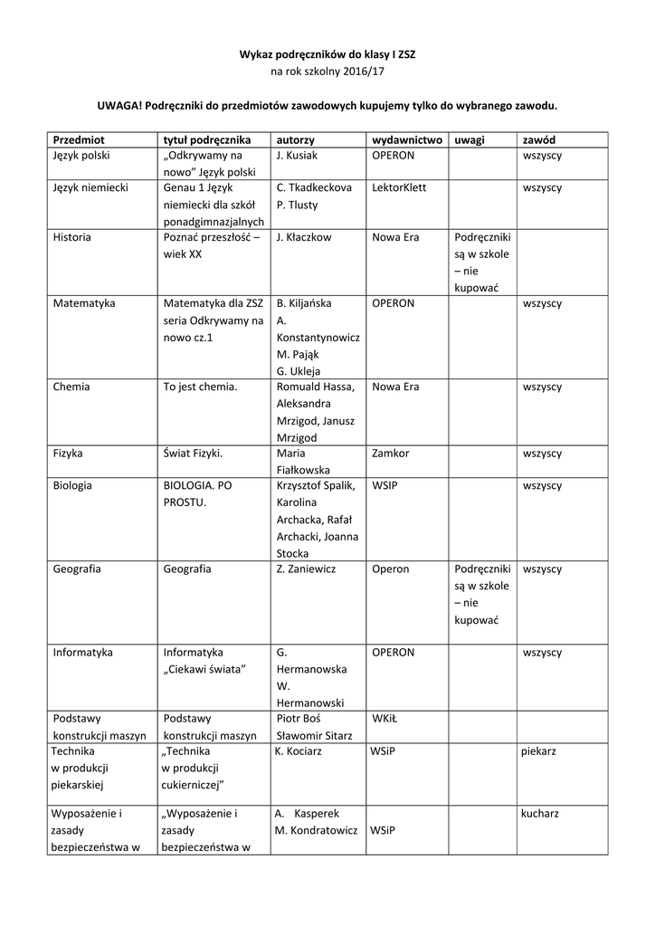 Wykaz podręczników do klasy I ZSZ na rok szkolny 2016/17 UWAGA