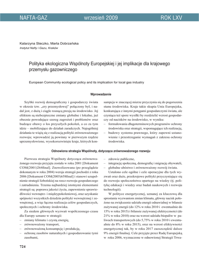 NAFTA-GAZ wrzesień 2009 ROK LXV Katarzyna Steczko, Marta Dobrzańska Instytut Nafty i Gazu, Kraków Polityka ekologiczna Wspólnoty Europejskiej i jej implikacje dla krajowego przemysłu gazowniczego European Community ecological policy and its implication for local gas industry Wprowadzenie Szybki rozwój demograficzny i gospodarczy świata w okresie tzw. „ery przemysłowej” połączony był, i nadal jest, z dużą i ciągle rosnącą presją na środowisko. Jej efektem są niebezpieczne zmiany globalne i lokalne, już obecnie powodujące szereg zagrożeń i problemów oraz budzące obawy o los przyszłych pokoleń, a co za tym idzie – mobilizujące do działań zaradczych. Najogólniej działania te wiążą się z realizacją polityki zrównoważonego rozwoju; wprowadzić ją powinny w pierwszym rzędzie uprzemysłowione, wysokorozwinięte kraje, których kon- sumpcja w znaczącej mierze przyczynia się do pogorszenia stanu środowiska. Kraje takie skupia Unia Europejska, konkurująca z innymi potęgami gospodarczymi świata, ale czyniąca też spore wysiłki by rozdzielić wzrost gospodarczy od nacisków na środowisko, w wyniku: –– formułowania długoterminowych programów ochrony środowiska oraz strategii, wspomagające ich realizację, –– budowy systemu prawnego, który zapewni ustanowienie i przestrzeganie wymagań z zakresu ochrony środowiska. Odnowiona strategia Wspólnoty, dotycząca zrównoważonego rozwoju Pierwsza strategia Wspólnoty dotycząca zrównoważonego rozwoju przyjęta została w roku 2001 [Dokument COM(2001)264final]. Znowelizowana (po przeglądzie dokonanym w roku 2004) wersja strategii pochodzi z roku 2006 [Dokument COM(2005)658final] i stanowi uzupełnienie strategii lizbońskiej na rzecz rozwoju gospodarczego i zatrudnienia. Trzema najbardziej istotnymi elementami strategii są: poprawa jakości życia, zapewnienie sprawiedliwości wewnątrz- i międzypokoleniowej, oraz uzyskanie spójności wszystkich dziedzin polityki wewnętrznej i zewnętrznej, a więc łączna realizacja celów gospodarczych, społecznych i ochrony środowiska. Za siedem głównych wyzwań współczesnego czasu dla Europy uznano w strategii: –– zmiany klimatu i czystą energię, –– zrównoważony transport, –– zrównoważoną konsumpcję i produkcję, –– ochronę zasobów naturalnych i gospodarowanie tymi zasobami, 724 –– zdrowie publiczne, –– integrację społeczną, demografię i migrację obywateli, –– globalne ubóstwo i zrównoważony rozwój świata. Ustalono cele ogólne i cele operacyjne dla tych wyzwań oraz duże, przekrojowe polityki przyczyniające się do rozwoju społeczeństwa opartego na wiedzy (tj. politykę edukacji i wiedzy oraz badań naukowych i rozwoju technologii). W polityce energetycznej, uznanej za kluczową dla sprostania wyzwaniom zmian klimatu, główny nacisk położono na zwiększenie udziału energii odnawialnej w bilansie zużywanej energii (do 12% w roku 2010 i ewentualnie do 15% w roku 2015) i bilansie zużywanej elektryczności (do 21% w roku 2010) oraz na wzrost udziału biopaliw w paliwach transportowych (do 5,75% w roku 2010 i ewentualnie do 8% w roku 2015), oraz na wzrost efektywności energetycznej tak, by w roku 2017 zaoszczędzić dalsze 9% energii finalnej. Cele przyjęte przez Radę Europejską w roku 2006, wyznaczone w odnowionej Strategii Trwa- artykuły łego Rozwoju Unii Europejskiej, szybko uznane zostały przez Komisje Europejską za niewystarczające. Komisja 10 stycznia 2007 roku przedstawiła Radzie i Parlamentowi Europejskiemu nową propozycję polityki energetycznej do roku 2020, ujmowaną hasłowo jako „3 × 20% + 10%”. Obejmowała ona: –– redukcję emisji ditlenku węgla o 20% w stosunku do roku 1990, –– zmniejszenie energochłonności o 20%, –– zwiększenie udziału energii produkowanej ze źródeł odnawialnych do 20%, –– zwiększenie udziału biopaliw w paliwach transportowych o 10%. Podczas szczytu Unii w marcu 2007 roku propozycję tę zaakceptowali przywódcy Państw Członkowskich, ustalając, że limity udziału energii produkowanej ze źródeł odnawialnych będą różne dla poszczególnych krajów; w zależności od ich sytuacji wyjściowej i możliwości wytwarzania energii ze źródeł odnawialnych (w Polsce 15%). Wyznaczone cele będą trudne do spełnienia w tych krajach, w których energetyka oparta jest w dużej mierze na węglu i jest brak sprzyjających warunków do budowy elektrowni wodnych i wiatrowych. W takiej właśnie sytuacji jest Polska, której gospodarka energetyczna bazuje w blisko 60% na węglu; decyzje dotyczące wykorzystania energetyki jądrowej były przez zbyt długi czas odkładane (13 stycznia br. Rada Ministrów podjęła uchwałę o rozpoczęciu prac nad Programem Polskiej Energetyki Jądrowej, w ramach którego zakłada się uruchomienie w roku 2020 pierwszej elektrowni jądrowej), udział energii ze źródeł odnawialnych jest niewielki, a położenie geograficzne i warunki klimatyczne nie dają możliwości korzystania w dużym stopniu z energii wiatrowej i wodnej, zatem dla naszego kraju wyznaczony termin końcowy (2020 rok) jest zbyt bliski, a koszt osiągnięcia założonych celów zbyt wysoki. Cele operacyjne w kwestii systemów transportowych obejmują dojście do zrównoważonego poziomu wykorzystania energii, ograniczenie emisji zanieczyszczeń i hałasu, modernizację parku samochodowego tak – by poziom emisji CO2 ograniczyć najpierw do 140 g/km (2009), a potem do 120 g/km (2012). Cele te obejmą również, promowanie publicznych przewozów pasażerskich oraz wzrost bezpieczeństwa. Kształtowaniu nowych wzorów produkcji i konsumpcji służyć ma dialog ze środowiskiem biznesu, zwiększenie poziomu proekologicznych zamówień publicznych, szerzenie wiedzy o produktach i procesach oraz sprzężenie jej z wiedzą o środowisku i promocją technologii środowiskowych. Poprawa gospodarowania zasobami naturalnymi, 