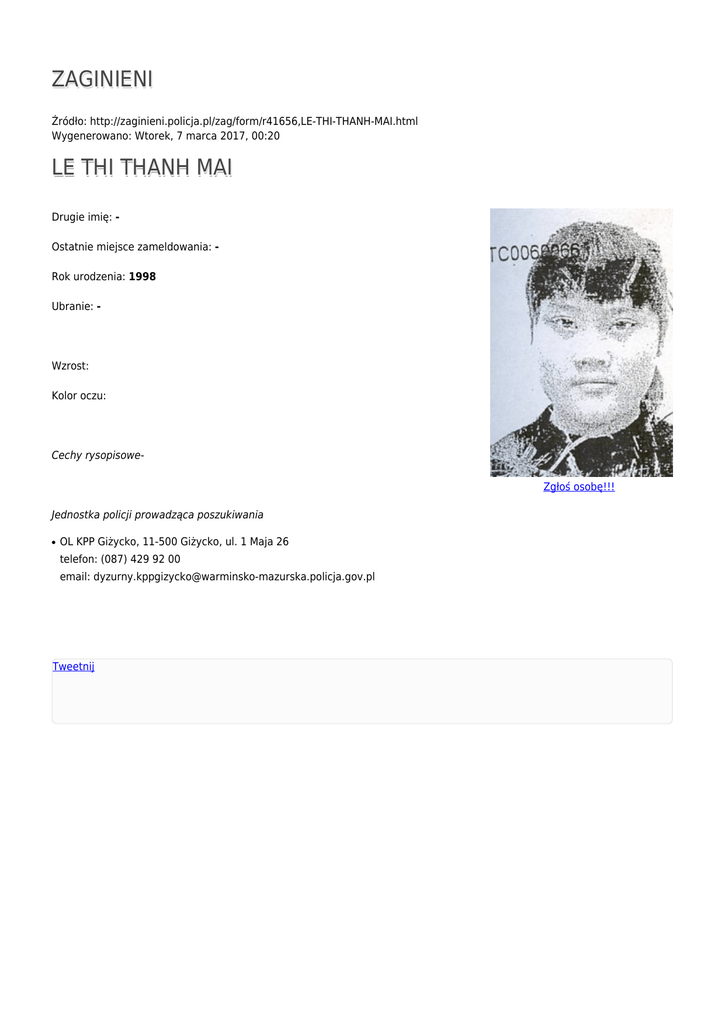 ZAGINIENI Źródło: http://zaginieni.policja.pl/zag/form/r41656,LE-THI-THANH-MAI.html Wygenerowano: Wtorek, 7 marca 2017, 00:20 LE THI THANH MAI Drugie imię: Ostatnie miejsce zameldowania: Rok urodzenia: 1998 Ubranie: - Wzrost: Kolor oczu: Cechy rysopisoweZgłoś osobę!!! Jednostka policji prowadząca poszukiwania ● OL KPP Giżycko, 11-500 Giżycko, ul. 1 Maja 26 telefon: (087) 429 92 00 email: [email protected] Tweetnij