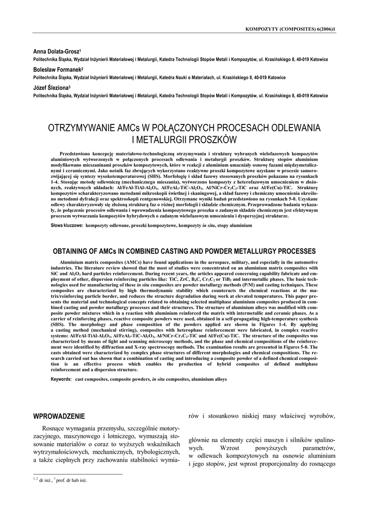 KOMPOZYTY (COMPOSITES) 6(2006)1 Anna Dolata-Grosz1 Politechnika Śląska, Wydział Inżynierii Materiałowej i Metalurgii, Katedra Technologii Stopów Metali i Kompozytów, ul. Krasińskiego 8, 40-019 Katowice Bolesław Formanek2 Politechnika Śląska, Wydział Inżynierii Materiałowej i Metalurgii, Katedra Nauki o Materiałach, ul. Krasińskiego 8, 40-019 Katowice Józef Śleziona3 Politechnika Śląska, Wydział Inżynierii Materiałowej i Metalurgii, Katedra Technologii Stopów Metali i Kompozytów, ul. Krasińskiego 8, 40-019 Katowice OTRZYMYWANIE AMCs W POŁĄCZONYCH PROCESACH ODLEWANIA I METALURGII PROSZKÓW Przedstawiono koncepcję materiałowo-technologiczną otrzymywania i strukturę wybranych wielofazowych kompozytów aluminiowych wytworzonych w połączonych procesach odlewania i metalurgii proszków. Strukturę stopów aluminium modyfikowano mieszaninami proszków kompozytowych, które w reakcji z aluminium umacniały osnowę fazami międzymetalicznymi i ceramicznymi. Jako nośnik faz zbrojących wykorzystano reaktywne proszki kompozytowe uzyskane w procesie samorozwijającej się syntezy wysokotemperaturowej (SHS). Morfologię i skład fazowy stosowanych proszków pokazano na rysunkach 1-4. Stosując metodę odlewniczą (mechanicznego mieszania), wytworzono kompozyty z heterofazowym umocnieniem w złożonych, reaktywnych układach: Al/FeAl-TiAl-Al2O3, Al/FeAl3-TiC-Al2O3, Al/NiCr-Cr3C2-TiC oraz Al/Fe(Cu)-TiC. Strukturę kompozytów scharakteryzowano metodami mikroskopii świetlnej i skaningowej, a skład fazowy i chemiczny umocnienia określono metodami dyfrakcji oraz spektroskopii rentgenowskiej. Otrzymane wyniki badań przedstawiono na rysunkach 5-8. Uzyskane odlewy charakteryzowały się złożoną strukturą faz o różnej morfologii i składzie chemicznym. Przeprowadzone badania wykazały, że połączenie procesów odlewania i wprowadzenia kompozytowego proszku o zadanym składzie chemicznym jest efektywnym procesem wytwarzania kompozytów hybrydowych o zadanym wielofazowym umocnieniu i dyspersyjnej strukturze. Słowa kluczowe: kompozyty odlewane, proszki kompozytowe, kompozyty in situ, stopy aluminium OBTAINING OF AMCs IN COMBINED CASTING AND POWDER METALLURGY PROCESSES Aluminium matrix composites (AMCs) have found applications in the aerospace, military, and especially in the automotive industries. The literature review showed that the most of studies were concentrated on an aluminium matrix composites with SiC and Al2O3 hard particles reinforcement. During recent years, the articles appeared concerning capability fabricate and employment of other, dispersion reinforcing particles like: TiC, ZrC, B4C, Cr3C2 or TiB2 and intermetallic phases. The basic technologies used for manufacturing of these in situ composites are powder metallurgy methods (P/M) and casting techniques. These composites are characterized by high thermodynamic stability which counteracts the chemical reactions at the matrix/reinforcing particle border, and reduces the structure degradation during work at elevated temperatures. This paper presents the material and technological concepts related to obtaining selected multiphase aluminium composites produced in combined casting and powder metallurgy processes and their structures. The structure of aluminium alloys was modified with composite powder mixtures which in a reaction with aluminium reinforced the matrix with intermetallic and ceramic phases. As a carrier of reinforcing phases, reactive composite powders were used, obtained in a self-propagating high-temperature synthesis (SHS). The morphology and phase composition of the powders applied are shown in Figures 1-4. By applying a casting method (mechanical stirring), composites with heterophase reinforcement were fabricated, in complex reactive systems: Al/FeAl-TiAl-Al2O3, Al/FeAl3-TiC-Al2O3, Al/NiCr-Cr3C2-TiC and Al/Fe(Cu)-TiC. The structure of the composites was characterized by means of light and scanning microscopy methods, and the phase and chemical compositions of the reinforcement were identified by diffraction and X-ray spectroscopy methods. The examination results are presented in Figures 5-8. The casts obtained were characterized by complex phase structures of different morphologies and chemical compositions. The research carried out has shown that a combination of casting and introducing a composite powder of a defined chemical composition is an effective process which enables the production of hybrid composites of defined multiphase reinforcement and a dispersion structure. Keywords: cast composites, composite powders, in situ composites, aluminium alloys WPROWADZENIE Rosnące wymagania przemysłu, szczególnie motoryzacyjnego, maszynowego i lotniczego, wymuszają stosowanie materiałów o coraz to wyższych wskaźnikach wytrzymałościowych, mechanicznych, trybologicznych, a także cieplnych przy zachowaniu stabilności wymia1, 2 dr inż., 3 prof. dr hab inż. rów i stosunkowo niskiej masy właściwej wyrobów, głównie na elementy części maszyn i silników spalinowych. Wzrost powyższych parametrów, w odlewach kompozytowych na osnowie aluminium i jego stopów, jest wprost proporcjonalny do rosnącego Otrzymywanie AMCs w połączonych procesach odlewania i metalurgii proszków udziału objętościowego cząstek zbrojących i odwrotnie proporcjonalny do ich rozmiaru [1-3]. Z kolei wraz ze wzrostem udziału objętościowego zbrojenia - powyżej 15÷20% - wzrasta znacznie lepkość zawiesiny kompozytowej. Powoduje to obniżenie jej właściwości odlewniczych, przede wszystkim lejności, a w konsekwencji uniemożliwia odlanie kompozytu do formy. Ponadto wprowadzenie cząstek dyspersyjnych o wielkościach poniżej 10 μm lub nanometrycznych nie jest możliwe do zrealizowania z punktu widzenia klasycznej metody zawiesinowej [1]. Z analizy danych literaturowych i stanu wiedzy w zakresie wytwarzania odlewanych kompozytów z osnową aluminiową wynika, że: 1. Opracowane i wdrożone zos