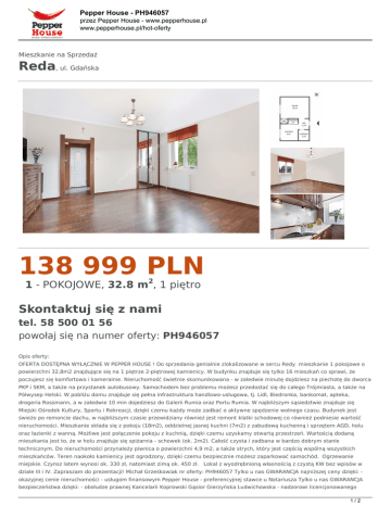 Pepper House - PH946057 przez Pepper House - www.pepperhouse.pl www.pepperhouse.pl/hot-oferty Mieszkanie na Sprzedaż Reda, ul. Gdańska 138 999 PLN 1 - POKOJOWE, 32.8 m2, 1 piętro Skontaktuj się z nami tel. 58 500 01 56 powołaj się na numer oferty: PH946057 Opis oferty: OFERTA DOSTĘPNA WYŁĄCZNIE W PEPPER HOUSE ! Do sprzedania genialnie zlokalizowane w sercu Redy mieszkanie 1 pokojowe o powierzchni 32,8m2 znajdujące się na 1 piętrze 2-piętrowej kamienicy. W budynku znajduje się tylko 16 mieszkań co sprawi, że poczujesz się komfortowo i kameralnie. Nieruchomość świetnie skomunikowana - w zaledwie minutę dojdziesz na piechotę do dworca PKP i SKM, a także na przystanek autobusowy. Samochodem bez problemu możesz przedostać się do całego Trójmiasta, a także na Półwysep Helski. W pobliżu domu znajduje się pełna infrastruktura handlowo-usługowa, tj. Lidl, Biedronka, bankomat, apteka, drogeria Rossmann, a w zaledwie 10 min dojedziesz do Galerii Rumia oraz Portu Rumia. W najbliższym sąsiedztwie znajduje się Miejski Ośrodek Kultury, Sportu i Rekreacji, dzięki czemu każdy może zadbać o aktywne spędzenie wolnego czasu. Budynek jest świeżo po remoncie dachu, w najbliższym czasie przewidziany również jest remont klatki schodowej co również podniesie wartość nieruchomości. Mieszkanie składa się z pokoju (18m2), oddzielnej jasnej kuchni (7m2) z zabudową kuchenną i sprzętem AGD, holu oraz łazienki z wanną. Możliwe jest połączenie pokoju z kuchnią, dzięki czemu uzyskamy otwartą przestrzeń. Wartością dodaną mieszkania jest to, że w holu znajduje się spiżarnia - schowek (ok. 2m2). Całość czysta i zadbana w bardzo dobrym stanie technicznym. Do nieruchomości przynależy piwnica o powierzchni 4,9 m2, a także strych, który jest częścią wspólną wszystkich mieszkańców. Teren naokoło kamienicy jest ogrodzony, dzięki czemu bezpiecznie możesz zaparkować samochód. Ogrzewanie miejskie. Czynsz latem wynosi ok. 330 zł, natomiast zimą ok. 450 zł. Lokal z wyodrębnioną własnością z czystą KW bez wpisów w dziale III i IV. Zapraszam do prezentacji! Michał Grześkowiak nr oferty: PH946057 Tylko u nas GWARANCJA najniższej ceny dzięki: okazyjnej cenie nieruchomości - usługom finansowym Pepper House - preferencyjnej stawce u Notariusza Tylko u nas GWARANCJA bezpieczeństwa dzięki: - obsłudze prawnej Kancelarii Koprowski Gąsior Gierzyńska Ludwichowska - nadzorowi licencjonowanego 1/2 Pepper House - PH946057 przez Pepper House - www.pepperhouse.pl www.pepperhouse.pl/hot-oferty Pośrednika (nr licencji 6884) - polisie OC Pośrednika na kwotę 1 000 000 PLN w PZU SA - ubezpieczeniu kupowanej nieruchomości (szczegóły na naszej stronie). Więcej zdjęć, zdjęcia w dużym formacie, rzuty, filmy i dodatkowe informacje: www.pepperhouse.pl Wejdź już dziś i wyślij zapytanie bezpośrednio do opiekuna oferty. 2/2 Powered by TCPDF (www.tcpdf.org)