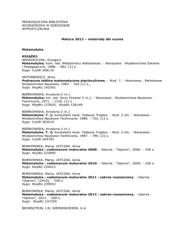 PEDAGOGICZNA BIBLIOTEKA WOJEWÓDZKA W RZESZOWIE WYPOŻYCZALNIA Matura 2012 – materiały dla ucznia Matamatyka KSIĄŻKI: ANDRZEJCZAK, Grzegorz Matematyka; kom. red. Włodzimierz Waliszewski. - Warszawa : Wydawnictwa Szkolne i Pedagogiczne, 1988. - 383, [1] s. Sygn. CzytR 208116 ANTONIEWICZ, Jerzy Podręczne tablice matematyczne pięciocyfrowe. - Wyd. 7. - Warszawa : Państwowe Wydawnictwo Naukowe, 1983. - 192 [1] s., Sygn. WypRz 192342 BIEŃKOWSKA, Krystyna [i in.] Matematyka; kol. red. Jerzy Dreszer [i in.]. - Warszawa : Wydawnictwa NaukowoTechniczne, 1971. - 1335, [1] s. Sygn. WypRz 123925, WypRz 126149 BIEŃKOWSKA, Krystyna [i in.] Matematyka. T. 1; konsultant nauk. Tadeusz Trajdos. - Wyd. 2 zm. - Warszawa : Wydawnictwa Naukowo-Techniczne, 1986. - 722, [1] s. Sygn. CzytR 202519 BIEŃKOWSKA, Krystyna [i in.] Matematyka. T. 2; konsultant nauk. Tadeusz Trajdos. - Wyd. 2 zm. - Warszawa : Wydawnictwa Naukowo-Techniczne, 1987. - 790, [2] s. Sygn. CzytR 204783 BORKOWSKA, Maria; JATCZAK, Anna Matematyka : vademecum maturalne 2009. - Gdynia : "Operon", 2006. - 328 s. Sygn. WypRz 233095 BORKOWSKA, Maria; JATCZAK, Anna Matematyka : vademecum maturalne 2010. - Gdynia : "Operon", 2009. - 328 s. Sygn. WypRz 234423 BORKOWSKA, Maria; JATCZAK, Anna Matematyka : vademecum maturalne 2011 : zakres rozszerzony. - Gdynia : "Operon", [2010]. - 328 s. Sygn. WypRz 235932 BORKOWSKA, Maria; JATCZAK, Anna Matematyka : vademecum maturalne 2012 : zakres rozszerzony. - Gdynia : "Operon", 2011. - 328 s. Sygn. WypRz 237250 BRONSZTEJN, I.N; SIEMIENDIEJEW, K.A. Matematyka : poradnik encyklopedyczny; [tł. z ros. i niem. Stefan Czarnecki, Robert Bartoszyński]. - Wyd. 2 rozsz. - Warszawa : Państwowe Wydawnictwo Naukowe, 1968. 856 s. Sygn. WypRz 103413, WypRz 103414 CEWE, Alicja; NAHORSKA, Halina Matura z matematyki od roku 2010 : praca zbiorowa. - Gdańsk : "Podkowa", 2009. - 271 s. Sygn. WypRz 237124 EMPACHER, Adam B. [i in.] Mały słownik matematyczny. - Warszawa : "Wiedza Powszechna", 1967. - 344 s. Sygn. CzytR 99966, WypRz 99815- 99817, WypRz 103433-103434, WypRz 127858 EMPACHER, Adam B. [i in.] Mały słownik matematyczny. – Wyd. 2. - Warszawa : "Wiedza Powszechna", 1970. 344 s. Sygn. WypRz 121216 GAŁĄZKA Kinga Obowiązkowa matura z matematyki 2012 : zakres podstawowy. - Gdynia : "Operon", 2011. - 415, [1] s. Sygn. WypRz 237129 GAŁĄZKA Kinga, BOROWSKA Maria Obowiązkowa matura z matematyki 2010 : zakres podstawowy. - Gdynia : "Operon", 2009. - 335 s. Sygn. WypRz 235627, WypRz 235639 GĘBURA, Aleksandra; GĘBURA, Krzysztof Matematyka, fizyka i astronomia. - Warszawa : Wydawnictwa Szkolne i Pedagogiczne, cop. 2004. - 200,[4] s. Sygn. CzytR 228721 GÓROWSKI, Jan; ŁOMNICKI, Adam Matematyka : liceum - poziom podstawowy. - Warszawa ; Bielsko-Biała : Wydawnictwo Szkolne PWN, 2008. - 180 s. Sygn. WypRz233746 HERBURT, Irmina; OLSZAŃSKA, Anna Matematyka : repetytorium dla maturzystów i kandydatów na wyższe uczelnie. - Warszawa : Wydawnictwa Szkolne i Pedagogiczne, cop. 2004. - 188 s. Sygn. CzytR 228124 HERBURT, Irmina; OLSZAŃSKA, Anna Matematyka : zakresy podstawowy i rozszerzony : pytania, zadania, arkusze egzaminacyjne. - Warszawa : Wydawnictwa Szkolne i Pedagogiczne, cop. 2004. - 166 s. Sygn. CzytR 227986, WypRz 228718 Informator maturalny od 2005 roku z matematyki / oprac. Centralna Komisja Egzaminacyjna w Warszawie we współpracy z Okręgową Komisją Egzaminacyjną w Krakowie]. - Warszawa : Centralna Komisja Egzaminacyjna, 2003. - 98 s. Sygn. WypRz 37696 B JARZYNA, Danuta; STRZELECKA, Maria Klucz maturzysty : matematyka / Danuta Jarzyna, Maria Strzelecka. - Wrocław : "Croma", 2002. - 213 s. Sygn. WypRz 232163 KIEŁBASA, Andrzej Matura z matematyki : poziom podstawowy i rozszerzony. Cz. 1. - Warszawa : "2000", 2006. - 183 s. Sygn. CzytR 230998 KIEŁBASA, Andrzej Matura z matematyki 2010 - ... : poziom podstawowy i rozszerzony. Cz. 1. Warszawa : "2000", 2009. - 172, [3] s. Sygn. WypRz 237122 KIEŁBASA, Andrzej; ŁUKASIEWICZ, Piotr Matura z matematyki : poziom podstawowy i rozszerzony. Cz. 2. - Warszawa : "2000", 2006. - 183 s. Sygn. CzytR 230999 KIEŁBASA, Andrzej; ŁUKASIEWICZ, Piotr Matura z matematyki 2012, 2013, 2014 : poziom podstawowy i rozszerzony. Cz. 2. - Warszawa : "2000", 2011. - 208, [3] s. Sygn. WypRz 237123 KRÓLIKOWSKI, Jerzy; STECKIEWICZ, Celestyn Matematyka : wzory, definicje i tablice. - Wyd. 12 popr. - Warszawa : Wydawnictwa Komunikacji i Łączności, 1972. - 429, [3] s. Sygn. WypRz 130735, WypRz 130736 LEKSIŃSKI, Wacław; MACUKOW, Bogdan; ŻAKOWSKI, Wojciech Matematyka w zadaniach dla kandydatów na wyższe uczelnie. T. 1. - Wyd. 2 popr. - Warszawa : Wydawnictwa Naukowo-Techniczne, 1985. - 260 s. Sygn. WypRz 196361 LEKSIŃSKI, Wacław; MACUKOW, Bogdan; ŻAKOWSKI, Wojciech Matematyka w zadaniach dla kandydatów na wyższe uczelnie. T. 2. - Wyd. 2 popr. - Warszawa : Wydawnictwa Naukowo-Techniczne, 1985. - 396 s. Sygn. WypRz 196363 LOPATNIKOV, Leonid Isidorowic Mały leksykon ekonomiczno-matematyczny; tł. [z ros.] Ryszard Drąg. - Warszawa : Państwowe Wydawnictwo Ekonomiczne, 1975. - 259, [1] s. Sygn. CzytR 149026 LOPATNIKOV, Leonid Isidorowic Mały leksykon ekonomiczno-matematyczny; tł. [z ros.] Ryszard Drąg. - Wyd. 1 dodr. - Warszawa : Państwowe Wydawnictwo Ekonomiczne, 1976. - 259, [1] s. Sygn. WypRz 154546 MIZERSKI, Witold Małe tablice matematyczne. - Wyd. 4. - Warszawa : "Adamantan", 2002. - 71 s. Sygn. WypRz 226178, WypRz 226179 MIZIOŁEK, Adam Włodzimierz; MIZIOŁEK Małgorzata Matematyka. - Warszawa : "Eremis", 2006. - 279 s. Sygn. WypRz 232170 ORLIŃSKA, Marzena Matematyka : matura 2012 : poziom podstawowy : testy i arkusze dla maturzysty. - Gdynia : "Operon", 2011. - 208 s. Sygn. WypRz 237128 PIEKARZ Marceli, PIEKARZ Agnieszka, KUKLA Anna Projekt : matura matematyka. - Kraków : "Zielona Sowa", cop. 2011. - 327 s. Sygn. WypRz 237053 Słownik matematyki i cybernetyki ekonomicznej / kom. red. N. P. Fiedorenko [i in.] ; przeł. [z ros.] Marian Kanton. - Warszawa : Pańs