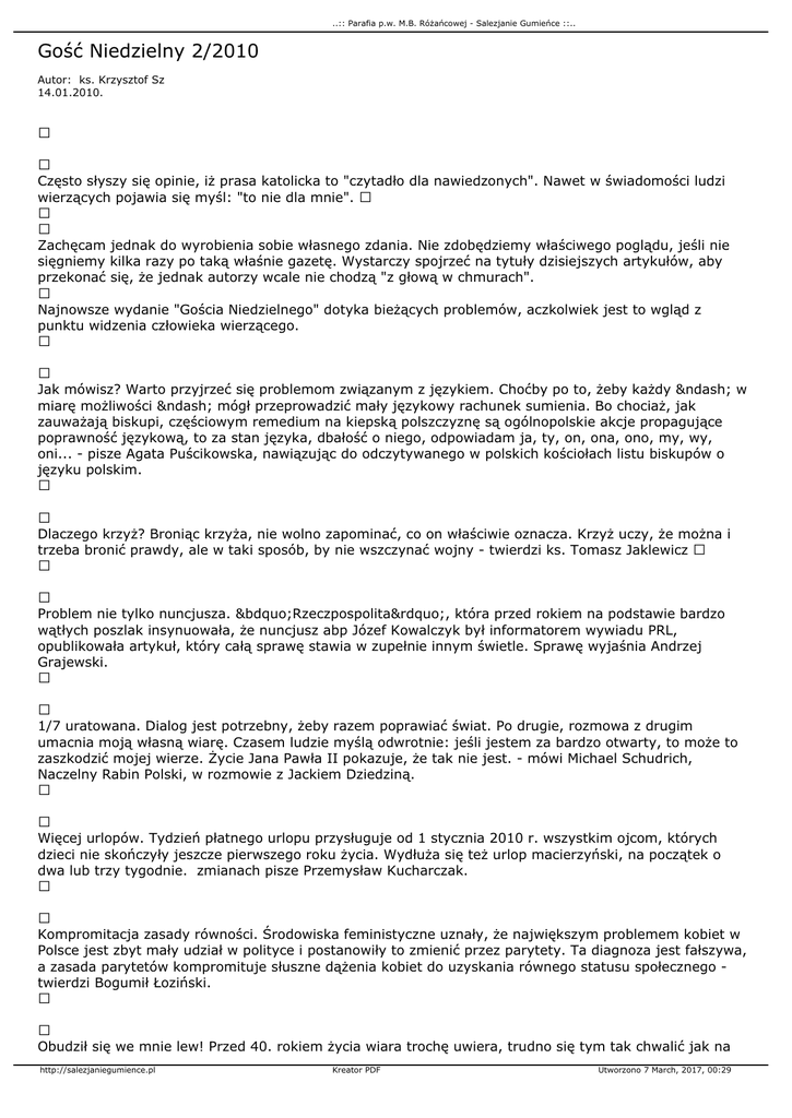 ..:: Parafia p.w. M.B. Różańcowej - Salezjanie Gumieńce ::.. Gość Niedzielny 2/2010 Autor: ks. Krzysztof Sz 14.01.2010. Często słyszy się opinie, iż prasa katolicka to "czytadło dla nawiedzonych". Nawet w świadomości ludzi wierzących pojawia się myśl: "to nie dla mnie". Zachęcam jednak do wyrobienia sobie własnego zdania. Nie zdobędziemy właściwego poglądu, jeśli nie sięgniemy kilka razy po taką właśnie gazetę. Wystarczy spojrzeć na tytuły dzisiejszych artykułów, aby przekonać się, że jednak autorzy wcale nie chodzą "z głową w chmurach". Najnowsze wydanie "Gościa Niedzielnego" dotyka bieżących problemów, aczkolwiek jest to wgląd z punktu widzenia człowieka wierzącego. Jak mówisz? Warto przyjrzeć się problemom związanym z językiem. Choćby po to, żeby każdy – w miarę możliwości – mógł przeprowadzić mały językowy rachunek sumienia. Bo chociaż, jak zauważają biskupi, częściowym remedium na kiepską polszczyznę są ogólnopolskie akcje propagujące poprawność językową, to za stan języka, dbałość o niego, odpowiadam ja, ty, on, ona, ono, my, wy, oni... - pisze Agata Puścikowska, nawiązując do odczytywanego w polskich kościołach listu biskupów o języku polskim. Dlaczego krzyż? Broniąc krzyża, nie wolno zapominać, co on właściwie oznacza. Krzyż uczy, że można i trzeba bronić prawdy, ale w taki sposób, by nie wszczynać wojny - twierdzi ks. Tomasz Jaklewicz Problem nie tylko nuncjusza. „Rzeczpospolita”, która przed rokiem na podstawie bardzo wątłych poszlak insynuowała, że nuncjusz abp Józef Kowalczyk był informatorem wywiadu PRL, opublikowała artykuł, który całą sprawę stawia w zupełnie innym świetle. Sprawę wyjaśnia Andrzej Grajewski. 1/7 uratowana. Dialog jest potrzebny, żeby razem poprawiać świat. Po drugie, rozmowa z drugim umacnia moją własną wiarę. Czasem ludzie myślą odwrotnie: jeśli jestem za bardzo otwarty, to może to zaszkodzić mojej wierze. Życie Jana Pawła II pokazuje, że tak nie jest. - mówi Michael Schudrich, Naczelny Rabin Polski, w rozmowie z Jackiem Dziedziną. Więcej urlopów. Tydzień płatnego urlopu przysługuje od 1 stycznia 2010 r. wszystkim ojcom, których dzieci nie skończyły jeszcze pierwszego roku życia. Wydłuża się też urlop macierzyński, na początek o dwa lub trzy tygodnie. zmianach pisze Przemysław Kucharczak. Kompromitacja zasady równości. Środowiska feministyczne uznały, że największym problemem kobiet w Polsce jest zbyt mały udział w polityce i postanowiły to zmienić przez parytety. Ta diagnoza jest fałszywa, a zasada parytetów kompromituje słuszne dążenia kobiet do uzyskania równego statusu społecznego twierdzi Bogumił Łoziński. Obudził się we mnie lew! Przed 40. rokiem życia wiara trochę uwiera, trudno się tym tak chwalić jak na http://salezjaniegumience.pl Kreator PDF Utworzono 7 March, 2017, 00:29 ..:: Parafia p.w. M.B. Różańcowej - Salezjanie Gumieńce ::.. przykład miłosnymi podbojami. Dorosłem, żeby mówić o tym głośno - mówi Krzysztof Ziemiec w rozmowie z Maciejem Gajkiem. Kraj nie tylko bin Ladena. Jemen nawet w świecie arabskim kojarzy się egzotycznie, dziwnie i zaściankowo. Skąd wzięli się tu terroryści i czy Jemenowi grozi wojna podobna do tej w Iraku i Afganistanie pisze Stanisław Guliński. Na zdrowie? Prezydent Obama podpisze wkrótce ustawę reformującą system opieki zdrowotnej USA. Ta reforma może nie wyjść Amerykanom na zdrowie. Dlaczego wyjaśnia ks. Tomasz Jaklewicz. Proszę wstać, sąd klika. Mamy w Polsce pierwszy sąd elektroniczny. Rozpatruje on najprostsze sprawy o zapłatę należności pieniężnych. Jak działa taki sąd opisuje Jarosław Dudała. Katolicy do podziemia! Pielgrzymi schodzą do podziemia. Modląc się na Mszy św. 135 metrów pod ziemią, wpatrują się w wykute w szarej bryle krucyfiksy i dziękują Temu, który słono zapłacił za nasze zbawienie. W Wieliczce otwarto właśnie pierwszy w Polsce podziemny szlak pielgrzymkowy. Przedstawia go Marcin Jakimowicz. Być jak yeti. Dobry sprzęt w górach nie wystarczy. Zimą potrzebna jest większa niż latem dawka zdrowego rozsądku. Zimą górskie szlaki – niby znane z letnich wypraw – potrafią zaskoczyć najwytrawniejszych górołazów. Jak przygotować się do zimowej wycieczki w góry, żeby niezapomniana wyprawa nie była ostatnią? Kiedy lepiej w ogóle zrezygnować radzi Jacek Dziedzina. Wieża do nieba. W Dubaju otwarto najwyższy budynek świata. Ma 828 metrów wysokości i kosztował 1,5 miliarda dolarów. Jak wygląda największy budynek świata? Co się w nim znajduje? Jak buduje się takie giganty i czy możemy liczyć na jeszcze wyżej? Między innymi na te pytania odpowiada Tomasz Rożek. Książki, które zmieniają. Demokracja bez wartości może przemienić się w jawny lub zakamuflowany totalitaryzm – przestrzegał przed laty Jan Paweł II. A wchodzące na polski rynek powieści kanadyjskiego pisarza Michaela D. O’Briena są niezwykle wciągającym literackim rozwinięciem tej papieskiej myśli - pisze Tomasz P. Terlikowski. Święty kąt. Supraśl śpi ukryty pod czapą śniegu. Ciszę przerywa rżenie koni brnących przez zaspy przed monasterem. „Odłóżmy na bok doczesne troski” – wołają cherubiny lecące ponad głowami zwiedzających niezwykłe Muzeum Ikon. Z bliska Muzeum Ikon w Supraśli przedstawia Marcin Jakimowicz. http://salezjaniegumience.pl Kreator PDF Utworzono 7 March, 2017, 00:29