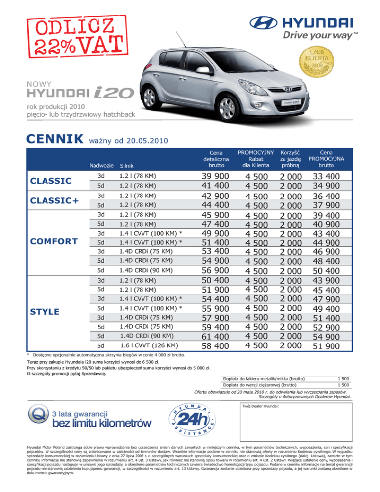 NOWY rok produkcji 2010 pięcio- lub trzydrzwiowy hatchback CENNIK Wersja wyposażenia CLASSIC CLASSIC+ COMFORT STYLE ważny od 20.05.2010 Silnik Nadwozie Silnik 3d 1.2 l (78 KM) 5d 1.2 l (78 KM) 3d 1.2 l (78 KM) 5d 1.2 l (78 KM) 3d 1.2 l (78 KM) 5d 1.2 l (78 KM) 3d 1.4 l CVVT (100 KM) * 5d 1.4 l CVVT (100 KM) * 3d 1.4D CRDi (75 KM) 5d 1.4D CRDi (75 KM) 5d 1.4D CRDi (90 KM) 3d 5d 1.2 l (78 KM) 3d 1.4 l CVVT (100 KM) * 5d 1.4 l CVVT (100 KM) * 3d 1.4D CRDi (75 KM) 5d 1.4D CRDi (75 KM) 5d 1.4D CRDi (90 KM) 5d 1.6 l CVVT (126 KM) 1.2 l (78 KM) Cena detaliczna brutto PROMOCYJNY Rabat dla Klienta Korzyść za jazdę próbną Cena PROMOCYJNA brutto 39 900 41 400 42 900 44 400 45 900 47 400 49 900 51 400 53 400 54 900 56 900 50 400 51 900 54 400 55 900 57 900 59 400 61 400 58 400 4 500 4 500 4 500 4 500 4 500 4 500 4 500 4 500 4 500 4 500 4 500 4 500 4 500 4 500 4 500 4 500 4 500 4 500 4 500 2 000 2 000 2 000 2 000 2 000 2 000 2 000 2 000 2 000 2 000 2 000 2 000 2 000 2 000 2 000 2 000 2 000 2 000 2 000 33 400 34 900 36 400 37 900 39 400 40 900 43 400 44 900 46 900 48 400 50 400 43 900 45 400 47 900 49 400 51 400 52 900 54 900 51 900 * Dostępne opcjonalnie automatyczna skrzynia biegów w cenie 4 000 zł brutto. Teraz przy zakupie Hyundaia i20 suma korzyści wynosi do 6 500 zł. Przy skorzystaniu z kredytu 50/50 lub pakietu ubezpieczeń suma korzyści wynosi do 5 000 zł. O szczegóły promocji pytaj Sprzedawcę. Dopłata do lakieru metalik/mikka (brutto) 1 500 Dopłata do wersji ciężarowej (brutto) 1 500 Oferta obowiązuje od 20 maja 2010 r. do odwołania lub wyczerpania zapasów. Szczegóły u Autoryzowanych Dealerów Hyundai. Twój Dealer Hyundai: Hyundai Motor Poland zastrzega sobie prawo wprowadzenia bez uprzedzenia zmian danych zawartych w niniejszym cenniku, w tym parametrów technicznych, wyposażenia, cen i specyfikacji pojazdów. W szczególności ceny są zróżnicowane w zależności od terminów dostaw. Wszelkie informacje podane w cenniku nie stanowią oferty w rozumieniu Kodeksu cywilnego. W wypadku sprzedaży konsumenckiej w rozumieniu Ustawy z dnia 27 lipca 2002 r. o szczególnych warunkach sprzedaży konsumenckiej oraz o zmianie Kodeksu cywilnego (dalej: Ustawa), zawarte w tym cenniku informacje nie stanowią zapewnienia w rozumieniu art. 4 ust. 3 Ustawy, jak również nie stanowią opisu towaru w rozumieniu art. 4 ust. 2 Ustawy. Wiążące ustalenie ceny, wyposażenia i specyfikacji pojazdu następuje w umowie jego sprzedaży, a określenie parametrów technicznych zawiera świadectwo homologacji typu pojazdu. Podane w cenniku informacje na temat gwarancji pojazdu nie stanowią udzielenia kupującemu gwarancji, w szczególności w rozumieniu art. 13 Ustawy. Gwarancja zostanie udzielona przy sprzedaży pojazdu, a jej warunki zostaną określone w dokumencie gwarancyjnym. NOWY WYPOSAŻENIE STANDARDOWE Classic Classic Plus Comfort Style + + + + + + + + + + + + + + + + + + + + + + + + + + + + + + + + + + + + + + + + + + + + + + + + + + + + + + + + + + + + + + + + + + + + + + + + + + + + + + + + + + + + + + + + + + + + + + + + + + + + + + + + + + + + + + + + + + + + + + + + + + + + + + + + + + + + BEZPIECZEŃSTWO Poduszki powietrzne kierowcy i pasażera oraz poduszki boczne Poduszki powietrzne kurtynowe Deaktywacja poduszki powietrznej pasażera System mocowania fotelików dziecięcych Pasy z napinaczami z czujnikiem obecności pasażerów z przodu i z tyłu ABS - System zapobiegający blokowaniu kół podczas hamowania ESP* EBD - System rozdziału siły hamowania Aktywne zagłówki przednich foteli KOMFORT Elektryczne wspomaganie układu kierowniczego (MDPS) Regulacja kierownicy w dwóch płaszczyznach Regulacja natężenia oświetlenia wskaźników Składana i asymetrycznie dzielona tylna kanapa Immobiliser Funkcja „łatwego wsiadania” dla wersji trzydrzwiowej Klimatyzacja manualna z funkcją chłodzenia schowka Zamek centralny z funkcją otwarcia drzwi w czasie kolizji Elektrycznie sterowane szyby przednich drzwi z funkcją Auto Down dla kierowcy Regulacja wysokości fotela kierowcy Elektrycznie regulowane lusterka boczne w kolorze nadwozia Przyciemniane szyby Klimatyzacja automatyczna z funkcją chłodzenia schowka Zdalne sterowanie zamkiem centralnym w kluczyku Elektrycznie sterowane szyby tylnych drzwi Elektrycznie sterowane szyby z funkcją bezpieczeństwa dla kierowcy Podgrzewane lusterka zewnętrzne Autoalarm ZEWNĘTRZNE Chlapacze Stalowe obręcze kół z oponami 175/70 R14 Tylna wycieraczka Zderzaki w kolorze nadwozia Klamki zewnętrzne i obudowy lusterek w kolorze nadwozia Stalowe obręcze kół z oponami 185/60 R15 Przednie lampy przeciwmgielne Grill przedni z elementami chromowanymi WEWNĘTRZNE Półka nad przestrzenią bagażową Oświetlenie przestrzeni bagażowej Kieszenie w drzwiach przednich Kieszeń w oparciu fotela pasażera Lusterka w osłonach przeciwsłonecznych Komputer pokładowy Lampki punktowe przednie Siatka ochronna w bagażniku Tapicerka materiałowa dwukolorowa (czerwona lub niebieska) Skórzana kierownica i gałka dźwigni zmiany biegów Wykończenie konsoli środkowej imitującej metal AUDIO Radio+CD z MP3 z wyświetlaczem 4 głośniki Wejście AUX Wejście USB Sterowanie systemem audio w kole kierownicy + + + + + + + + + + + * Wersje COMFORT i STYLE wyprodukowane przed marcem 2009 roku nie posiadają w wyposażeniu standardowym ESP (cena niższa o 2000 zł). WYPOSAŻENIE OPCJONALNE I AKCESORIA Dopłata za lakier metalik/mika 1 500 ESP (zawiera tylne tarcze hamulcowe) 2 000 Ceny brutto w PLN (nie zawierają montażu akcesoriów). W tabeli prezentowane są wybrane akcesoria. Więcej informacji u Autoryzowanych Dilerów Hyundai. NOWY DANE TECHNICZNE SILNIKI WYMIARY Długość / szerokość / wysokość całkowita (mm) Rozstaw osi (mm) Rozstaw kół przednich / tylnych (mm) Zwis nadwozia przedni / tylny (mm) Minimalny promień zawracania (m) Minimalny prześwit (mm) Pojemność bagażnika - VDA (l) 1.4 CVVT 100 KM 1.2 78 KM 1.4 CRDi 75 KM 1.4 CR