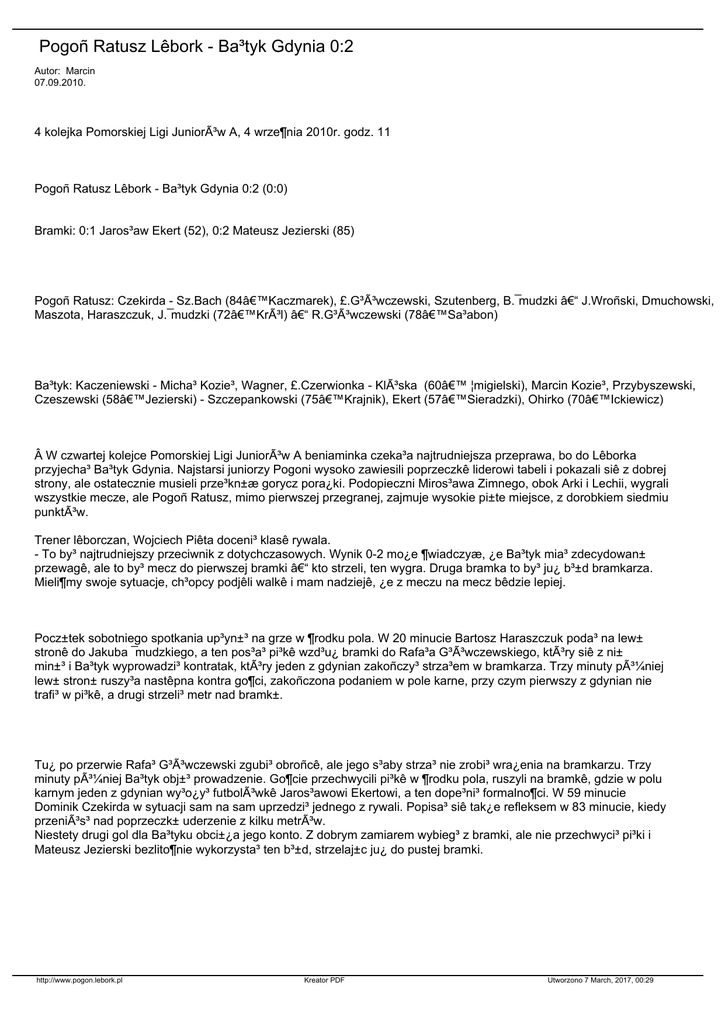 Pogoñ Ratusz Lêbork - Ba³tyk Gdynia 0:2 Autor: Marcin 07.09.2010. 4 kolejka Pomorskiej Ligi Juniorów A, 4 wrze¶nia 2010r. godz. 11 Pogoñ Ratusz Lêbork - Ba³tyk Gdynia 0:2 (0:0) Bramki: 0:1 Jaros³aw Ekert (52), 0:2 Mateusz Jezierski (85) Pogoñ Ratusz: Czekirda - Sz.Bach (84’Kaczmarek), £.G³Ã³wczewski, Szutenberg, B.¯mudzki – J.Wroñski, Dmuchowski, Maszota, Haraszczuk, J.¯mudzki (72’Król) – R.G³Ã³wczewski (78’Sa³abon) Ba³tyk: Kaczeniewski - Micha³ Kozie³, Wagner, £.Czerwionka - Klóska (60’ ¦migielski), Marcin Kozie³, Przybyszewski, Czeszewski (58’Jezierski) - Szczepankowski (75’Krajnik), Ekert (57’Sieradzki), Ohirko (70’Ickiewicz)  W czwartej kolejce Pomorskiej Ligi Juniorów A beniaminka czeka³a najtrudniejsza przeprawa, bo do Lêborka przyjecha³ Ba³tyk Gdynia. Najstarsi juniorzy Pogoni wysoko zawiesili poprzeczkê liderowi tabeli i pokazali siê z dobrej strony, ale ostatecznie musieli prze³kn±æ gorycz pora¿ki. Podopieczni Miros³awa Zimnego, obok Arki i Lechii, wygrali wszystkie mecze, ale Pogoñ Ratusz, mimo pierwszej przegranej, zajmuje wysokie pi±te miejsce, z dorobkiem siedmiu punktów. Trener lêborczan, Wojciech Piêta doceni³ klasê rywala. - To by³ najtrudniejszy przeciwnik z dotychczasowych. Wynik 0-2 mo¿e ¶wiadczyæ, ¿e Ba³tyk mia³ zdecydowan± przewagê, ale to by³ mecz do pierwszej bramki – kto strzeli, ten wygra. Druga bramka to by³ ju¿ b³±d bramkarza. Mieli¶my swoje sytuacje, ch³opcy podjêli walkê i mam nadziejê, ¿e z meczu na mecz bêdzie lepiej. Pocz±tek sobotniego spotkania up³yn±³ na grze w ¶rodku pola. W 20 minucie Bartosz Haraszczuk poda³ na lew± stronê do Jakuba ¯mudzkiego, a ten pos³a³ pi³kê wzd³u¿ bramki do Rafa³a G³Ã³wczewskiego, który siê z ni± min±³ i Ba³tyk wyprowadzi³ kontratak, który jeden z gdynian zakoñczy³ strza³em w bramkarza. Trzy minuty pó¼niej lew± stron± ruszy³a nastêpna kontra go¶ci, zakoñczona podaniem w pole karne, przy czym pierwszy z gdynian nie trafi³ w pi³kê, a drugi strzeli³ metr nad bramk±. Tu¿ po przerwie Rafa³ G³Ã³wczewski zgubi³ obroñcê, ale jego s³aby strza³ nie zrobi³ wra¿enia na bramkarzu. Trzy minuty pó¼niej Ba³tyk obj±³ prowadzenie. Go¶cie przechwycili pi³kê w ¶rodku pola, ruszyli na bramkê, gdzie w polu karnym jeden z gdynian wy³o¿y³ futbolówkê Jaros³awowi Ekertowi, a ten dope³ni³ formalno¶ci. W 59 minucie Dominik Czekirda w sytuacji sam na sam uprzedzi³ jednego z rywali. Popisa³ siê tak¿e refleksem w 83 minucie, kiedy przeniós³ nad poprzeczk± uderzenie z kilku metrów. Niestety drugi gol dla Ba³tyku obci±¿a jego konto. Z dobrym zamiarem wybieg³ z bramki, ale nie przechwyci³ pi³ki i Mateusz Jezierski bezlito¶nie wykorzysta³ ten b³±d, strzelaj±c ju¿ do pustej bramki. http://www.pogon.lebork.pl Kreator PDF Utworzono 7 March, 2017, 00:29