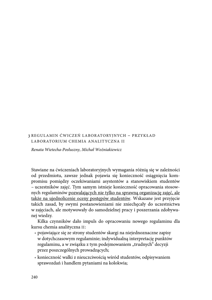 3 R E G U L A M I N Ć W IC Z E Ń L A B O R AT O RY J N YC H – P R Z Y K Ł A D L A B O R AT O R I UM C H E M IA A NA L I T YC Z NA I I Renata Wietecha-Posłuszny, Michał Woźniakiewicz Stawiane na ćwiczeniach laboratoryjnych wymagania różnią się w zależności od przedmiotu, zawsze jednak pojawia się konieczność osiągnięcia kompromisu pomiędzy oczekiwaniami asystentów a stanowiskiem studentów – uczestników zajęć. Tym samym istnieje konieczność opracowania stosownych regulaminów pozwalających nie tylko na sprawną organizację zajęć, ale także na ujednolicenie oceny postępów studentów. Wskazane jest przyjęcie takich zasad, by swymi postanowieniami nie zniechęcały do uczestnictwa w zajęciach, ale motywowały do samodzielnej pracy i poszerzania zdobywanej wiedzy. Kilka czynników dało impuls do opracowaniu nowego regulaminu dla kursu chemia analityczna II : • pojawiające się ze strony studentów skargi na niejednoznaczne zapisy w dotychczasowym regulaminie; indywidualną interpretację punktów regulaminu, a w związku z tym podejmowaniem „trudnych” decyzji przez poszczególnych prowadzących; • konieczność walki z nieuczciwością wśród studentów, odpisywaniem sprawozdań i handlem pytaniami na kolokwia; 240 • nadmierne obciążenie kadry dydaktycznej pracą o małej efektywności dydaktycznej, m.in. związaną z wielokrotną poprawą sprawozdań, a co za tym idzie potrzeba ukierunkowania i intensyfikacji konsultacji studentów z prowadzącymi ćwiczenia. Ze względu na wyżej wymienione problemy, w roku 2005 pracownicy Zakładu Chemii Analitycznej Wydziału Chemii UJ zdecydowali się na gruntowne zmiany w obowiązujących regulacjach.* W nowym regulaminie uszczegółowiono wszystkie obowiązujące studentów i asystentów zasady, a w szczególności te dotyczące: obecności na ćwiczeniach, formy kolokwiów wstępnych, struktury i przyjmowania raportów oraz oceny pracy studentów oraz otrzymywania zaliczeń. Nowy regulamin** wymógł również przygotowanie odpowiednio skonstruowanych instrukcji do ćwiczeń. Tak przygotowane zajęcia laboratoryjne po raz pierwszy zostały przeprowadzone w roku akademickim 2005/2006, a ich jakość oceniono za pomocą ankiety wypełnionej przez ok. 100 studentów. Ewaluacja wprowadzanych zmian była naturalną konsekwencją rzetelnego podejścia do istniejących problemów. Zaowocowało to dodatkowymi poprawkami regulaminu i jego obecną formą. Na końcu niniejszego rozdziału zacytowano wybrane, najważniejsze punkty regulaminu kursu Chemia analityczna II – laboratorium, do niektórych z nich dołączono komentarze autorów niniejszego rozdziału. W nowych zasadach szczególną uwagę zwrócono na metodykę oceny pracy studenta, wprowadzając w miejsce zwyczajowych i poprzednio stosowanych ocen za poszczególne ćwiczenia, punkty odpowiadające trzem kategoriom: • wiedzy – sprawdzonej w trakcie kolokwium wstępnego składającego z 4 spośród 12 znanych pytań (33% punktów przyznawanych za ćwiczenie), • aktywności w trakcie wykonania eksperymentu (punkty dodatkowe, 8%) • umiejętności opracowania wyników w formie raportu (67%). Raport ten opracowywany jest przez studenta według dokładnie opracowanej instrukcji, zawierającej uwagi edytorskie odnośnie tekstu, tabel i rysunków,*** zbliżone do ogólnych zasad obowiązujących przy pisaniu opracowań naukowych. Wyniki przeprowadzonej ankiety wykazują, że aż 79% ankietowanych oceło regulamin jako jasny i jednoznaczny. Poszczególne elementy, jakie w nim wprowadzono spowodowały aktywizację studentów zachęcając ich do wytężonego wysiłku. Przykładowo, rezygnacja z możliwości poprawy błędów ***Zmiany te dotyczyły zasad obowiązujących na zajęciach laboratoryjnych z zakresu analizy instrumentalnej prowadzonych dla III roku studentów chemii. ***Regulamin dostępny jest na stronie internetowej Wydziału Chemii Uniwersytetu Jagiellońskiego pod adresem: http://www.chemia.uj.edu.pl/chemanal/dydaktyka/anal2.html. ***Instrukcja przygotowania raportu z ćwiczenia http://www.chemia.uj.edu.pl/chemanal/dydaktyka/raport.pdf. 241 w raportach zdecydowanie zmobilizowała uczestników zajęć do zwrócenia większej uwagi na swoją pracę przed poddaniem jej ocenie asystenta (Rys. 1). Rys. 1. Wyniki ankiety ewaluacyjnej dotyczącej opinii studentów na temat raportów Fragmenty regulaminu kursu Chemia analityczna II – laboratorium z komentarzem §4 1. Do każdego ćwiczenia jest opracowana instrukcja zawierająca: a) szczegółowe zagadnienia teoretyczne, b) spis pozycji literaturowych na podstawie których student powinien przygotować się do ćwiczenia, […]. 2. Zagadnienia teoretyczne związane z tematem ćwiczenia spisane są w formie 12 konkretnych pytań, na które student, na podstawie podanej literatury, powinien umieć odpowiedzieć, przystępując do danego ćwiczenia. Wszystkie instrukcje są umieszczone w formacie PDF na stronie internetowej […]. Komentarz: Usystematyzowanie i ścisłe sprecyzowanie wymagań pozwoliło ujednolicić formę wszystkich instrukcji do poszczególnych ćwiczeń, jak również usprawnić pracę studenta, który wie z jakiej literatury ma korzystać. Spis pozycji literatury przedmiotu również doprecyzowano, dbając by wskazane pozycje były dostępne w bibliotece wydziałowej oraz obejmowały faktycznie źródła konieczne i w miarę możliwości nowe. Instrukcja zawiera też 12 pytań, z których 3 na pewno wylosuje student na kolokwium wstępnym. Odpowiedzi na nie nie znajdują się bezpośrednio w instrukcji, zachęcając tym samym do zapoznania się z innymi źródłami. Jednocześnie studenci, dysponując konkretnymi wskazówkami, skupiają się na nauce tych zagadnień, które są istotne z punktu widzenia celów kursu. 242 W przypadku braku ogólnodostępnego skryptu do ćwiczeń laboratoryjnych, korzystne jest umieszczenie instrukcji na stronach www. Stosowany w poprzednim roz
