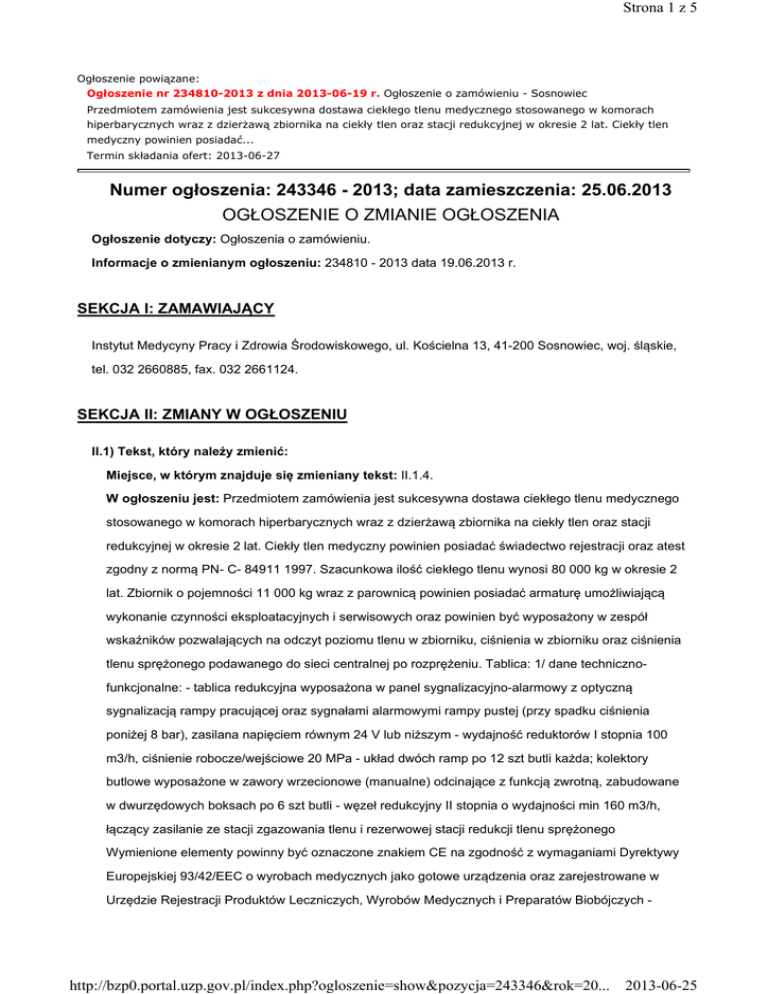 Strona 1 z 5 Ogłoszenie powiązane: Ogłoszenie nr 234810-2013 z dnia 2013-06-19 r. Ogłoszenie o zamówieniu - Sosnowiec Przedmiotem zamówienia jest sukcesywna dostawa ciekłego tlenu medycznego stosowanego w komorach hiperbarycznych wraz z dzierżawą zbiornika na ciekły tlen oraz stacji redukcyjnej w okresie 2 lat. Ciekły tlen medyczny powinien posiadać... Termin składania ofert: 2013-06-27 Numer ogłoszenia: 243346 - 2013; data zamieszczenia: 25.06.2013 OGŁOSZENIE O ZMIANIE OGŁOSZENIA Ogłoszenie dotyczy: Ogłoszenia o zamówieniu. Informacje o zmienianym ogłoszeniu: 234810 - 2013 data 19.06.2013 r. SEKCJA I: ZAMAWIAJĄCY Instytut Medycyny Pracy i Zdrowia Środowiskowego, ul. Kościelna 13, 41-200 Sosnowiec, woj. śląskie, tel. 032 2660885, fax. 032 2661124. SEKCJA II: ZMIANY W OGŁOSZENIU II.1) Tekst, który należy zmienić: Miejsce, w którym znajduje się zmieniany tekst: II.1.4. W ogłoszeniu jest: Przedmiotem zamówienia jest sukcesywna dostawa ciekłego tlenu medycznego stosowanego w komorach hiperbarycznych wraz z dzierżawą zbiornika na ciekły tlen oraz stacji redukcyjnej w okresie 2 lat. Ciekły tlen medyczny powinien posiadać świadectwo rejestracji oraz atest zgodny z normą PN- C- 84911 1997. Szacunkowa ilość ciekłego tlenu wynosi 80 000 kg w okresie 2 lat. Zbiornik o pojemności 11 000 kg wraz z parownicą powinien posiadać armaturę umożliwiającą wykonanie czynności eksploatacyjnych i serwisowych oraz powinien być wyposażony w zespół wskaźników pozwalających na odczyt poziomu tlenu w zbiorniku, ciśnienia w zbiorniku oraz ciśnienia tlenu sprężonego podawanego do sieci centralnej po rozprężeniu. Tablica: 1/ dane technicznofunkcjonalne: - tablica redukcyjna wyposażona w panel sygnalizacyjno-alarmowy z optyczną sygnalizacją rampy pracującej oraz sygnałami alarmowymi rampy pustej (przy spadku ciśnienia poniżej 8 bar), zasilana napięciem równym 24 V lub niższym - wydajność reduktorów I stopnia 100 m3/h, ciśnienie robocze/wejściowe 20 MPa - układ dwóch ramp po 12 szt butli każda; kolektory butlowe wyposażone w zawory wrzecionowe (manualne) odcinające z funkcją zwrotną, zabudowane w dwurzędowych boksach po 6 szt butli - węzeł redukcyjny II stopnia o wydajności min 160 m3/h, łączący zasilanie ze stacji zgazowania tlenu i rezerwowej stacji redukcji tlenu sprężonego Wymienione elementy powinny być oznaczone znakiem CE na zgodność z wymaganiami Dyrektywy Europejskiej 93/42/EEC o wyrobach medycznych jako gotowe urządzenia oraz zarejestrowane w Urzędzie Rejestracji Produktów Leczniczych, Wyrobów Medycznych i Preparatów Biobójczych - http://bzp0.portal.uzp.gov.pl/index.php?ogloszenie=show&pozycja=243346&rok=20... 2013-06-25 Strona 2 z 5 wykonawca powinien potwierdzić to odpowiednimi dokumentami w ofercie. Układ połączeń zgodnie z PN-EN 7396-1 Systemy rurociągowe do gazów medycznych - Część I: Systemy rurociągowe do sprężonych gazów medycznych i próżni na schemacie. 2 wymagania odnośnie wykonawcy: Zgodnie z Ustawą o Wyrobach Medycznych z dnia 20.05.2010 (Dz.U. nr 93 poz. 676 z 2010r.) oraz Dyrektywą Europejską 93/42/EEC o wyrobach medycznych i Rozporządzeniem Ministra Zdrowia z dnia 30.04.2004 (Dz.U. nr 100 poz. 1027 §3) System rurociągowy do gazów medycznych jest wyrobem medycznym klasy IIb (reguła 2.9.11.12), i jak każdy wyrób medyczny, aby mógł być wprowadzony do użytkowania, zgodnie art. 11 Ustawy o Wyrobach Medycznych powinien być oznaczony znakiem CE i zgodnie z art. 58 Ustawy o Wyrobach Medycznych musi wpisany do Rejestru Produktów Leczniczych, Wyrobów Medycznych i Preparatów Biobójczych. Dostawa i montaż tablicy wraz z uruchomieniem nastąpi w ciągu 7 dni od dnia podpisania umowy. Zbiornik Ze względu na aktualne warunki dojazdowe i budowlane (posiadany fundament) oraz szacowane zużycie wraz z projektem stacji redukcji tlenu (jej wydajnością), w odniesieniu do szacowanego zużycia - zamawiający wymaga następujące parametry zbiornika: Maksymalne ciśnienie robocze 8 bar Pojemność geometryczna (w litrach)11 000 - 12 000 Maksymalna średnica (w mm) 2 100 Maksymalna szerokość z armaturą (w mm) 2 600 Maksymalna wysokość (w mm) 7 300 Ciężar napełnionego zbiornika (w kg) 19 000 Maksymalne odparowanie własne (% / 24 h) 0,30 Dostawa i montaż zbiornika wraz z uruchomieniem w ciągu 7 dni od dnia podpisania umowy. Dostawy tlenu będą następowały na podstawie zamówienia telefonicznego lub zamówienia przesłanego faksem, ze zwrotnym potwierdzeniem realizacji zamówienia. Zamówienie będzie następować z wyprzedzeniem przynajmniej 3 dni roboczych. Przy każdej dostawie kierowca Wykonawcy zobowiązany jest do przekazania atestu na tlen medyczny upoważnionemu pracownikowi Zamawiającego. Wykonawca zobowiązany jest do przekazania w formie pisemnej instrukcji obsługi zainstalowanych urządzeń i bezpłatnego przeszkolenia pracowników Zamawiającego w zakresie obsługi w/w urządzeń. wykonawca dostarczy wykaz niezbędnych czynności, przeglądów i remontów okresowych wykonywanych przez wykonawcę w trakcie przewidzianego czasu eksploatacji. W poszczególnych elementach kosztowych oferty, Wykonawca powinien zawrzeć wszelkie koszty związane z: 1.Opracowaniem dokumentacji technicznej we właściwej formie i treści oraz uzgodnioną przez odpowiednich rzeczoznawców zgodnie z obowiązującym Prawem Budowlanym 2.Posadowieniem, montażem oraz podłączeniem zbiornika do istniejącej instalacji tlenu medycznego w odległości do 20 m. 3.Wykonaniem wszelkich napraw, regulacji, konserwacji oraz czynności odbiorowych. 4.Demontażem urządzeń oraz ich transportem do magazynu Wykonawcy po zakończeniu okresu trwania umowy. Pozostałe wymagania: 1. Wykonawca zobowiązany jest do sporządzenia odpowiedniej dokumentacji technicznej i przekazania jej Zamawiającemu najpóźniej w dniu podpisania umowy. 2. Wykonawca zainstaluje zbiornik w terminie do 7 dni od dnia po