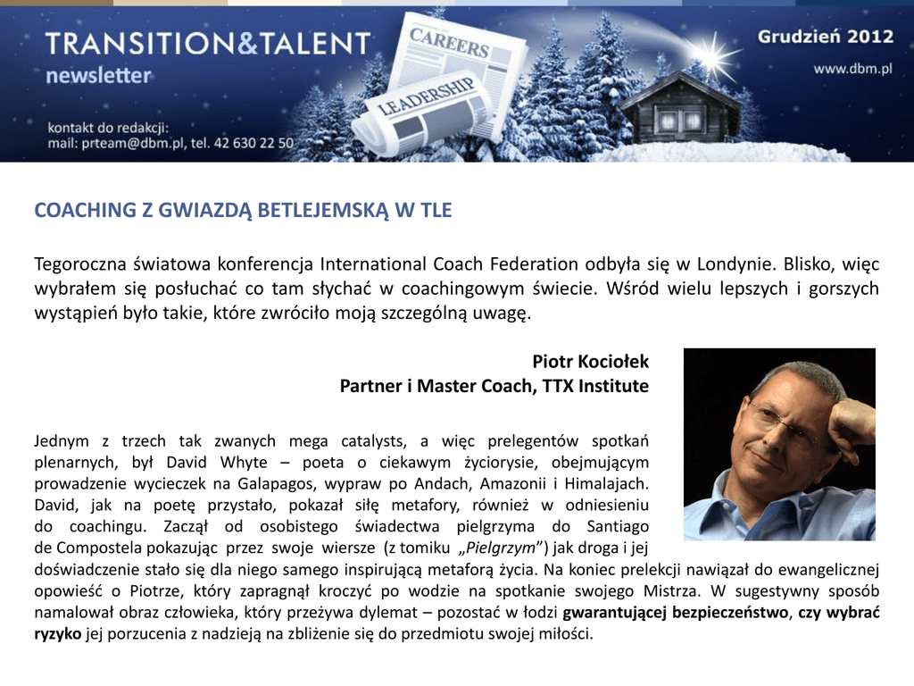 PAŹDZIERNIK 2012 COACHING Z GWIAZDĄ BETLEJEMSKĄ W TLE Tegoroczna światowa konferencja International Coach Federation odbyła się w Londynie. Blisko, więc wybrałem się posłuchać co tam słychać w coachingowym świecie. Wśród wielu lepszych i gorszych wystąpień było takie, które zwróciło moją szczególną uwagę. Piotr Kociołek Partner i Master Coach, TTX Institute Jednym z trzech tak zwanych mega catalysts, a więc prelegentów spotkań plenarnych, był David Whyte – poeta o ciekawym życiorysie, obejmującym prowadzenie wycieczek na Galapagos, wypraw po Andach, Amazonii i Himalajach. David, jak na poetę przystało, pokazał siłę metafory, również w odniesieniu do coachingu. Zaczął od osobistego świadectwa pielgrzyma do Santiago de Compostela pokazując przez swoje wiersze (z tomiku „Pielgrzym”) jak droga i jej doświadczenie stało się dla niego samego inspirującą metaforą życia. Na koniec prelekcji nawiązał do ewangelicznej opowieść o Piotrze, który zapragnął kroczyć po wodzie na spotkanie swojego Mistrza. W sugestywny sposób namalował obraz człowieka, który przeżywa dylemat – pozostać w łodzi gwarantującej bezpieczeństwo, czy wybrać ryzyko jej porzucenia z nadzieją na zbliżenie się do przedmiotu swojej miłości. Abstrahując od samej metafory, z pewnością wartej zastosowania przez niejednego coacha zajmującego się tzw. life coachingiem, uderzyła mnie odwaga Davida w czerpaniu z inspiracji biblijnych. O ile mądrości i religie Wschodu na dobre zadomowiły się w świecie coachów, o tyle odwołania do mądrości i religii Zachodu są traktowane z zażenowaniem, często jako wyraz prozelityzmu (nawracania innych na swoją wiarę) lub politycznej niepoprawności. Przyznam, że zawsze takie podejście do własnej spuścizny przypominało mi jako żywo sięganie lewą ręką do prawego ucha – mając tu, na miejscu, w Europie takie bogactwo myśli, metafor i inspiracji, przywykliśmy uznawać, że jedynie cytaty z hinduskich ksiąg, mędrców Zen lub Konfucjusza (z całym szacunkiem dla nich) są warte refleksji i odniesienia do własnego życia. Tymczasem jeśli się dobrze poszuka, to zauważymy, iż mieliśmy w Europie naprawdę wybitnych „coachów”, pracujących metodami na wskroś coachingowymi już w średniowieczu. Za przykład niech posłuży następujące odkrycie. Niedawno uczestniczyłem w szkoleniu certyfikacyjnym z metody, która między innymi zaleca coachowi stosowanie tzw. truth talk (odważne powiedzenie prawdy klientowi) jako jedną z praktyk coachingowych. Od razu skojarzyła mi się ta praktyka z cytatem z pewnej niechcianej przez nikogo książeczki, kupionej na jakiejś wyprzedaży za, wielce symboliczną w omawianym kontekście, złotówkę. Dziełko napisane przez św. Bernarda z Clairvaux, mnicha żyjącego na przełomie XI i XII wieku zatytułowane „O rozważaniu”. Bernard napisał je dla ówczesnego menedżera i polityka wysokiego szczebla, a mianowicie dla papieża Eugeniusza III, swojego wcześniejszego wychowanka i współbrata zresztą. Swoje wywody zaczął od krótkiego, acz niezwykle klarowanego wyjaśnienia czterech cnót kardynalnych (dziś rzeklibyśmy – modelu kompetencyjnego lidera). źródło: sxc.hu źródło: sxc.hu Nawiązując do nich poruszył odważnie temat osobistej produktywności klienta - „Spalasz się niepotrzebnie w swych głupich zajęciach, które nie są niczym innym, jak udręką ducha, zubożeniem umysłu i marnowaniem łaski Bożej! I jakie są owoce Twych zajęć? Czyż znaczą więcej niż sieć pajęcza?”. Następnie wskazał na wagę inteligencji emocjonalnej - „Serce twarde to serce, które Boga się nie boi i ludzi ma za nic. Dziwisz się, że coś podobnego może Ci się przydarzyć? Zapewniam Cię, że może, gdy złe przyzwyczajenie, jak to zwykle bywa, pozbawi człowieka wrażliwości.”. Podkreślił znaczenie refleksji strategicznej - „Jeśli całe swe życie, całe myślenie poświęcisz działaniu, niczego nie zostawiając na rozważanie - czy mogę to pochwalić? Nie mogę!”, aby zakończyć mocnym akordem sławiącym wartość informacji zwrotnej w rozwoju menedżera - „Głupi król na tronie, to jak małpa na dachu. A teraz posłuchaj mojego gadania: nie będzie ono zbyt miłe, ale może się okazać dla Ciebie pożyteczne. Potworna to rzecz połączenia najwyższego wyniesienia i pospolitego umysłu; pierwszej godności i życia nikczemnego; języka wielomównego i ręki leniwej; oblicza poważnego i czynów lekkomyślnych; wdzięku słów i skutków żadnych; olbrzymiej władzy i niezrównoważenia. Podsunąłem lustro: niechże w nim przejrzy się każda twarz szkaradna. Ty zaś ciesz się, jeśli Twoja nie będzie do niej podobna.”. Hmm… Niejednemu dzisiejszemu, nawet wielokrotnie certyfikowanemu, coachowi zadrżałby głos. No cóż, może warto w ten zbliżający się czas Bożego Narodzenia, sięgnąć do mądrości i inspiracji tego czasu, tej, dla jednych prawdy, dla innych tradycji, mówiącej o tym, co nam bliskie, co upragnione, ku czemu podążamy by odnaleźć spełnienie – menedżerskie, zawodowe, rodzinne, osobiste…