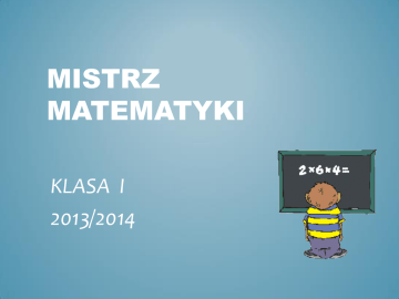 MISTRZ MATEMATYKI KLASA I 2013/2014 „Mistrz Matematyki” to konkurs matematyczny uczniów klas I – III z województwa dolnośląskiego. Konkurs jak co roku organizuje Zespół Szkolno – Przedszkolny w Bardzie. Cele konkursu to: - rozwijanie i pogłębianie zainteresowań i uzdolnień matematycznych, - promowanie dorobku i osiągnięć uczniów, - kształtowanie i rozwijanie samodzielnego myślenia, - nawiązywanie nowych przyjaźni. Konkurs prowadzony jest w trzech grupach wiekowych: - kwadraty – klasy I - prostokąty – klasy II - trójkąty – klasy III. W tym roku w pierwszym etapie klasowym wyłoniono 4 uczniów: - Julkę Grochowinę - Zuzannę Medyńską - Kaję Olbert - Kingę Dwornicką. O berło zwycięstwa dzielnie walczyli także chłopcy - Filip Nosow i Mateusz Sobieszczański. Drugi etap wyłonił zwycięzcę. Jest nim Julka Grochowina, która będzie reprezentowała klasę 27 kwietnia w Bardzie na etapie wojewódzkim. Szkołę reprezentować będą zwycięscy etapów klasowych: - Julka Grochowina, klasa I - Amelia Umer, klasa II - Wiktoria Grochowina, klasa III. Gratulujemy!!! Życzymy dalszych sukcesów!