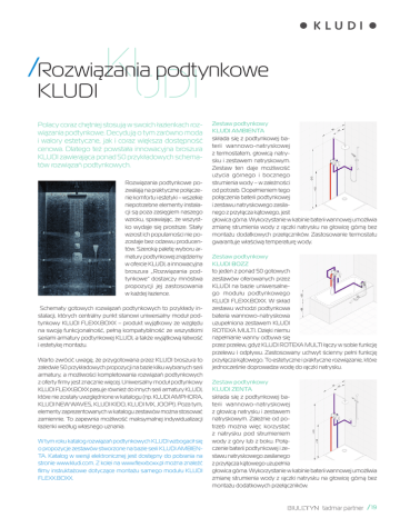 KL KLUDI UDI / Rozwiązania podtynkowe Polacy coraz chętniej stosują w swoich łazienkach rozwiązania podtynkowe. Decydują o tym zarówno moda i walory estetyczne, jak i coraz większa dostępność cenowa. Dlatego też powstała innowacyjna broszura KLUDI zawierająca ponad 50 przykładowych schematów rozwiązań podtynkowych. Rozwiązania podtynkowe pozwalają na praktyczne połączenie komfortu i estetyki – wszelkie niepotrzebne elementy instalacji są poza zasięgiem naszego wzroku, sprawiając, że wszystko wydaje się prostsze. Stały wzrost ich popularności nie pozostaje bez odzewu producentów. Szeroką paletę wyboru armatury podtynkowej znajdziemy w ofercie KLUDI, a innowacyjna broszura „Rozwiązania podtynkowe” dostarczy mnóstwa propozycji jej zastosowania w każdej łazience. Schematy gotowych rozwiązań podtynkowych to przykłady instalacji, których centralny punkt stanowi uniwersalny moduł podtynkowy KLUDI FLEXX.BOXX – produkt wyjątkowy ze względu na swoją funkcjonalność, pełną kompatybilność ze wszystkimi seriami armatury podtynkowej KLUDI, a także wyjątkową łatwość i estetykę montażu. Warto zwrócić uwagę, że przygotowana przez KLUDI broszura to zaledwie 50 przykładowych propozycji na bazie kilku wybranych serii armatury, a możliwości kompletowania rozwiązań podtynkowych z oferty firmy jest znacznie więcej. Uniwersalny moduł podtynkowy KLUDI FLEXX.BOXX pasuje również do innych serii armatury KLUDI, które nie zostały uwzględnione w katalogu (np. KLUDI AMPHORA, KLUDI NEW WAVES, KLUDI KIDO, KLUDI MX, JOOP!). Poza tym, elementy zaprezentowanych w katalogu zestawów można stosować zamiennie. To zapewnia możliwość maksymalnej indywidualizacji łazienki według własnego uznania. W tym roku katalog rozwiązań podtynkowych KLUDI wzbogacił się o propozycje zestawów stworzone na bazie serii KLUDI AMBIENTA. Katalog w wersji elektronicznej jest dostępny do pobrania na stronie www.kludi.com. Z kolei na www.flexxboxx.pl można znaleźć filmy instruktażowe dotyczące montażu samego modułu KLUDI FLEXX.BOXX. Zestaw podtynkowy KLUDI AMBIENTA składa się z podtynkowej baterii wannowo-natryskowej z termostatem, głowicą natrysku i zestawem natryskowym. Zestaw ten daje możliwość użycia górnego i bocznego strumienia wody – w zależności od potrzeb. Dopełnieniem tego połączenia baterii podtynkowej i zestawu natryskowego zasilanego z przyłącza kątowego, jest głowica górna. Wykorzystanie w kabinie baterii wannowej umożliwia zmianę strumienia wody z rączki natrysku na głowicę górną bez montażu dodatkowych przełączników. Zastosowanie termostatu gwarantuje właściwą temperaturę wody. Zestaw podtynkowy KLUDI BOZZ to jeden z ponad 50 gotowych zestawów oferowanych przez KLUDI na bazie uniwersalnego modułu podtynkowego KLUDI FLEXX.BOXX. W skład zestawu wchodzi podtynkowa bateria wannowo-natryskowa uzupełniona zestawem KLUDI ROTEXA MULTI. Dzięki niemu napełnianie wanny odbywa się przez przelew, gdyż KLUDI ROTEXA MULTI łączy w sobie funkcję przelewu i odpływu. Zastosowany uchwyt ścienny pełni funkcję przyłącza kątowego. To estetyczne i praktyczne rozwiązanie, które jednocześnie doprowadza wodę do rączki natrysku. Zestaw podtynkowy KLUDI ZENTA składa się z podtynkowej baterii wannowo-natryskowej z głowicą natrysku i zestawem natryskowym. Zależnie od potrzeb można więc korzystać z natrysku pod strumieniem wody z góry lub z boku. Połączenie baterii podtynkowej i zestawu natryskowego zasilanego z przyłącza kątowego uzupełnia głowica górna. Wykorzystanie w kabinie baterii wannowej umożliwia zmianę strumienia wody z rączki natrysku na głowicę górną bez montażu dodatkowych przełączników. tadmar partner / 19