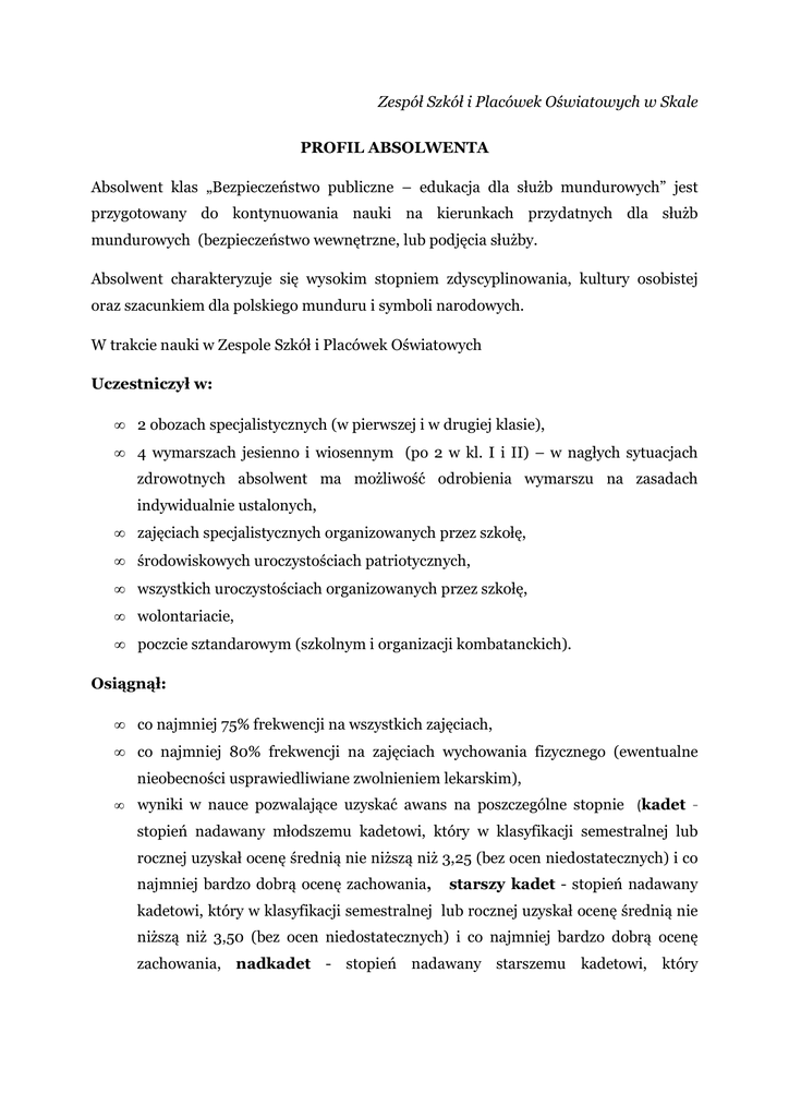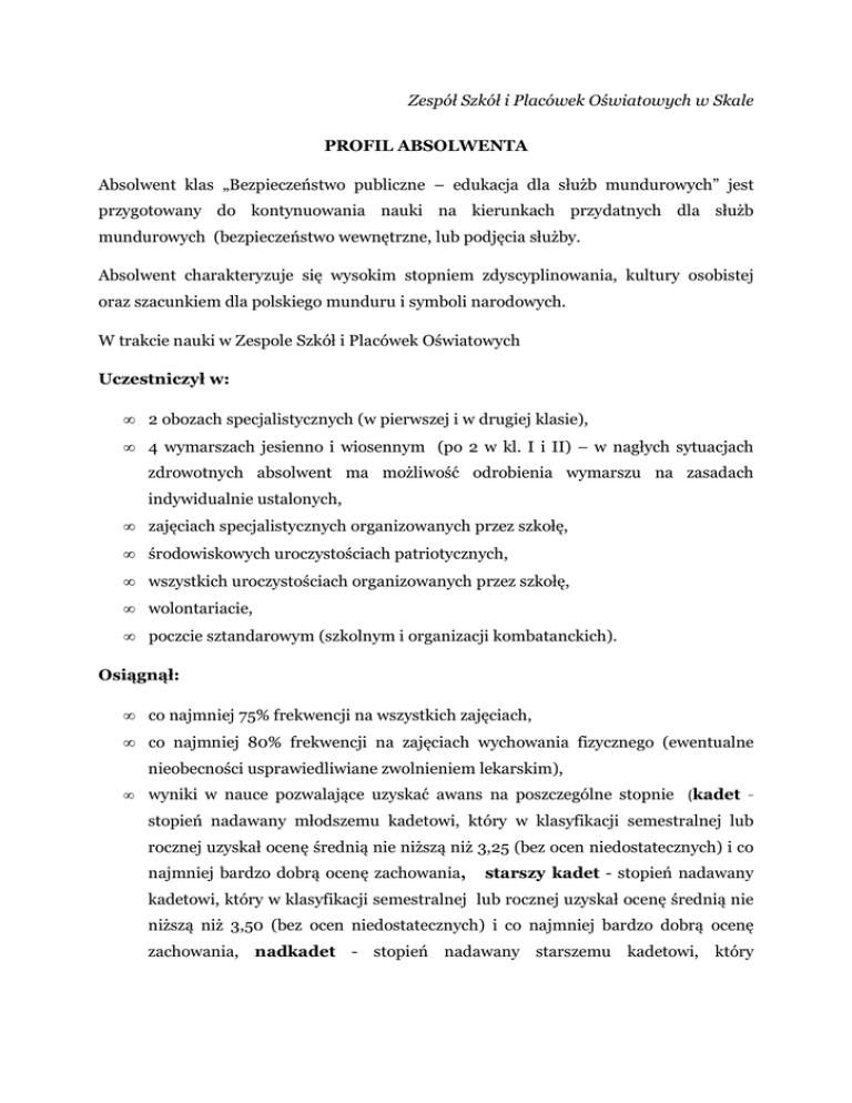 Zespół Szkół i Placówek Oświatowych w Skale PROFIL ABSOLWENTA Absolwent klas „Bezpieczeństwo publiczne – edukacja dla służb mundurowych” jest przygotowany do kontynuowania nauki na kierunkach przydatnych dla służb mundurowych (bezpieczeństwo wewnętrzne, lub podjęcia służby. Absolwent charakteryzuje się wysokim stopniem zdyscyplinowania, kultury osobistej oraz szacunkiem dla polskiego munduru i symboli narodowych. W trakcie nauki w Zespole Szkół i Placówek Oświatowych Uczestniczył w: • 2 obozach specjalistycznych (w pierwszej i w drugiej klasie), • 4 wymarszach jesienno i wiosennym (po 2 w kl. I i II) – w nagłych sytuacjach zdrowotnych absolwent ma możliwość odrobienia wymarszu na zasadach indywidualnie ustalonych, • zajęciach specjalistycznych organizowanych przez szkołę, • środowiskowych uroczystościach patriotycznych, • wszystkich uroczystościach organizowanych przez szkołę, • wolontariacie, • poczcie sztandarowym (szkolnym i organizacji kombatanckich). Osiągnął: • co najmniej 75% frekwencji na wszystkich zajęciach, • co najmniej 80% frekwencji na zajęciach wychowania fizycznego (ewentualne nieobecności usprawiedliwiane zwolnieniem lekarskim), • wyniki w nauce pozwalające uzyskać awans na poszczególne stopnie (kadet stopień nadawany młodszemu kadetowi, który w klasyfikacji semestralnej lub rocznej uzyskał ocenę średnią nie niższą niż 3,25 (bez ocen niedostatecznych) i co najmniej bardzo dobrą ocenę zachowania, starszy kadet - stopień nadawany kadetowi, który w klasyfikacji semestralnej lub rocznej uzyskał ocenę średnią nie niższą niż 3,50 (bez ocen niedostatecznych) i co najmniej bardzo dobrą ocenę zachowania, nadkadet - stopień nadawany starszemu kadetowi, który Zespół Szkół i Placówek Oświatowych w Skale w klasyfikacji semestralnej lub rocznej uzyskał ocenę średnią nie niższą niż 3,50 (bez ocen niedostatecznych) i co najmniej bardzo dobrą ocenę zachowania, kadet z klasą – stopień nadawany nadkadetowi, który w klasyfikacji semestralnej lub rocznej uzyskał ocenę średnią nie niższą niż 3,50 (bez ocen niedostatecznych) i co najmniej bardzo dobrą ocenę z zachowania W klasach edukacji pożarniczej odpowiednio: młodszy kadet strażak, kadet strażak, starszy kadet strażak, nadkadet strażak, kadet strażak z klasą, • certyfikaty z pływania, pierwszej pomocy, strzelania i samoobrony. Zna: • zasady organizacyjne służb mundurowych, • kryteria rekrutacji do służb mundurowych, • tradycje wojska polskiego, • zna historię, kulturę, tradycję narodową, • języki obce, umieć posługiwać się nimi na poziomie komunikatywnym, • mocne i słabe strony swojej osobowości, umie je wykorzystywać i korygować • istotę i metody samokształcenia. Potrafi: • w środowisku społecznym prezentować najwyższe wartości moralne i obyczajowe, być wzorem kultury osobistej i dobrego wychowania, • otaczać szczególną czcią godło, barwy narodowe i hymn państwowy, szanować mundur wojskowy, który uosabia uświęcone tradycją wartości oręża polskiego, • respektować normy prawne i społeczne, szanować instytucje państwa i społeczeństwa, • porozumiewać się i współpracować z innymi, • dokonywać wyborów i ponosić ich konsekwencje, • rozwiązywać konflikty, negocjować, zawierać kompromisy, • posługiwać się nowoczesnymi środkami multimedialnymi. Absolwent, który nie spełnia kryteriów zawartych w profilu nie uzyska na świadectwie wpisu o realizacji innowacji pedagogicznej „Edukacja dla służb mundurowych”, a w skrajnych wypadkach może zostać przeniesiony do klasy nie realizującej innowacji.
