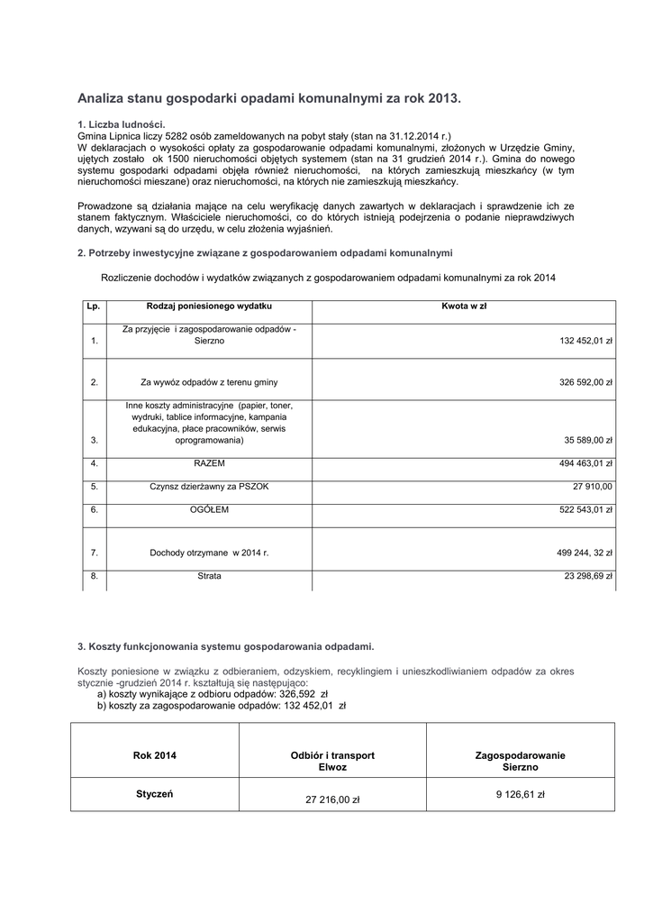 Analiza stanu gospodarki opadami komunalnymi za rok 2013. 1. Liczba ludności. Gmina Lipnica liczy 5282 osób zameldowanych na pobyt stały (stan na 31.12.2014 r.) W deklaracjach o wysokości opłaty za gospodarowanie odpadami komunalnymi, złożonych w Urzędzie Gminy, ujętych zostało ok 1500 nieruchomości objętych systemem (stan na 31 grudzień 2014 r.). Gmina do nowego systemu gospodarki odpadami objęła również nieruchomości, na których zamieszkują mieszkańcy (w tym nieruchomości mieszane) oraz nieruchomości, na których nie zamieszkują mieszkańcy. Prowadzone są działania mające na celu weryfikację danych zawartych w deklaracjach i sprawdzenie ich ze stanem faktycznym. Właściciele nieruchomości, co do których istnieją podejrzenia o podanie nieprawdziwych danych, wzywani są do urzędu, w celu złożenia wyjaśnień. 2. Potrzeby inwestycyjne związane z gospodarowaniem odpadami komunalnymi Rozliczenie dochodów i wydatków związanych z gospodarowaniem odpadami komunalnymi za rok 2014 Lp. Rodzaj poniesionego wydatku Kwota w zł 1. Za przyjęcie i zagospodarowanie odpadów Sierzno 132 452,01 zł 2. Za wywóz odpadów z terenu gminy 326 592,00 zł 3. Inne koszty administracyjne (papier, toner, wydruki, tablice informacyjne, kampania edukacyjna, płace pracowników, serwis oprogramowania) 35 589,00 zł 4. RAZEM 494 463,01 zł 5. Czynsz dzierżawny za PSZOK 6. OGÓŁEM 522 543,01 zł 7. Dochody otrzymane w 2014 r. 499 244, 32 zł 8. Strata 27 910,00 23 298,69 zł 3. Koszty funkcjonowania systemu gospodarowania odpadami. Koszty poniesione w związku z odbieraniem, odzyskiem, recyklingiem i unieszkodliwianiem odpadów za okres stycznie -grudzień 2014 r. kształtują się następująco: a) koszty wynikające z odbioru odpadów: 326,592 zł b) koszty za zagospodarowanie odpadów: 132 452,01 zł Rok 2014 Styczeń Odbiór i transport Elwoz 27 216,00 zł Zagospodarowanie Sierzno 9 126,61 zł Luty 27 216,00 zł 9 411,11 zł Marzec 27 216,00 zł 10 455,60 zł Kwiecień 27 216,00 zł 9 774,86 zł Maj 27 216,00 zł 10 928,88 zł Czerwiec 27 216,00 zł 9 971,57 zł Lipiec 27 216,00 zł 11 948,98 zł Sierpień 27 216,00 zł 12 706,26 zł Wrzesień 27 216,00 zł 12 830,99 zł Październik 27 216,00 zł 13 841,34 zł Listopad 27 216,00 zł 11 185,51 zł Grudzień 27 216,00 zł 10 270,30 zł (płatność dokonano w roku 2015) Ogółem 326 592,00 zł 132 452,01 zł 4. Ilość odpadów odebranych z terenu gminy Lipnica w okresie I-XII 2014 r.: Miesiąc Odpady zmiesza ne Tworzyw a sztuczne Szkło Styczeń 29,20 Mg 6,14 mg 18,78 Mg Luty 27,34 Mg 7,78 Mg Marzec 32,58 Mg Kwiecień Popiół Odpady wielkogabar ytowe Papier i tektura Odpady nieulegające biodegradacji 20 02 03 7,08 Mg - - 1,04 Mg 20 01 36 – zużyte urządzenia elektryczne i elektroniczne ... - - 13,38 Mg - - - - 10,40 Mg 10,96 Mg 6,74 Mg - 2,4 Mg 5,1 Mg - 31,42 Mg 14,10 Mg - 7,52 Mg - - 2,18 Mg 7,10 Mg Maj 36,24 mg 7,56 Mg 21,7 Mg - 1,88 Mg - 3,82 Mg - Czerwiec 32,36 Mg 9,58 Mg - - 1,26 Mg 2,22 Mg 5,52 Mg 0,96 Mg Lipiec 43,38 Mg 16,42 Mg 17,98 Mg - - - 1,76 Mg - Sierpień 44,72 Mg 11,52 Mg - - 1,6 Mg - 1,22 Mg 0,92 Mg Wrzesień 43,38 Mg 13,64 Mg 19,28 Mg - 1,48 Mg 2,08 Mg 4,46 Mg 0,68 Mg Październi k 38,00 Mg 8,84 Mg - - 1,9 Mg - 18,94 Mg - Listopad 33,30 Mg 10,38 Mg 12,20 Mg 11,30 Mg - - 4,76 Mg - Grudzień 25,12 Mg 10,24 Mg - 6,74 Mg 1,2 Mg 1,1 Mg 7,08 Mg 1,04 Mg 5. Możliwości przetwarzania zmieszanych odpadów komunalnych, odpadów zielonych oraz pozostałości z sortowania odpadów komunalnych przeznaczonych do składowania. Gmina Lipnica zawarła umowę na zagospodarowanie odpadów komunalnych z Zakładem Zagospodarowania Odpadów w Sierznie. Zgodnie z umową, prowadzący instalacje zobowiązuje się do: a) recyklingu i przygotowania do ponownego użycia frakcji odpadów komunalnych: papieru, metali, tworzyw sztucznych i szkła, b) recyklingu, przygotowania do ponownego użycia i odzysku innymi metodami niż niebezpieczne odpadów budowlanych i rozbiórkowych, pochodzących z gospodarstw domowych, c) ograniczenia masy odpadów komunalnych ulegających biodegradacji przekazywanych do składowania. 6. Liczba właścicieli nieruchomości, którzy nie zawarli umowy na odbiór nieczystości ciekłych. Brak informacji o właścicielach nieruchomości, którzy nie zawarli umowy, a pozbywają się z terenu nieruchomości nieczystości ciekłych. 7. Liczba właścicieli nieruchomości, którzy nie są obowiązani do ponoszenia opłat za gospodarowanie odpadami komunalnymi na rzecz gminy i nie zawarli umowy z uprawnionym podmiotem. Właściciele nieruchomości niezamieszkałych zostali objęci nowym systemem gospodarki odpadami. 8. Ilości zmieszanych odpadów komunalnych, odpadów zielonych oraz pozostałości z sortowania odpadów komunalnych przeznaczonych do składowania, odebranych z terenu gminy. Masa odpadów komunalnych ulegających biodegradacji, składowanych na składowisku odpadów w całym 2014 roku wyniosła 7,8 Mg. 9. Potrzeby inwestycyjne związane z gospodarowaniem odpadami komunalnymi. W ramach wywiązania się z ustawowego obowiązku zapewnienia porządku i czystości na terenie gminy został utworzony punkt selektywnego zbierania odpadów komunalnych. PSZOK został utworzony oraz poddany do publicznej wiadomości o jego lokalizacji i i terminach otwarcia. Odpady komunalne z terenu Gminy przyjmowane są nieodpłatnie zgodnie z warunkami określonymi w uchwałach Rady Gminy w Lipnicy. Mieszkańcy samodzielnie dostarczają odpady do punktu selektywnej zbiórki odpadów komunalnych. Potrzeby inwestycyjne w dalszej perspektywie wymagają przede wszystkim zakupu pojemników (kontenerów) do segregacji odpadów komunalnych oraz wagi . Lipnica, dnia 30.04.2014 r.