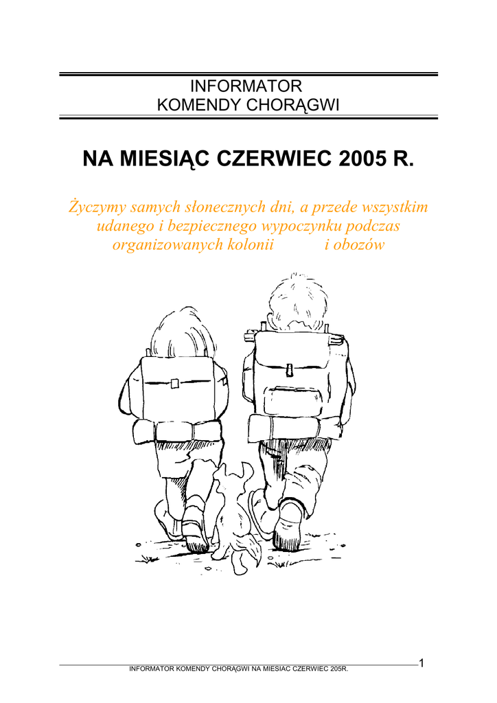 INFORMATOR KOMENDY CHORĄGWI NA MIESIĄC CZERWIEC 2005 R. Życzymy samych słonecznych dni, a przede wszystkim udanego i bezpiecznego wypoczynku podczas organizowanych kolonii i obozów INFORMATOR KOMENDY CHORĄGWI NA MIESIAC CZERWIEC 205R. 1 Związek Harcerstwa Polskiego 29.04.2005r. Komendant Śląskiej Chorągwi Katowice, Rozkaz L11/2005 1. Zarządzenia i informacje 1.2. Informacje 1.2.1. Ogłaszam listę uczestników zbiórki wyborczej posiadających czynne prawo wyborcze na zbiórce wyborczej Rejonu 8 odbywającej się w dniu 28.05.2005r. o godzinie 15.00 w Komendzie Hufca Ziemi Gliwickiej: 1. hm. Mieczysław BRAŃKA - Przewodniczący Chorągwianej Komisji Rewizyjnej 2. hm. Ewa COFAŁA - Skarbniczka Chorągwi 3. hm. Tadeusz GWÓŹDŹ - Szef Harcerskiego Klubu Podróżnika "Róża Wiatrów" 4. hm. Andrzej LICHOTA - Komendant Chorągwi 5. hm. Joanna RUSINOWSKA - Kierowniczka Referatu Zuchowego Śląskiej Chorągwi ZHP 6. pwd. Elżbieta WIKTORZAK - Kierowniczka Referatu Finansowo Ekonomicznego Śląskiej Chorągwi ZHP 7. hm. Krzysztof WITKOWSKI - Przewodniczący Kręgu Seniora Czuwaj! hm. Andrzej Lichota INFORMATOR KOMENDY CHORĄGWI NA MIESIAC CZERWIEC 205R. 2 Związek Harcerstwa Polskiego 10.05.2005r. Komendant Śląskiej Chorągwi Katowice, Rozkaz L12/2005 3. Chorągiew 3.4. Mianowania na funkcje 3.4.1. Mianuję z dniem 01.05.2005r. druha hm. Tadeusza KOWALCZYKA komendantem Stanicy Harcerzy Wodnych w Wiśle Wielkiej. 4. Rozwiązania i powołania sztabów, komisji, komend kursów, referatów, zespołów 4.1. Rozwiązania powołania sztabów 4.1.1. Powołuję z dniem 15.05.2004r. Komendę XLIII Odrzańskiego Spływu Wiosennego w następującym składzie: phm. Wojciech CZARNOTA - Komodor OSW hm. Adam BAŁAZY - Komodor Szlaku Oszka phm. Gabriel KAMIŃSKI - Komodor Szlaku Wawelberga phm. Franiszek WINKLER - Komodor Szlaku Baranka hm. Henryk WIDERA - Ochmistrz OSW H.R. Sylwester KMIECIK - Komendant Placu hm. Adam BAŁAZY - Ratownik WOPR Spływu pwd. Marcin ADAMCZYK - Sędzia Główny phm. Marcin TALAREK - Wagant 4.1.2. Powołuję z dniem 15.05.2005r. Sztab Harcerskiej Akcji Letniej w następującym składzie: hm. Ewa COFAŁA hm. Aleksandra KARNIA phm. Ewa MOŚCIŃSKA hm. Anna PETERKO pwd. Elżbieta WIKTORZAK phm. Robert DUDA hm. Arkadiusz GODLEWSKI INFORMATOR KOMENDY CHORĄGWI NA MIESIAC CZERWIEC 205R. 3 4.1. Zwalniam phm. Katarzynę KLIMOWICZ z funkcji komendantki gry militarno- survivalowej "Pustynna Burza”. 8. Harcerska Akcja Letnia i Zmowa 8.1. Zwolnienia i mianowania 8.1.1. Mianuję pełnomocnikiem komendanta chorągwi ds. Harcerskiej Akcji Letniej i Nieobozowej Akcji Letniej hm. Annę PETERKO. 8.1.2 Mianuję szefem Sztabu Harcerskiej Akcji Letniej hm. Aleksandrę KARNIĘ. 13. Odznaczenia, pochwały, wyróżnienia 13.2. Pochwały 13.2.1. Składam serdeczne podziękowania Hufcowi ZHP Katowice za: - udział w imprezach wojewódzkich z okazji rocznicy uchwalenia Konstytucji 3 Maja, - wystawienie wart honorowych przy Pomniku Harcerzy, Wieży Spadochronowej, na Cmentarzu Garnizonowym Panewniki Mogiła, - XII Szczepowi Harcerskiemu oraz phm. Michałowi ZIAJSKIEMU za udział w uroczystościach zakończenia II Wojny Światowej, - 11 Środowiskowej Drużynie Harcerskiej „Polana” oraz pwd. Michałowi CIEŚLI za udział i występ artystyczny podczas spotkania u Wojewody. 13.2.2. Składam serdeczne podziękowania za opracowanie poradnika "Organizatora Nieobozowej Akcji Letniej" druhnom i druhom: phm. Justynie GUZIK hm. Barbarze JUSKOWIAK hm. Aleksandrze KARNIA phm. Marioli KĘSIK hm. Agacie KIK hm. Dominice KNURZE phm. Agnieszce LOSCE hm. Annie PETERKO hm. Joannie RUSINOWSKIEJ hm. Wojciechowi FRANK pwd. Markowi JĘDRZEJKOWI hm. Marcinowi JURKOWSKIEMU phm. Grzegorzowi KUBICZEK hm. Adrianowi STAROŃKOWI INFORMATOR KOMENDY CHORĄGWI NA MIESIAC CZERWIEC 205R. 4 13.2.3. Składam serdeczne podziękowania za opracowanie propozycji programowej "Jesteśmy na medal" druhom: hm. Wojciechowi FRANKOWI hm. Adrianowi STAROŃKOWI Czuwaj! hm. Andrzej Lichota Związek Harcerstwa Polskiego 10.05.2005r. Komendant Śląskiej Chorągwi Katowice, Rozkaz L13/2005 3. Chorągiew 3.3. Zwolnienia 3.3.1. Na wniosek Szefa Inspektoratu Ratowniczo – Medycznego Śląskiej Chorągwi ZHP zwalniam z dniem 01.06.2005r. ze składu Inspektoratu następujące druhny i druhów: dh. Karinę DEDĘ – Hufiec Ziemi Tyskiej dh. Annę MALCZYK – Hufiec Ruda Śląska dh. Magdalenę MORYS – Hufiec Chorzów pwd. Agnieszkę PIETER – Hufiec Ruda Śląska pwd. Magdalenę SPĘTANY – Hufiec Ziemi Gliwickiej pwd. Seweryna ERLINGA – Hufiec Ziemi Tyskiej dh. Tomasza FULARSKIEGO – Hufiec Mysłowice pwd. Marcina LACHA – Hufiec Ziemi Tyskiej dh. Adama SZYSZKĘ – Hufiec Kołobrzeg dh. Wojciecha WIECZORKA – Hufiec Katowice Dziękuję za dotychczasową służbę. 3.4. Mianowania na funkcję 3.4.1. Powołuję z dniem 01.06.2005r. w skład Inspektoratu Ratowniczo – Medycznego następujące druhny i druhów: phm. Jarosława DZIECHA – Hufiec Beskidzki pwd. Annę NIESŁUCHOWSKA – Hufiec Katowice pwd. Aleksandrę NADOLNĄ – Hufiec Dąbrowa Górnicza dh. Roberta LATACZA – Hufiec Ziemi Będzińskiej INFORMATOR KOMENDY CHORĄGWI NA MIESIAC CZERWIEC 205R. 5 4. Rozwiązania i powołania sztabów, komisji, komend kursów, referatów, zespołów 4.5. Rozwiązanie i powołanie zespołów 4.5.1. Na wniosek komendantek Hufców Ziemi Tarnogórskiej i Zabrze odwołuję z funkcji Szefa Międzyhufcowego Zespołu Kadry Kształcącej druha phm. Bartosza MERTASA. Dziękuję Druhowi za pełnienie dotychczasowej służby. 4.5.2. Na wniosek komendantek Hufców Ziemi Tarnogórskiej i Zabrze powołuję na funkcję Szefa Międzyhufcowego Zespołu Kadry Kształcącej druhnę phm. Agnieszkę LOSKĘ. 5. Mianowania instruktorów 5.2. Otwarcie próby na stopień hacmistrzyni / harcmistrza 5.2.1. Na wniosek Chorągwianej Komisji Stopni Instruktorskich z dnia 31.05.2005r. otwieram próbę na stopień harcmistrzyni / hacmistrza następującym druhnom i druhom: