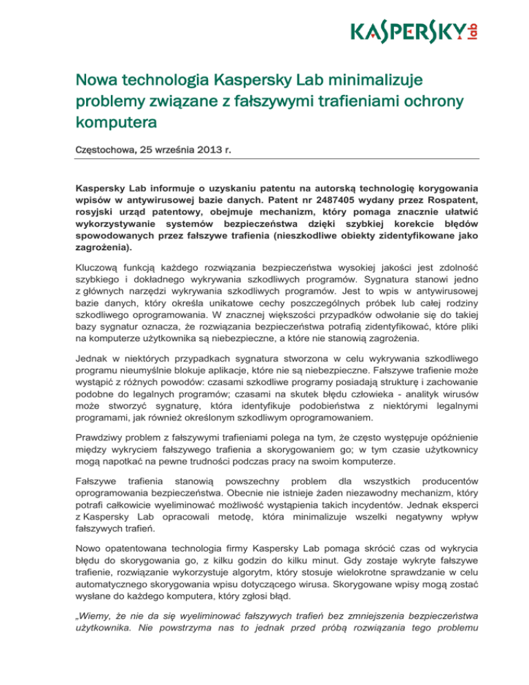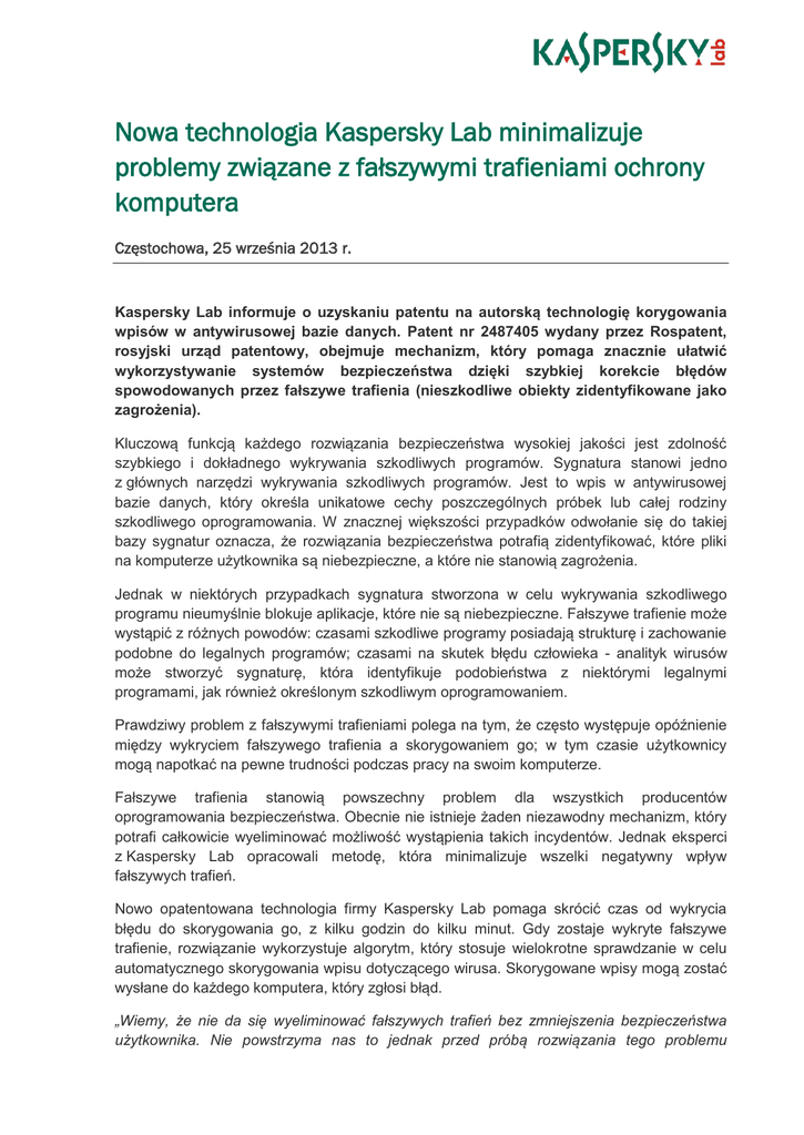 Nowa technologia Kaspersky Lab minimalizuje problemy związane z fałszywymi trafieniami ochrony komputera Częstochowa, 25 września 2013 r. Kaspersky Lab informuje o uzyskaniu patentu na autorską technologię korygowania wpisów w antywirusowej bazie danych. Patent nr 2487405 wydany przez Rospatent, rosyjski urząd patentowy, obejmuje mechanizm, który pomaga znacznie ułatwić wykorzystywanie systemów bezpieczeństwa dzięki szybkiej korekcie błędów spowodowanych przez fałszywe trafienia (nieszkodliwe obiekty zidentyfikowane jako zagrożenia). Kluczową funkcją każdego rozwiązania bezpieczeństwa wysokiej jakości jest zdolność szybkiego i dokładnego wykrywania szkodliwych programów. Sygnatura stanowi jedno z głównych narzędzi wykrywania szkodliwych programów. Jest to wpis w antywirusowej bazie danych, który określa unikatowe cechy poszczególnych próbek lub całej rodziny szkodliwego oprogramowania. W znacznej większości przypadków odwołanie się do takiej bazy sygnatur oznacza, że rozwiązania bezpieczeństwa potrafią zidentyfikować, które pliki na komputerze użytkownika są niebezpieczne, a które nie stanowią zagrożenia. Jednak w niektórych przypadkach sygnatura stworzona w celu wykrywania szkodliwego programu nieumyślnie blokuje aplikacje, które nie są niebezpieczne. Fałszywe trafienie może wystąpić z różnych powodów: czasami szkodliwe programy posiadają strukturę i zachowanie podobne do legalnych programów; czasami na skutek błędu człowieka - analityk wirusów może stworzyć sygnaturę, która identyfikuje podobieństwa z niektórymi legalnymi programami, jak również określonym szkodliwym oprogramowaniem. Prawdziwy problem z fałszywymi trafieniami polega na tym, że często występuje opóźnienie między wykryciem fałszywego trafienia a skorygowaniem go; w tym czasie użytkownicy mogą napotkać na pewne trudności podczas pracy na swoim komputerze. Fałszywe trafienia stanowią powszechny problem dla wszystkich producentów oprogramowania bezpieczeństwa. Obecnie nie istnieje żaden niezawodny mechanizm, który potrafi całkowicie wyeliminować możliwość wystąpienia takich incydentów. Jednak eksperci z Kaspersky Lab opracowali metodę, która minimalizuje wszelki negatywny wpływ fałszywych trafień. Nowo opatentowana technologia firmy Kaspersky Lab pomaga skrócić czas od wykrycia błędu do skorygowania go, z kilku godzin do kilku minut. Gdy zostaje wykryte fałszywe trafienie, rozwiązanie wykorzystuje algorytm, który stosuje wielokrotne sprawdzanie w celu automatycznego skorygowania wpisu dotyczącego wirusa. Skorygowane wpisy mogą zostać wysłane do każdego komputera, który zgłosi błąd. „Wiemy, że nie da się wyeliminować fałszywych trafień bez zmniejszenia bezpieczeństwa użytkownika. Nie powstrzyma nas to jednak przed próbą rozwiązania tego problemu w możliwie najlepszy sposób. Dlatego postanowiliśmy stworzyć nową technologię opatentowany przez nas mechanizm oznacza, że możemy skorygować potencjalne błędy w wykrywaniu tak szybko jak to możliwe, minimalizując wszelkie problemy, jakich mogą doświadczyć użytkownicy bez zmniejszania poziomu ochrony” – powiedział Oleg Iszanow, dyrektor działu Anti-Malware Research w Kaspersky Lab i członek zespołu odpowiedzialnego za rozwój opatentowanej technologii. Informację można wykorzystać dowolnie z zastrzeżeniem podania firmy Kaspersky Lab jako źródła. Wszystkie informacje prasowe http://www.kaspersky.pl/news. Kaspersky Lab Polska są dostępne na stronie Dalszych informacji udziela Piotr Kupczyk Dyrektor biura komunikacji z mediami, Kaspersky Lab Polska [email protected] tel.: 0 801 000 215, (34) 368 18 14 tel. kom.: 518 935 846 Informacje o Kaspersky Lab Kaspersky Lab jest największą na świecie prywatną firmą tworzącą rozwiązania do ochrony punktów końcowych. Firma znalazła się w pierwszej czwórce producentów rozwiązań bezpieczeństwa punktów końcowych w klasyfikacji ogólnoświatowej*. Od 16 lat swojej działalności Kaspersky Lab pozostaje innowatorem w dziedzinie bezpieczeństwa IT i oferuje skuteczne rozwiązania bezpieczeństwa cyfrowego dla klientów indywidualnych, firm z sektora SMB oraz przedsiębiorstw. Obecnie firma działa w prawie 200 krajach na całym świecie, zapewniając ochronę ponad 300 milionom użytkowników. Polskie przedstawicielstwo firmy istnieje od 2000 r. Więcej informacji można uzyskać na stronie www.kaspersky.pl. * Firma uplasowała się na czwartym miejscu w rankingu IDC „Worldwide Endpoint Security Revenue by Vendor, 2012”. Ranking ten został opublikowany w raporcie IDC „Worldwide Endpoint Security 2013-2017 Forecast and 2012 Vendor Shares” (IDC #242618, sierpień 2013). W raporcie producenci oprogramowania zostali uszeregowani według wysokości dochodów ze sprzedaży rozwiązań bezpieczeństwa punktów końcowych w 2012 r.