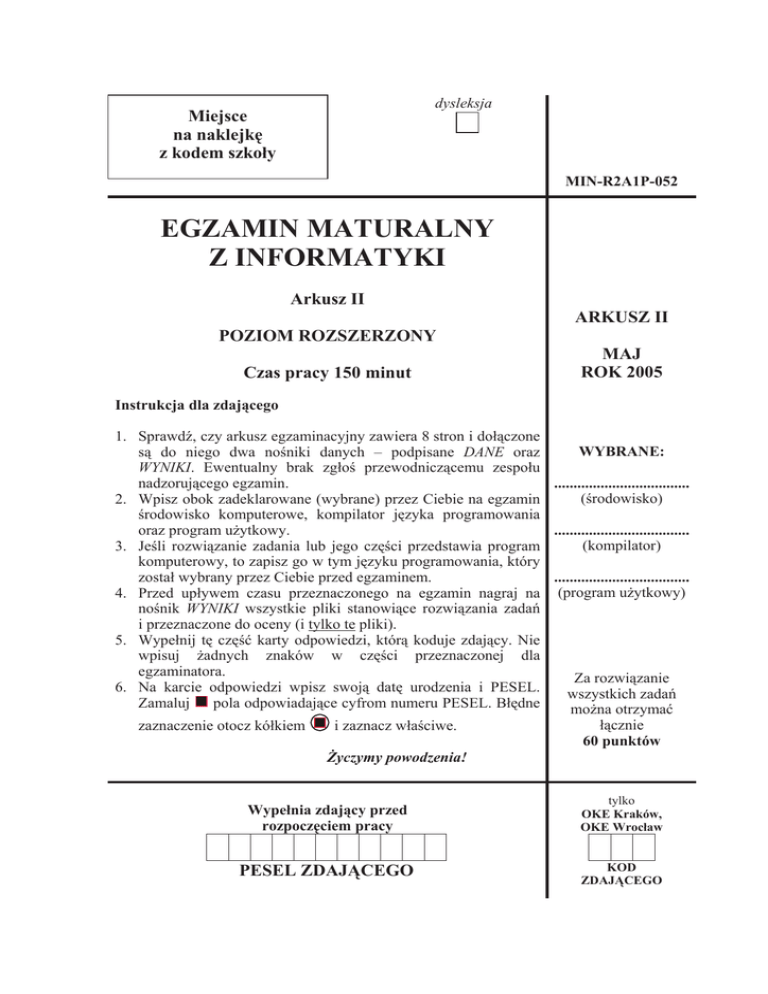 dysleksja Miejsce na naklejkĊ z kodem szkoáy MIN-R2A1P-052 EGZAMIN MATURALNY Z INFORMATYKI Arkusz II ARKUSZ II POZIOM ROZSZERZONY Czas pracy 150 minut MAJ ROK 2005 Instrukcja dla zdającego 1. SprawdĨ, czy arkusz egzaminacyjny zawiera 8 stron i doáączone WYBRANE: są do niego dwa noĞniki danych – podpisane DANE oraz WYNIKI. Ewentualny brak zgáoĞ przewodniczącemu zespoáu ................................... nadzorującego egzamin. (Ğrodowisko) 2. Wpisz obok zadeklarowane (wybrane) przez Ciebie na egzamin Ğrodowisko komputerowe, kompilator jĊzyka programowania ................................... oraz program uĪytkowy. (kompilator) 3. JeĞli rozwiązanie zadania lub jego czĊĞci przedstawia program komputerowy, to zapisz go w tym jĊzyku programowania, który ................................... zostaá wybrany przez Ciebie przed egzaminem. 4. Przed upáywem czasu przeznaczonego na egzamin nagraj na (program uĪytkowy) noĞnik WYNIKI wszystkie pliki stanowiące rozwiązania zadaĔ i przeznaczone do oceny (i tylko te pliki). 5. Wypeánij tĊ czĊĞü karty odpowiedzi, którą koduje zdający. Nie wpisuj Īadnych znaków w czĊĞci przeznaczonej dla egzaminatora. Za rozwiązanie 6. Na karcie odpowiedzi wpisz swoją datĊ urodzenia i PESEL. wszystkich zadaĔ Zamaluj pola odpowiadające cyfrom numeru PESEL. BáĊdne moĪna otrzymaü áącznie i zaznacz wáaĞciwe. zaznaczenie otocz kóákiem 60 punktów ĩyczymy powodzenia! Wypeánia zdający przed rozpoczĊciem pracy tylko OKE Kraków, OKE Wrocáaw PESEL ZDAJĄCEGO KOD ZDAJĄCEGO Egzamin maturalny z informatyki Arkusz II 4 Zadanie 5. Najlepsze sumy, najpopularniejsze elementy. (20 pkt) Najlepszą sumą ciągu liczb a1, a2, .., an nazywamy najwiĊkszą wartoĞü wĞród sum záoĪonych z sąsiednich elementów tego ciągu. Na przykáad dla ciągu: 1, 2, –5, 7 mamy nastĊpujące sumy: 1, 1+2 = 3, 1+2+(–5) = –2, 1+2+(–5)+7 = 5, 2, 2+(–5) = –3, 2+(–5)+7 = 4, –5, –5+7 = 2, 7. Zatem najlepszą sumą jest 7 (zwróü uwagĊ, Īe jeden element teĪ uznajemy za sumĊ). Do oceny oddajesz: Na noĞniku WYNIKI dokument tekstowy Raport5 zawierający odpowiedzi do punktów a), b), c). Wykonaj poniĪsze polecenia. a) Dany jest nastĊpujący ciąg liczb caákowitych: 1, –2, 6, –5, 7, –3. Wyznacz najlepszą sumĊ dla tego ciągu i wpisz poniĪej jej wartoĞü: Najlepsza suma:.............................................. Czy na podstawie uzyskanego wyniku moĪna podaü wartoĞü najlepszej sumy dla ciągu: 1, –2, 2, 2, 2, –5, 3, 3, 1, –3. Do oceny oddajesz w dokumencie Raport5 wartoĞci najlepszej sumy dla ciągu oraz odpowiedĨ z uzasadnieniem na powyĪsze pytanie. b) Zaproponuj algorytm wyznaczania najlepszej sumy dla dowolnego ciągu liczb caákowitych. Na jego podstawie napisz program do obliczenia najlepszych sum ciągów liczb podanych w plikach dane5-1.txt, dane5-2.txt, dane5-3.txt (znajdującym siĊ na noĞniku DANE). Wpisz poniĪej najlepsze sumy dla poszczególnych ciągów: Najlepsza suma dla dane5-1.txt Najlepsza suma dla dane5-2.txt Najlepsza suma dla dane5-3.txt Do oceny oddajesz takĪe w dokumencie Raport5: x opis algorytmu zawierającego odpowiednie fragmenty kodu Twojego programu, x wartoĞci najlepszych sum dla poszczególnych plików, które wpisaáeĞ do powyĪszej tabeli. c) Wyznacz „najpopularniejszy” element w ciągu, czyli element wystĊpujący najwiĊkszą liczbĊ razy. Zaprojektuj jak najszybszy algorytm wyznaczania najpopularniejszego elementu ciągu oraz oszacuj liczbĊ wykonywanych przez niego operacji (czas dziaáania) jako funkcjĊ od liczby elementów w ciągu. Zaprogramuj swój algorytm i zastosuj go do ciągów znajdujących siĊ w plikach dane5-1.txt, dane5-2.txt, dane5-3.txt. W przypadku, gdy w ciągu jest wiĊcej niĪ jeden najpopularniejszy element, jako wynik podajemy dowolny z nich. Na przykáad dla ciągu 1, 3, 5, 1, 3 poprawną odpowiedzią jest zarówno 1, jak i 3 (oba elementy wystĊpują dwa razy). Wpisz poniĪej najpopularniejsze elementy dla poszczególnych ciągów: Egzamin maturalny z informatyki Arkusz II 5 Najpopularniejszy element w dane5-1.txt Najpopularniejszy element w dane5-2.txt Najpopularniejszy element w dane5-3.txt Do oceny oddajesz w dokumencie Raport5: x najpopularniejsze elementy w plikach dane5-1.txt, dane5-2.txt, dane5-3.txt umieszczone w tabeli czytelnie prezentującej te wyniki, x opis algorytmu zawierającego odpowiednie fragmenty kodu Twojego programu oraz oszacowanie czasu jego dziaáania. Punktacja: CzĊĞü zadania a) b) c) Razem Maks. 4 8 8 20