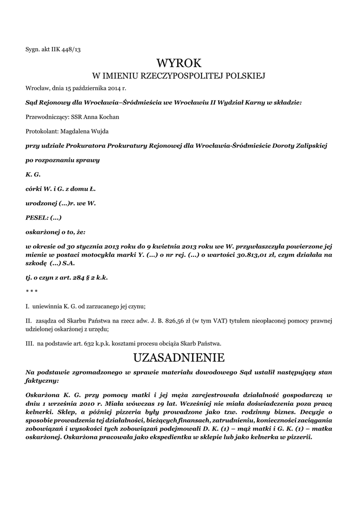 Sygn. akt IIK 448/13 WYROK W IMIENIU RZECZYPOSPOLITEJ POLSKIEJ Wrocław, dnia 15 października 2014 r. Sąd Rejonowy dla Wrocławia–Śródmieścia we Wrocławiu II Wydział Karny w składzie: Przewodniczący: SSR Anna Kochan Protokolant: Magdalena Wujda przy udziale Prokuratora Prokuratury Rejonowej dla Wrocławia-Śródmieście Doroty Zalipskiej po rozpoznaniu sprawy K. G. córki W. i G. z domu Ł. urodzonej (...)r. we W. PESEL: (...) oskarżonej o to, że: w okresie od 30 stycznia 2013 roku do 9 kwietnia 2013 roku we W. przywłaszczyła powierzone jej mienie w postaci motocykla marki Y. (...) o nr rej. (...) o wartości 30.813,01 zł, czym działała na szkodę (...) S.A. tj. o czyn z art. 284 § 2 k.k. *** I. uniewinnia K. G. od zarzucanego jej czynu; II. zasądza od Skarbu Państwa na rzecz adw. J. B. 826,56 zł (w tym VAT) tytułem nieopłaconej pomocy prawnej udzielonej oskarżonej z urzędu; III. na podstawie art. 632 k.p.k. kosztami procesu obciąża Skarb Państwa. UZASADNIENIE Na podstawie zgromadzonego w sprawie materiału dowodowego Sąd ustalił następujący stan faktyczny: Oskarżona K. G. przy pomocy matki i jej męża zarejestrowała działalność gospodarczą w dniu 1 września 2010 r. Miała wówczas 19 lat. Wcześniej nie miała doświadczenia poza pracą kelnerki. Sklep, a później pizzeria były prowadzone jako tzw. rodzinny biznes. Decyzje o sposobie prowadzenia tej działalności, bieżących finansach, zatrudnieniu, konieczności zaciągania zobowiązań i wysokości tych zobowiązań podejmowali D. K. (1) – mąż matki i G. K. (1) – matka oskarżonej. Oskarżona pracowała jako ekspedientka w sklepie lub jako kelnerka w pizzerii. Za wiedzą i zgodą oskarżonej zostały zaciągnięte różne kredyty, między innymi został wzięty w leasing motocykl marki Y. (...). Umowa leasingowa (leasingu operacyjnego) zawarta została z (...) S.A. w dniu 23 kwietnia 2012 r. na kwotę 30.813,01 zł. Decyzję o kupnie tego modelu motocykla podjął i jego jedynym użytkownikiem był D. K. (1). Oskarżona nie posiada prawa jazdy na motocykl i nie przejawiała zainteresowania pojazdem. Dowód: wyjaśnienia oskarżonej – k. 42-45, 115-118 zeznania świadka T. Ł. – k. 138-139 zeznania świadka K. F. – k. 136-137 zeznania świadka W. P. – k .137-138 zeznania świadka D. K. – k. 171-173 zeznania świadka G. K. – k. 173-174 zeznania świadka S. K.– k. 176 zeznania świadka P. S. – k. 49-50 , 174-175 dokumentacja bankowa – k. 1-12 Raty przestały być regulowane. Do zapłaty całości (rozłożonej na 61 rat leasingowych) zabrakło 3200 zł. W dniu 23 stycznia 2013 r. do firmy oskarżonej na adres we W. przy ul. (...) skierowano pismo o rozwiązaniu umowy leasingu. Pocztę firmową odebrała G. K. (1) (podpisując się na zwrotce). W dniu 30 stycznia przyjechał do W. przedstawiciel banku w związku z interwencją windykacyjną. Sprawę omówił z matką oskarżonej, wzywając do wydania motocykla do dnia 11 lutego 2014 r. G. K. (1) zapewniła, że motocykl zostanie spłacony i podpisała dokument, na którym złożyła podpis imieniem i nazwiskiem oskarżonej. Zgodnie z jego treścią zobowiązał się do zapłaty całej zaległości, zapłaty kosztów windykacyjnych i przekazania przedmiotu leasingu. W dniu 9 kwietnia 2014 r. funkcjonariusze Policji dokonali zatrzymania rzeczy – motocykla, motocykla marki Y. (...) o nr rej. (...), który był zaparkowany obok pizzerii J.. Dowód: wyjaśnienia oskarżonej – k. 42-45, 115-118 zeznania świadka T. Ł. – k. 138-139 zeznania świadka K. F. – k. 136-137 zeznania świadka W. P. – k .137-138 zeznania świadka D. K. – k. 171-173 zeznania świadka G. K. – k. 173-174 zeznania świadka S. K.– k. 176 zeznania świadka P. S. – k. 49-50 , 174-175 dokumentacja bankowa – k. 1-12 oświadczenie – k. 9 K. G. (ur. (...)) posiada wykształcenie średnie, z zawodu jest informatykiem, pracuje jako sprzedawca (dochód 1600 zł). Jest bezdzietną panną, uprzednio nie była karana, nie była leczona psychiatrycznie, neurologicznie ani odwykowo. Dowód: karta karna – k. 46 notatka urzędowa – k. 26 dane o oskarżonej – k. 57 Oceniając zebrany w sprawie materiał dowodowy Sąd dał wiarę wyjaśnieniom oskarżonej składanym w postępowaniu przed Sądem, nie dając wiary wszystkim wyjaśnieniom z postępowania przygotowawczego. To, o czym oskarżona opowiedziała przed Sądem znalazło potwierdzenie w zeznaniach świadków, wyjąwszy częściowo zeznania D. K. (1) (męża matki) i funkcjonariusza Policji, który przesłuchiwał oskarżoną w postępowaniu przygotowawczym z powodów, które podane w dalszej części uzasadnienia. Pozostali świadkowie są dla Sądu wiarygodni, a najważniejsze zeznania złożył przedstawiciel banku, który windykował należność i dopiero na sali sądowej zorientował się (i był pewny tej okoliczności, składając odpowiednie zeznania), że dokument dotyczący przedmiotowego motocyklu podpisała nie oskarżona, lecz jej matka imieniem i nazwiskiem córki. Oskarżona w postępowaniu przygotowawczym przyznała się do czynu i złożyła bardzo skrótowe i pobieżne wyjaśnienia. Między innymi opisała, że w dniu 30 stycznia 2013 r. został rozwiązana z nią umowa leasingowa i gdy przyjechał pan z banku nie wydała mu rzeczy, ponieważ miała nadzieję spłacić motocykl. Wyjaśnienia w tej części są sprzeczne z dokumentami znajdującymi się w aktach. Zarówno potwierdzenie informacji o rozwiązaniu umowy, jak i zobowiązanie do wydania rzeczy i zapłaty podpisała matka oskarżonej. W postępowaniu przed Sądem oskarżona nie podtrzymała wyjaśnień złożonych w postępowaniu przygotowawczym. Twierdziła, że na policji opowiedziała zdarzenie jak w sądzie, ale policjant ją poinformował, „że to będzie „ładniej” dla Sądu wyglądało, jak to będą wyjaśnienia w tym kształcie: „Mówiłam policjantowi, że nie wiedziałam, że ten pan przyjeżd