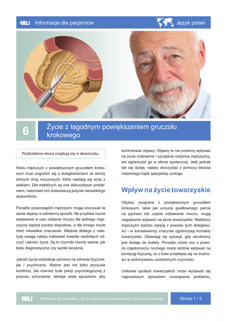 Informacje dla pacjentów 6 3 Język polski Życie z łagodnym powiększeniem gruczołu krokowego Podkreślone słowa znajdują się w słowniczku. Wielu mężczyzn z powiększonym gruczołem krokowym musi pogodzić się z dolegliwościami ze strony dolnych dróg moczowych, które nasilają się wraz z wiekiem. Dla niektórych są one dokuczliwym problemem, natomiast inni doświadczą jedynie niewielkiego dyskomfortu. Ponadto poszczególni mężczyźni mogą odczuwać te same objawy w odmienny sposób. Na przykład nocne wstawanie w celu oddania moczu dla jednego mężczyzny będzie bardzo kłopotliwe, a dla innego może mieć niewielkie znaczenie. Właśnie dlatego z należytą uwagą należy traktować kwestie osobistych odczuć i jakości życia. Są to czynniki równie ważne, jak testy diagnostyczne czy wyniki leczenia. Jakość życia oddziałuje zarówno na zdrowie fizyczne, jak i psychiczne. Ważne jest nie tylko poczucie komfortu, ale również brak presji psychologicznej z powodu schorzenia. Istnieje wiele sposobów, aby kontrolować objawy. Objawy te nie powinny wpływać na życie codzienne i szczęście rodzinne mężczyzny, ani ograniczać go w sferze społecznej. Jeśli jednak tak się dzieje, należy skorzystać z pomocy lekarza rodzinnego bądź specjalisty urologa. Wpływ na życie towarzyskie Objawy związane z powiększonym gruczołem krokowym, takie jak uczucie gwałtownego parcia na pęcherz lub częste oddawanie moczu, mogą negatywnie wpływać na życie towarzyskie. Niektórzy mężczyźni bardzo cierpią z powodu tych dolegliwości i w konsekwencji znacznie ograniczają kontakty towarzyskie. Obawiają się sytuacji, gdy utrudniony jest dostęp do toalety. Ponadto utrata snu z powodu częstomoczu nocnego może istotnie wpływać na kondycję fizyczną, co z kolei przekłada się na trudności w wykonywaniu codziennych czynności. Unikanie spotkań towarzyskich może wydawać się najprostszym sposobem rozwiązania problemu, Informacje dla pacjentów - Życie z łagodnym powiększeniem gruczołu krokowego Strona 1 / 3 lecz może to prowadzić do izolacji i utraty radości życia. Najlepszym wyjściem jest wówczas uzyskanie profesjonalnej porady urologicznej, by móc sobie radzić z dolegliwościami. Życie osobiste i seksualne Objawy spowodowane powiększeniem gruczołu krokowego mogą mieć negatywny wpływ na życie osobiste i seksualne. Brak poczucia stałej kontroli nad swoim ciałem utrudnia kontakty intymne, a także wyzwala poczucie nieatrakcyjności i obniża pewność siebie. Nietrzymanie moczu lub uczucie gwałtownego parcia na pęcherz mogą być kłopotliwe i powodować wstyd. Efekt ten dodatkowo mogą pogarszać działania niepożądane leczenia farmakologicznego, takie jak brak popędu płciowego lub zaburzenia erekcji. Wielu mężczyznom trudno jest pogodzić się z takimi objawami, ponieważ seksualność jest istotną częścią ich życia. Problem ten może prowadzić do braku akceptacji schorzenia, a nawet stać się przyczyną depresji. Stąd też nie należy lekceważyć wpływu, jaki objawy te mają na jakość życia. Życie z powiększonym gruczołem krokowym jest wyzwaniem nie tylko dla pacjenta, ale również dla jego partnerki (partnera). Ucierpieć mogą wspólne kontakty intymne, podobnie jak życie codzienne. Sytuacja ta może być trudna także dla partnerki (partnera) pacjenta, dlatego należy otwarcie dyskutować o problemie i wybrać najlepsze rozwiązanie. Rozmowa z urologiem na temat życia seksualnego może być krępująca, lecz jest to najskuteczniejszy sposób poradzenia sobie z tego rodzaju problemami. W decyzji o wyborze metody leczenia oraz w określeniu priorytetów w życiu seksualnym powinna również uczestniczyć partnerka (partner) pacjenta. Istnieje wiele sposobów na złagodzenie objawów i poprawienie jakości życia seksualnego, które ułatwią życie z powiększonym gruczołem krokowym. Uzyskanie pomocy Dolegliwości ze strony dolnych dróg moczowych, zwłaszcza gdy są bardzo uciążliwe, stanowią problem intymny i osobisty. Wielu mężczyzn woli o nim z nikim nie rozmawiać lub nie zgłaszać się z nim do lekarza, ponieważ: • • • • • • • • obawiają się obecności nieuleczalnej choroby, obawiają się nietrafionej diagnozy, dostęp do specjalisty może być utrudniony, mogą mieć złe wspomnienia z poprzednich hospitalizacji, ich krewni lub znajomi mają złe opinie na temat leczenia podobnych schorzeń, nie posiadają informacji na temat różnych metod leczenia, powstrzymują ich ograniczenia finansowe, czują się odosobnieni z powodu wieku bądź stanu zdrowia. Chociaż tego typu wyjaśnienia mogą wydawać się przekonujące, nie powinny one jednak ograniczać pacjentów w poszukiwaniu pomocy i poprawy jakości życia. Nie należy podporządkowywać swojego życia chorobie. Pytania do lekarza Pacjent ma prawo mieć wiele pytań odnośnie do swojego stanu zdrowia. Opracowane przez EAU informacje dostarczają odpowiedzi na wiele z nich, jednak nie odnoszą się one do konkretnych przypadków. Specjalista urolog jest najodpowiedniejszą osobą do omówienia tego typu zagadnień, więc w trakcie wizyty nie należy czuć się skrępowanym. Przykładowe pytania, które można zadać swojemu lekarzowi: • Jakie są wyniki moich badań i jak je zinterpretować? • Czy mam raka? • Jaka jest przyczyna tej choroby? • Co może się wydarzyć w ciągu miesięcy lub lat, jeśli nie podejmę leczenia? Informacje dla pacjentów - Życie z łagodnym powiększeniem gruczołu krokowego Strona 2 / 3 • • • • • Jakie będą bliskie i odległe konsekwencje podjętego leczenia? Dlaczego zalecona mi metoda leczenia jest dla mnie najskuteczniejsza? Czego mogę oczekiwać od leczenia? Czy podjęte działania wyleczą mnie z choroby? Jak długo będzie trwało leczenie? Informacje tu zawarte zostały po raz ostatni uaktualnione w październiku 2013 roku. Prezentowana ulotka jest częścią pro
