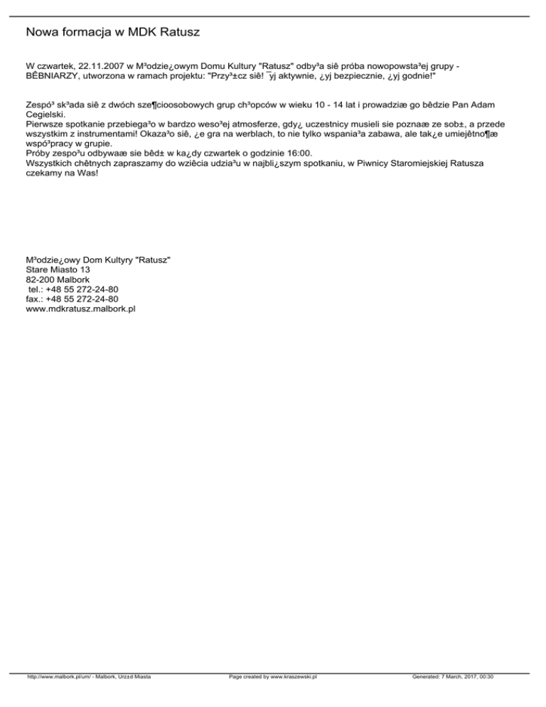 Nowa formacja w MDK Ratusz W czwartek, 22.11.2007 w M³odzie¿owym Domu Kultury "Ratusz" odby³a siê próba nowopowsta³ej grupy BÊBNIARZY, utworzona w ramach projektu: "Przy³±cz siê! ¯yj aktywnie, ¿yj bezpiecznie, ¿yj godnie!" Zespó³ sk³ada siê z dwóch sze¶cioosobowych grup ch³opców w wieku 10 - 14 lat i prowadziæ go bêdzie Pan Adam Cegielski. Pierwsze spotkanie przebiega³o w bardzo weso³ej atmosferze, gdy¿ uczestnicy musieli sie poznaæ ze sob±, a przede wszystkim z instrumentami! Okaza³o siê, ¿e gra na werblach, to nie tylko wspania³a zabawa, ale tak¿e umiejêtno¶æ wspó³pracy w grupie. Próby zespo³u odbywaæ sie bêd± w ka¿dy czwartek o godzinie 16:00. Wszystkich chêtnych zapraszamy do wziêcia udzia³u w najbli¿szym spotkaniu, w Piwnicy Staromiejskiej Ratusza czekamy na Was! M³odzie¿owy Dom Kultyry "Ratusz" Stare Miasto 13 82-200 Malbork tel.: +48 55 272-24-80 fax.: +48 55 272-24-80 www.mdkratusz.malbork.pl http://www.malbork.pl/um/ - Malbork, Urz±d Miasta Page created by www.kraszewski.pl Generated: 7 March, 2017, 00:30