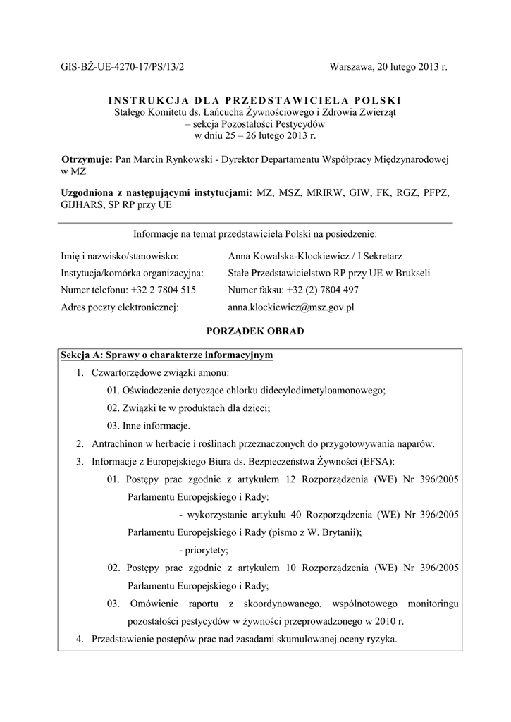 GIS-BŻ-UE-4270-17/PS/13/2 Warszawa, 20 lutego 2013 r. INSTRUKCJA DLA PRZEDSTAWICIELA POLSKI Stałego Komitetu ds. Łańcucha Żywnościowego i Zdrowia Zwierząt – sekcja Pozostałości Pestycydów w dniu 25 – 26 lutego 2013 r. Otrzymuje: Pan Marcin Rynkowski - Dyrektor Departamentu Współpracy Międzynarodowej w MZ Uzgodniona z następującymi instytucjami: MZ, MSZ, MRIRW, GIW, FK, RGZ, PFPZ, GIJHARS, SP RP przy UE Informacje na temat przedstawiciela Polski na posiedzenie: Imię i nazwisko/stanowisko: Anna Kowalska-Klockiewicz / I Sekretarz Instytucja/komórka organizacyjna: Stałe Przedstawicielstwo RP przy UE w Brukseli Numer telefonu: +32 2 7804 515 Numer faksu: +32 (2) 7804 497 Adres poczty elektronicznej: [email protected] PORZĄDEK OBRAD Sekcja A: Sprawy o charakterze informacyjnym 1. Czwartorzędowe związki amonu: 01. Oświadczenie dotyczące chlorku didecylodimetyloamonowego; 02. Związki te w produktach dla dzieci; 03. Inne informacje. 2. Antrachinon w herbacie i roślinach przeznaczonych do przygotowywania naparów. 3. Informacje z Europejskiego Biura ds. Bezpieczeństwa Żywności (EFSA): 01. Postępy prac zgodnie z artykułem 12 Rozporządzenia (WE) Nr 396/2005 Parlamentu Europejskiego i Rady: - wykorzystanie artykułu 40 Rozporządzenia (WE) Nr 396/2005 Parlamentu Europejskiego i Rady (pismo z W. Brytanii); - priorytety; 02. Postępy prac zgodnie z artykułem 10 Rozporządzenia (WE) Nr 396/2005 Parlamentu Europejskiego i Rady; 03. Omówienie raportu z skoordynowanego, wspólnotowego pozostałości pestycydów w żywności przeprowadzonego w 2010 r. 4. Przedstawienie postępów prac nad zasadami skumulowanej oceny ryzyka. monitoringu 5. Przygotowanie wspólnego stanowiska na posiedzenie KKŻ Komisji ds. Pozostałości Pestycydów w 2013 r.: 01. Określenie priorytetów; 02. Ocena ryzyka; 03. Zastosowania małoobszarowe; 04. Omówienie raportu opublikowanego przez FAO/WHO ds. Pozostałości Pestycydów (JMPR) w 2012 r.; 05. Lista priorytetowych pestycydów. 6. Omówienie stanu prac nad przewodnikiem RASFF. 7. Podejście systemowe do klasyfikacji produktów (projekt TAX-SA): 01. Poprawki i uzupełnienie do Załącznika I – propozycja Komisji w sprawie poprawek dla kategorii 1, 3, 4 i 5; 02. Propozycja Komisji w sprawie uzupełnień Załącznika I dla kategorii 6, 7, (8) i 9; 03. Pasze – kategoria 12 Załącznika I. 8. Wspólnotowy program kontroli na lata 2014-2016; 9. Omówienie stanu prac w sprawie saflufenacylu. 10. Wymiana informacji na temat najwyższych dopuszczalnych poziomów pozostałości dla 2,4-D, beflubetamidu, cyclanilidu, dinikonazolu, fipronilu, florasulamu, milbemektyny i S-metachloru w i na niektórych produktach. Prace prowadzone zgodnie z artykułem 12 Rozporządzenia (WE) Nr 396/2005 Parlamentu Europejskiego i Rady (projekt dokumentu SANCO/11264/2012 rev. 1). 11. Wymiana informacji na temat najwyższych dopuszczalnych poziomów pozostałości dla butralinu, chlorotoluronu, daminozidu, isoproturonu, pikoksystrobiny, pirymetanilu, kwasu siarkowego i trineksapaku w i na niektórych produktach. Prace prowadzone zgodnie z artykułem 12 Rozporządzenia (WE) Nr 396/2005 Parlamentu Europejskiego i Rady (projekt dokumentu SANCO/11037/2012). 12. Wymiana informacji na temat najwyższych dopuszczalnych poziomów pozostałości dla cyromazyny, fenpropidyny, formetanatu, oksamylu i tebukonazolu w i na niektórych produktach. Prace prowadzone zgodnie z artykułem 12 Rozporządzenia (WE) Nr 396/2005 Parlamentu Europejskiego i Rady (projekt dokumentu SANCO/12783/2011 rev. 3). 13. Najwyższe Dopuszczalne Poziomy pozostałości (NDP) potwierdzone przez RMS i nie potwierdzone przez MS – dyskusja. 14. NDP dla biocydów – uzupełnienie Rozporządzenia (WE) Nr 396/2005 Parlamentu Europejskiego i Rady. 15. Notyfikacja zgodnie z Artykułem 18(4) Rozporządzenia (WE) Nr 396/2005. 16. Informacje z FVO (Food and Veterinary Office). 17. Informacje z EU-RLs (European Union Reference Laboratories). 18. Przewodnik po metabolizmie ryb. 19. Wykorzystanie herbicydów w roślinach GMO odpornych na inne herbicydy. Sekcja B: Projekty przedstawione do zaopinniowania 1. Ocena i możliwość wydania ostatecznej opinii dla projektu Rozporządzenia Komisji w sprawie uzupełnień załączników II, III i IV do Rozporządzenia (WE) Nr 396/2005 Parlamentu Europejskiego i Rady dotyczących najwyższych dopuszczalnych poziomów pozostałości dla acetamiprydu, Adoxophyes orana GV strain BV-0001, azoksystrobiny, chlotianidyny, fenpyrazaminu, heptamaloksyloglukanu, metrafenonu, Paccilomyces lilacinus strain 251, propikonazolu, kwilazofopu-P, spiromesifenu, tebukonazolu, tiametoksamu i Zucchini yellow mozaik virus, weak strain w i na określonych produktach. (Prace prowadzone zgodnie z artykułem 10 Rozporządzenia (WE) Nr 396/2005 Parlamentu Europejskiego i Rady SANCO/10065/2013). (Analiza procedury prawnej Parlamentu Europejskiego i Rady na podstawie artykułu 14(1) rozporządzenia Nr 396/2005). 2. Ocena i możliwość wydania ostatecznej opinii dla projektu Rozporządzenia Komisji w sprawie uzupełnień załączników II i III do Rozporządzenia (WE) Nr 396/2005 Parlamentu Europejskiego i Rady dotyczących najwyższych dopuszczalnych poziomów pozostałości dla difenyloaminy w i na określonych produktach. Prace prowadzone zgodnie z artykułem 12 Rozporządzenia (WE) Nr 396/2005 Parlamentu Europejskiego i Rady (SANCO/12334/2012 rev. 2). (Analiza procedury prawnej Parlamentu Europejskiego i Rady na podstawie artykułu 14(1) rozporządzenia Nr 396/2005). 3. Ocena i możliwość wydania ostatecznej opinii dla projektu Rozporządzenia Komisji w sprawie uzupełnień załączników II i III do Rozporządzenia (WE) Nr 396/2005 Parlamentu Europejskiego i Rady dotyczących najwyższych dopuszczalnych poziomów pozostałości dla klodinafopu, klomazonu, diuronu, etafluraliny, joksynilu, iprowalikarbu, hydrazydu maleinowego, mepanipirymu, metkonazolu, prosulfokarbu i tepraloksydymu w i na określony