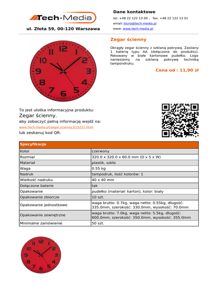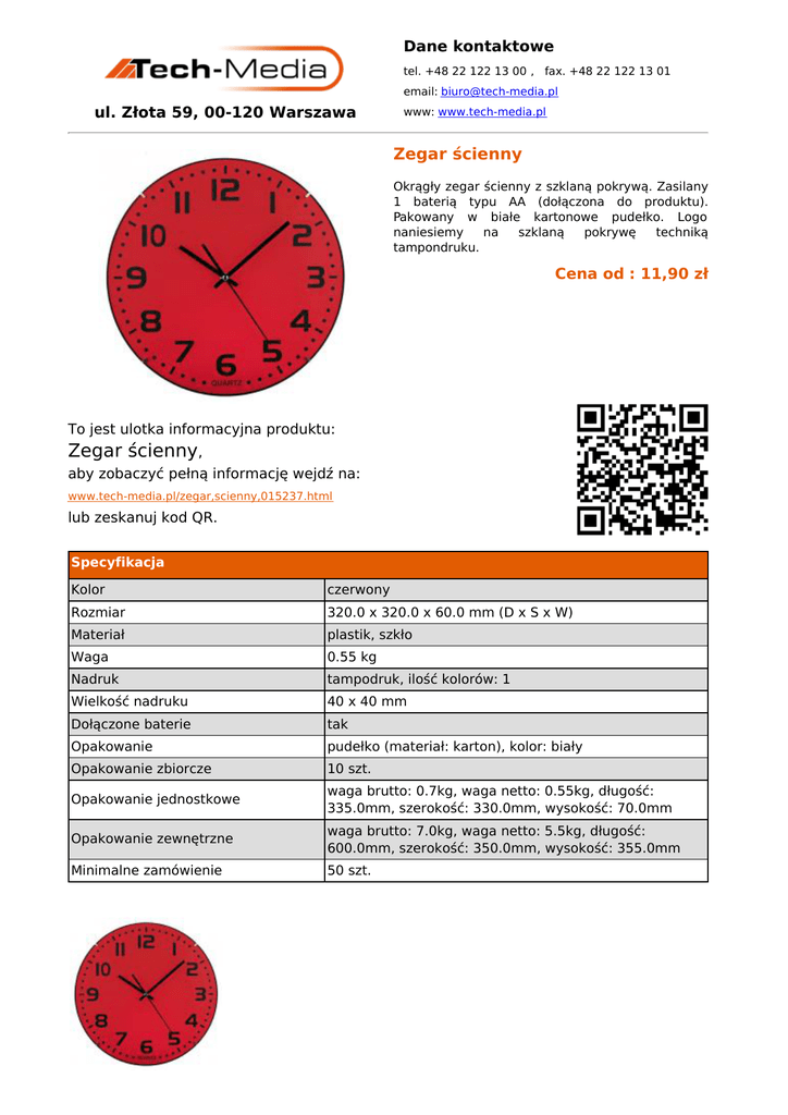 Dane kontaktowe tel. +48 22 122 13 00 , fax. +48 22 122 13 01 email: [email protected] ul. Złota 59, 00-120 Warszawa www: www.tech-media.pl Zegar ścienny Okrągły zegar ścienny z szklaną pokrywą. Zasilany 1 baterią typu AA (dołączona do produktu). Pakowany w białe kartonowe pudełko. Logo naniesiemy na szklaną pokrywę techniką tampondruku. Cena od : 11,90 zł To jest ulotka informacyjna produktu: Zegar ścienny, aby zobaczyć pełną informację wejdź na: www.tech-media.pl/zegar,scienny,015237.html lub zeskanuj kod QR. Specyfikacja Kolor czerwony Rozmiar 320.0 x 320.0 x 60.0 mm (D x S x W) Materiał plastik, szkło Waga 0.55 kg Nadruk tampodruk, ilość kolorów: 1 Wielkość nadruku 40 x 40 mm Dołączone baterie tak Opakowanie pudełko (materiał: karton), kolor: biały Opakowanie zbiorcze 10 szt. Opakowanie jednostkowe waga brutto: 0.7kg, waga netto: 0.55kg, długość: 335.0mm, szerokość: 330.0mm, wysokość: 70.0mm Opakowanie zewnętrzne waga brutto: 7.0kg, waga netto: 5.5kg, długość: 600.0mm, szerokość: 350.0mm, wysokość: 355.0mm Minimalne zamówienie 50 szt.