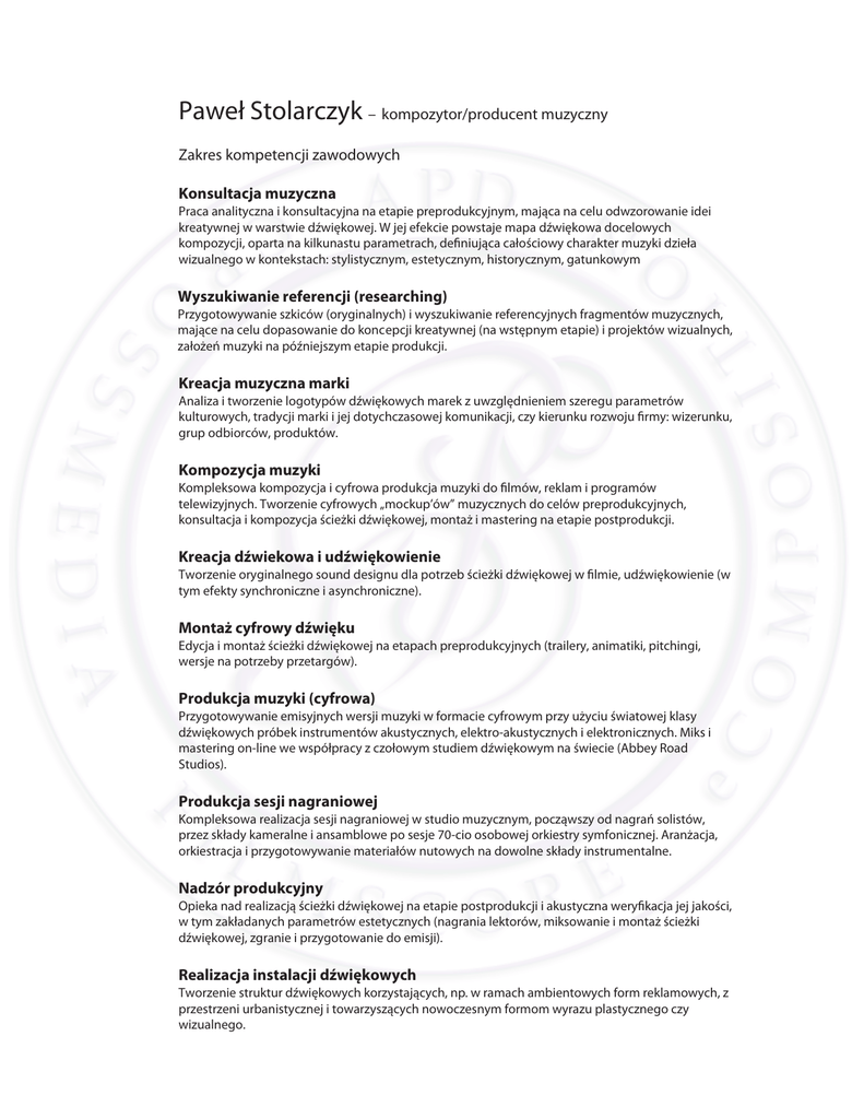 Paweł Stolarczyk – kompozytor/producent muzyczny Zakres kompetencji zawodowych Konsultacja muzyczna Praca analityczna i konsultacyjna na etapie preprodukcyjnym, mająca na celu odwzorowanie idei kreatywnej w warstwie dźwiękowej. W jej efekcie powstaje mapa dźwiękowa docelowych kompozycji, oparta na kilkunastu parametrach, definiująca całościowy charakter muzyki dzieła wizualnego w kontekstach: stylistycznym, estetycznym, historycznym, gatunkowym Wyszukiwanie referencji (researching) Przygotowywanie szkiców (oryginalnych) i wyszukiwanie referencyjnych fragmentów muzycznych, mające na celu dopasowanie do koncepcji kreatywnej (na wstępnym etapie) i projektów wizualnych, założeń muzyki na późniejszym etapie produkcji. Kreacja muzyczna marki Analiza i tworzenie logotypów dźwiękowych marek z uwzględnieniem szeregu parametrów kulturowych, tradycji marki i jej dotychczasowej komunikacji, czy kierunku rozwoju firmy: wizerunku, grup odbiorców, produktów. Kompozycja muzyki Kompleksowa kompozycja i cyfrowa produkcja muzyki do filmów, reklam i programów telewizyjnych. Tworzenie cyfrowych „mockup’ów” muzycznych do celów preprodukcyjnych, konsultacja i kompozycja ścieżki dźwiękowej, montaż i mastering na etapie postprodukcji. Kreacja dźwiekowa i udźwiękowienie Tworzenie oryginalnego sound designu dla potrzeb ścieżki dźwiękowej w filmie, udźwiękowienie (w tym efekty synchroniczne i asynchroniczne). Montaż cyfrowy dźwięku Edycja i montaż ścieżki dźwiękowej na etapach preprodukcyjnych (trailery, animatiki, pitchingi, wersje na potrzeby przetargów). Produkcja muzyki (cyfrowa) Przygotowywanie emisyjnych wersji muzyki w formacie cyfrowym przy użyciu światowej klasy dźwiękowych próbek instrumentów akustycznych, elektro-akustycznych i elektronicznych. Miks i mastering on-line we współpracy z czołowym studiem dźwiękowym na świecie (Abbey Road Studios). Produkcja sesji nagraniowej Kompleksowa realizacja sesji nagraniowej w studio muzycznym, począwszy od nagrań solistów, przez składy kameralne i ansamblowe po sesje 70-cio osobowej orkiestry symfonicznej. Aranżacja, orkiestracja i przygotowywanie materiałów nutowych na dowolne składy instrumentalne. Nadzór produkcyjny Opieka nad realizacją ścieżki dźwiękowej na etapie postprodukcji i akustyczna weryfikacja jej jakości, w tym zakładanych parametrów estetycznych (nagrania lektorów, miksowanie i montaż ścieżki dźwiękowej, zgranie i przygotowanie do emisji). Realizacja instalacji dźwiękowych Tworzenie struktur dźwiękowych korzystających, np. w ramach ambientowych form reklamowych, z przestrzeni urbanistycznej i towarzyszących nowoczesnym formom wyrazu plastycznego czy wizualnego.