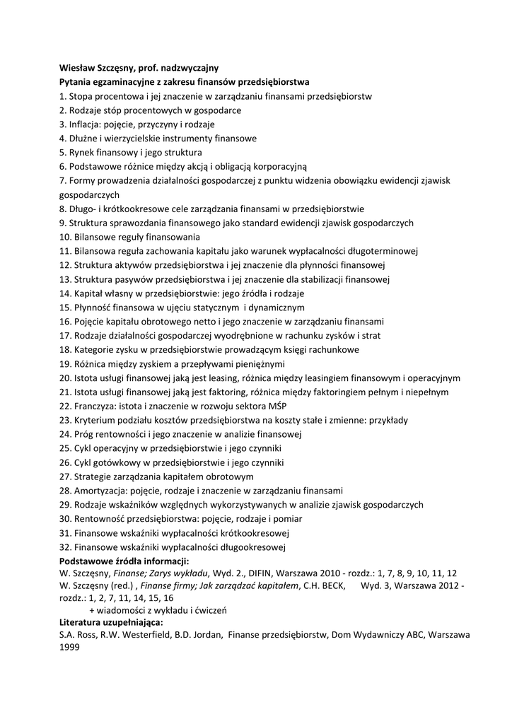 Wiesław Szczęsny, prof. nadzwyczajny Pytania egzaminacyjne z zakresu finansów przedsiębiorstwa 1. Stopa procentowa i jej znaczenie w zarządzaniu finansami przedsiębiorstw 2. Rodzaje stóp procentowych w gospodarce 3. Inflacja: pojęcie, przyczyny i rodzaje 4. Dłużne i wierzycielskie instrumenty finansowe 5. Rynek finansowy i jego struktura 6. Podstawowe różnice między akcją i obligacją korporacyjną 7. Formy prowadzenia działalności gospodarczej z punktu widzenia obowiązku ewidencji zjawisk gospodarczych 8. Długo- i krótkookresowe cele zarządzania finansami w przedsiębiorstwie 9. Struktura sprawozdania finansowego jako standard ewidencji zjawisk gospodarczych 10. Bilansowe reguły finansowania 11. Bilansowa reguła zachowania kapitału jako warunek wypłacalności długoterminowej 12. Struktura aktywów przedsiębiorstwa i jej znaczenie dla płynności finansowej 13. Struktura pasywów przedsiębiorstwa i jej znaczenie dla stabilizacji finansowej 14. Kapitał własny w przedsiębiorstwie: jego źródła i rodzaje 15. Płynność finansowa w ujęciu statycznym i dynamicznym 16. Pojęcie kapitału obrotowego netto i jego znaczenie w zarządzaniu finansami 17. Rodzaje działalności gospodarczej wyodrębnione w rachunku zysków i strat 18. Kategorie zysku w przedsiębiorstwie prowadzącym księgi rachunkowe 19. Różnica między zyskiem a przepływami pieniężnymi 20. Istota usługi finansowej jaką jest leasing, różnica między leasingiem finansowym i operacyjnym 21. Istota usługi finansowej jaką jest faktoring, różnica między faktoringiem pełnym i niepełnym 22. Franczyza: istota i znaczenie w rozwoju sektora MŚP 23. Kryterium podziału kosztów przedsiębiorstwa na koszty stałe i zmienne: przykłady 24. Próg rentowności i jego znaczenie w analizie finansowej 25. Cykl operacyjny w przedsiębiorstwie i jego czynniki 26. Cykl gotówkowy w przedsiębiorstwie i jego czynniki 27. Strategie zarządzania kapitałem obrotowym 28. Amortyzacja: pojęcie, rodzaje i znaczenie w zarządzaniu finansami 29. Rodzaje wskaźników względnych wykorzystywanych w analizie zjawisk gospodarczych 30. Rentowność przedsiębiorstwa: pojęcie, rodzaje i pomiar 31. Finansowe wskaźniki wypłacalności krótkookresowej 32. Finansowe wskaźniki wypłacalności długookresowej Podstawowe źródła informacji: W. Szczęsny, Finanse; Zarys wykładu, Wyd. 2., DIFIN, Warszawa 2010 - rozdz.: 1, 7, 8, 9, 10, 11, 12 W. Szczęsny (red.) , Finanse firmy; Jak zarządzać kapitałem, C.H. BECK, Wyd. 3, Warszawa 2012 rozdz.: 1, 2, 7, 11, 14, 15, 16 + wiadomości z wykładu i ćwiczeń Literatura uzupełniająca: S.A. Ross, R.W. Westerfield, B.D. Jordan, Finanse przedsiębiorstw, Dom Wydawniczy ABC, Warszawa 1999