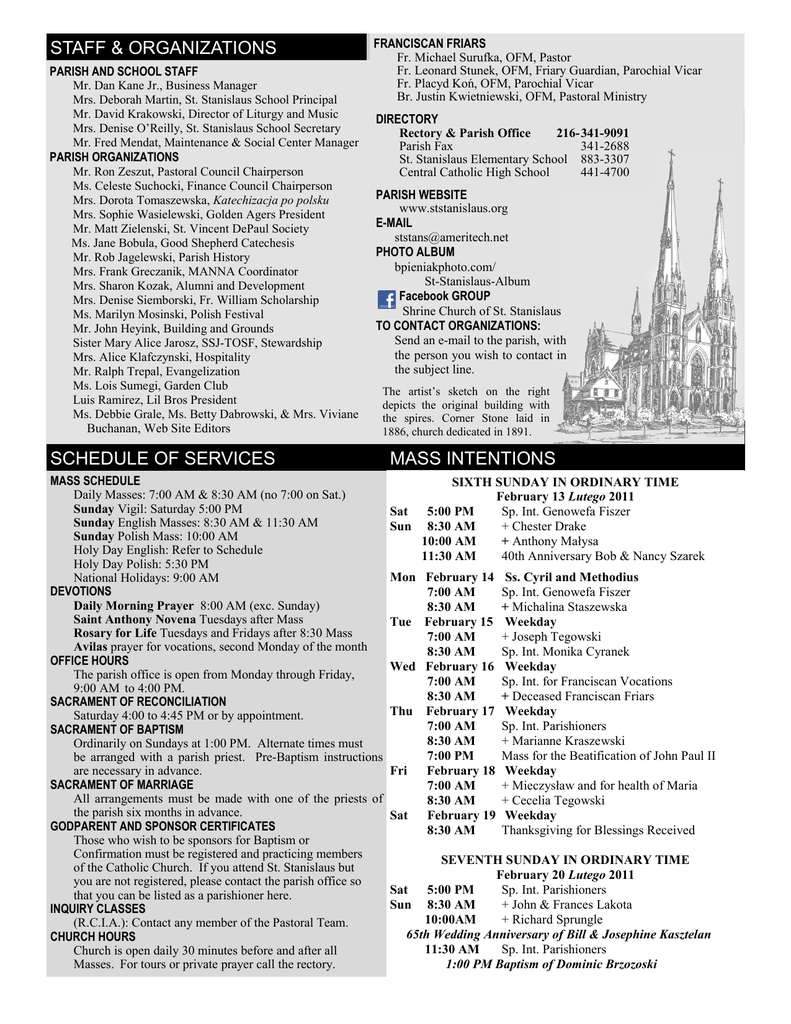FRANCISCAN FRIARS PARISH AND&SCHOOL STAFF STAFF ORGANIZATIONS Fr. Michael Surufka, Surufka, OFM, OFM, Pastor Pastor Mr. Bogdan (Don) Pieniak, Parish Administrator Fr. Leonard Stunek, OFM, Friary Guardian, Stunek, OFM, Friary Guardian,Parochial ParochialVicar Vicar PARISH AND SCHOOL STAFF Mrs. Deborah Martin, St. Stanislaus School Principal Fr. Placyd Koń, Kon, OFM, OFM, Parochial ParochialVicar Vicar Mr. Mr. Dan Dan Kane Kane Jr., Jr., Business BusinessManager Manager Br. Justin Kwietniewski, Kwietniewski, OFM, OFM,Pastoral PastoralMinistry Ministry Mrs. Deborah Martin, St. Stanislaus School and Principal Mr. David Krakowski, Director of Liturgy Music Mr. David Krakowski, Director of Liturgy and Music Mrs. Denise O’Reilly, St. Stanislaus School Secretary DIRECTORY Mrs. Denise O’Reilly, St. Stanislaus School Secretary Mr. Fred Mendat, Maintenance & Social Center Manager DIRECTORY Rectory & Parish Office 216- 341-9091 Mr. ORGANIZATIONS Fred Mendat, Maintenance & Social Center Manager Rectory & Parish Office 216-341-9091 Parish Fax 341-2688 PARISH PARISH Parish Fax Elementary School 341-2688 St. Stanislaus 883-3307 Mrs.ORGANIZATIONS Susan Halamek, Pastoral Council Chairperson St. Stanislaus Elementary School 883-3307 Mr. Zeszut, Pastoral Council Chairperson Central Catholic High School 441-4700 Ms. Ron Celeste Suchocki, Finance Council Chairperson Central Catholic High School 441-4700 Ms. Celeste Suchocki, Finance Council Chairperson Mrs. Sophie Wasielewski, Golden Agers President PARISH WEBSITE Pulaski Franciscan CDC 789-9545 Mrs. Dorota Tomaszewska, Katechizacja po polsku Mr. Charles Janowski, Jr., Dads Club President www.ststanislaus.org Mrs. Sophie Wasielewski, Golden Agers President Mr. Rick Krakowski, C.Y.O. Coordinator E-MAIL Mr. Mr. Matt Matt Zielenski, Zielenski, St. St.Vincent VincentDePaul DePaulSociety Society PARISH WEBSITE [email protected] Ms. Jane Bobula, Good Shepherd Catechesis Ms. Jane Bobula, Good Shepherd Catechesis www.ststanislaus.org PHOTO ALBUM Mr. Rob Jagelewski, Parish History E bpieniakphoto.com/ M A I L Mr. Rob Jagelewski, Parish Historical Committee Mrs. Frank Greczanik, MANNA Coordinator [email protected] Mrs. Nancy Mack, MANNA Coordinator St-Stanislaus-Album Mrs. Sharon Kozak, Alumni and Development PHOTO ALBUMGROUP Mrs. Grace Hryniewicz, Shrine Shoppe Manager Facebook Mrs. Denise Siemborski, Fr. William Scholarship www.picturetrail.com/saintstans Mrs. Sharon Kozak, Alumni and Development Shrine Church of St. Stanislaus Ms. Marilyn Mosinski, Polish Festival Mrs. Denise Siemborski, Fr. William Scholarship TO CONTACT ORGANIZATIONS: Mr. John Heyink, Building and Grounds Mr. John Heyink, Building and Grounds Committee Send an e-mail to the The artist’s sketch on parish, the rightwith Sister Mary Alice Jarosz, SSJ-TOSF, Stewardship SisterAlice MaryKlafczynski, Alice Jarosz, SSJ-TOSF, Stewardship Committee the depicts theyou original person wish tobuilding contact in Mrs. Hospitality Ms. Ralph Marianna Romaniuk, PORADA Director with the spires. the subject line. Corner Stone Mr. Trepal, Evangelization LuisLois Ramirez, Lil Garden Bros President laid in 1886, and church Ms. Sumegi, Club Thededicated artist’s in sketch 1891. on the right Luis Ramirez, Lil Bros President depicts the original building with Ms. Debbie Grale, Ms. Betty Dabrowski, & Mrs. Viviane the spires. Corner Stone laid in Buchanan, Web Site Editors 1886, church dedicated in 1891. SCHEDULE OF SERVICES SCHEDULE OF SERVICES MASS INTENTIONS MASS INTENTIONS MASS SCHEDULE Daily Masses: 7:00 AM & 8:30 AM (no 7:00 on Sat.) Sunday Vigil: Saturday 5:00 PM Sunday English Masses: 8:30 AM & 11:30 AM Sunday Polish Mass: 10:00 AM Holy Day English: Refer to Schedule Holy Day Polish: 5:30 PM National Holidays: 9:00 AM DEVOTIONS Daily Morning Prayer 8:00 AM (exc. Sunday) Saint Anthony Novena Tuesdays after Mass Rosary for Life Tuesdays and Fridays after 8:30 Mass Avilas prayer for vocations, second Monday of the month OFFICE HOURS The parish office is open from Monday through Friday, 9:00 AM to 4:00 PM. SACRAMENT OF RECONCILIATION Saturday 4:00 to 4:45 PM or by appointment. SACRAMENT OF BAPTISM Ordinarily on Sundays at 1:00 PM. Alternate times must be arranged with a parish priest. Pre-Baptism instructions are necessary in advance. SACRAMENT OF MARRIAGE All arrangements must be made with one of the priests of the parish six months in advance. GODPARENT AND SPONSOR CERTIFICATES Those who wish to be sponsors for Baptism or Confirmation must be registered and practicing members of the Catholic Church. If you attend St. Stanislaus but you are not registered, please contact the parish office so that you can be listed as a parishioner here. INQUIRY CLASSES (R.C.I.A.): Contact any member of the Pastoral Team. CHURCH HOURS Church is open daily 30 minutes before and after all Masses. For tours or private prayer call the rectory. SIXTH SUNDAY IN ORDINARY TIME February 13 Lutego 2011 Sat 5:00 PM Sp. Int. Genowefa Fiszer Sun 8:30 AM + Chester Drake 10:00 AM + Anthony Małysa 11:30 AM 40th Anniversary Bob & Nancy Szarek Mon February 14 7:00 AM 8:30 AM Tue February 15 7:00 AM 8:30 AM Wed February 16 7:00 AM 8:30 AM Thu February 17 7:00 AM 8:30 AM 7:00 PM Fri February 18 7:00 AM 8:30 AM Sat February 19 8:30 AM Ss. Cyril and Methodius Sp. Int. Genowefa Fiszer + Michalina Staszewska Weekday + Joseph Tegowski Sp. Int. Monika Cyranek Weekday Sp. Int. for Franciscan Vocations + Deceased Franciscan Friars Weekday Sp. Int. Parishioners + Marianne Kraszewski Mass for the Beatification of John Paul II Weekday + Mieczysław and for health of Maria + Cecelia Tegowski Weekday Thanksgiving for Blessings Received SEVENTH SUNDAY IN ORDINARY TIME February 20 Lutego 2011 Sat 5:00 PM Sp. Int. Parishioners Sun 8:30 AM + John & Frances Lakota 10:00AM + Richard Sprungle 65th Wedding Anniversary of Bill & Josephine Kasztelan 11:30 AM Sp. Int. Parishioners 1:00 PM Baptism of Dominic Brzozoski Shrine Church of ST. STANISLAUS † We pray for the s