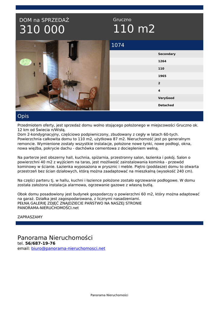 Gruczno DOM na SPRZEDAŻ 110 m2 310 000 1074 Secondary 1264 110 1965 2 4 VeryGood Detached Opis Przedmiotem oferty, jest sprzedaż domu wolno stojącego położonego w miejscowości Gruczno ok. 12 km od Świecia n/Wisłą. Dom 2-kondygnacyjny, częściowo podpiwniczony, zbudowany z cegły w latach 60-tych. Powierzchnia całkowita domu to 110 m2, użytkowa 87 m2. Nieruchomość jest po generalnym remoncie. Wymienione zostały wszystkie instalacje, położone nowe tynki, nowe podłogi, okna, nowa więźba, pokrycie dachu - dachówka cementowa z dociepleniem wełną. Na parterze jest obszerny hall, kuchnia, spiżarnia, przestronny salon, łazienka i pokój. Salon o powierzchni 40 m2 z wyjściem na taras, jest możliwość zainstalowania kominka - przewód kominowy w ścianie. Łazienka wyposażona w prysznic i meble. Piętro (poddasze) domu to otwarta przestrzeń bez ścian działowych, którą można zaadaptować na mieszkalną (wysokość 240 cm). Na części parteru tj. w hallu, kuchni i łazience położone zostało ogrzewanie podłogowe. W domu została założona instalacja alarmowa, ogrzewanie gazowe z własną butlą. Obok domu posadowiony jest budynek gospodarczy o powierzchni 60 m2, który można adaptować na garaż. Działka jest zagospodarowana, z licznymi nasadzeniami. PEŁNĄ GALERIĘ ZDJĘĆ ZNAJDZIECIE PAŃSTWO NA NASZEJ STRONIE PANORAMA-NIERUCHOMOŚCI.net ZAPRASZAMY Panorama Nieruchomości tel. 56/687-19-76 email: [email protected] Panorama Nieruchomości Powered by TCPDF (www.tcpdf.org)