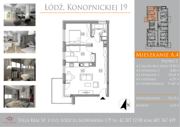 Łódź, Konopnickiej 19 Mieszkanie A.4 Piętro 2 4.2 4.3 4.4 4.5 4.1 salon+Kuchnia 19,85 m2 sypialnia 2 8,80 m2 sypialnia 1 10,65 m2 łazienka 4,29 m2 komunikacja 11,60 m2 powierzchnia balkon 55,19 m2 6,23 m2 Villa Real Sp. z o.o. Łódź ul.Słowiańska 1/9 Tel: 42 207 12 00 KOM: 601 367 439