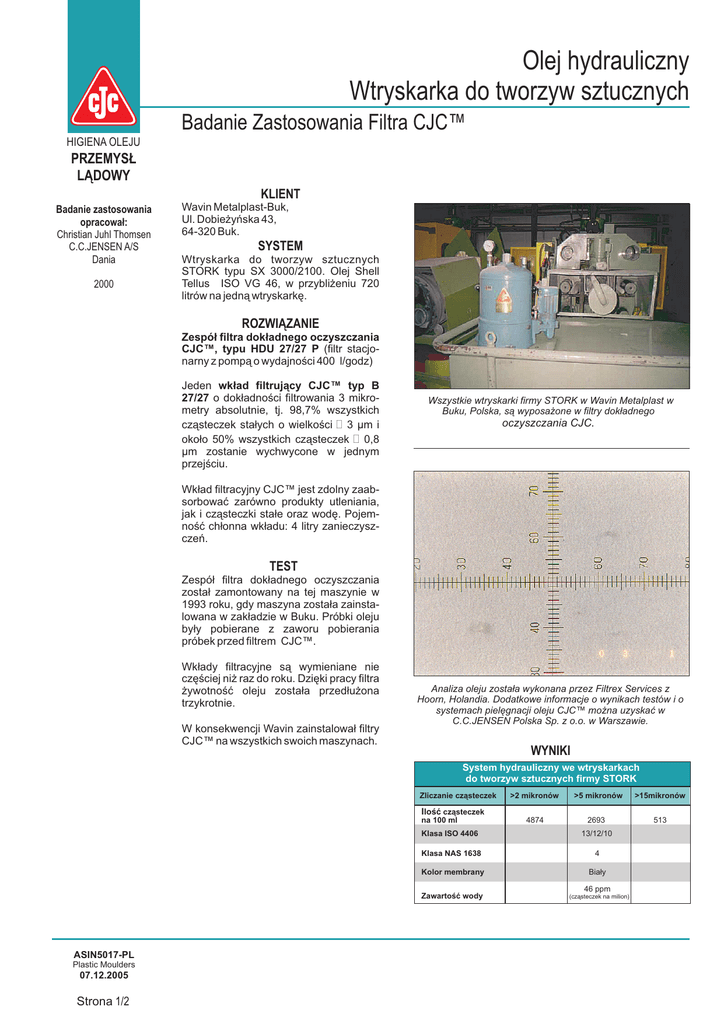 Olej hydrauliczny Wtryskarka do tworzyw sztucznych HIGIENA OLEJU Badanie Zastosowania Filtra CJC™ PRZEMYSŁ LĄDOWY KLIENT Badanie zastosowania opracował: Christian Juhl Thomsen C.C.JENSEN A/S Dania 2000 Wavin Metalplast-Buk, Ul. Dobieżyńska 43, 64-320 Buk. SYSTEM Wtryskarka do tworzyw sztucznych STORK typu SX 3000/2100. Olej Shell Tellus ISO VG 46, w przybliżeniu 720 litrów na jedną wtryskarkę. ROZWIĄZANIE Zespół filtra dokładnego oczyszczania CJC™, typu HDU 27/27 P (filtr stacjonarny z pompą o wydajności 400 l/godz) Jeden wkład filtrujący CJC™ typ B 27/27 o dokładności filtrowania 3 mikrometry absolutnie, tj. 98,7% wszystkich cząsteczek stałych o wielkości $ 3 μm i około 50% wszystkich cząsteczek $ 0,8 μm zostanie wychwycone w jednym przejściu. Wszystkie wtryskarki firmy STORK w Wavin Metalplast w Buku, Polska, są wyposażone w filtry dokładnego oczyszczania CJC. Wkład filtracyjny CJC™ jest zdolny zaabsorbować zarówno produkty utleniania, jak i cząsteczki stałe oraz wodę. Pojemność chłonna wkładu: 4 litry zanieczyszczeń. TEST Zespół filtra dokładnego oczyszczania został zamontowany na tej maszynie w 1993 roku, gdy maszyna została zainstalowana w zakładzie w Buku. Próbki oleju były pobierane z zaworu pobierania próbek przed filtrem CJC™. Wkłady filtracyjne są wymieniane nie częściej niż raz do roku. Dzięki pracy filtra żywotność oleju została przedłużona trzykrotnie. W konsekwencji Wavin zainstalował filtry CJC™ na wszystkich swoich maszynach. Analiza oleju została wykonana przez Filtrex Services z Hoorn, Holandia. Dodatkowe informacje o wynikach testów i o systemach pielęgnacji oleju CJC™ można uzyskać w C.C.JENSEN Polska Sp. z o.o. w Warszawie. WYNIKI System hydrauliczny we wtryskarkach do tworzyw sztucznych firmy STORK Zliczanie cząsteczek >2 mikronów >5 mikronów >15mikronów 2693 513 Ilość cząsteczek na 100 ml Klasa ISO 4406 4874 13/12/10 Klasa NAS 1638 4 Kolor membrany Biały 46 ppm Zawartość wody ASIN5017-PL Plastic Moulders 07.12.2005 Strona 1/2 (cząsteczek na milion) Test filtracji wykonany przez STORK PLASTICS na wtryskarkach do tworzyw sztucznych HIGIENA OLEJU Badanie Zastosowania Filtra CJC™ PRZEMYSŁ LĄDOWY WYNIKI ANALIZY WYKONANEJ PRZEZ FIRMĘ STORK Skomplikowana hydraulika nowoczesnych, wyposażonych w najnowsze zdobycze techniki wtryskarek do tworzyw sztucznych wymaga maksymalnej czystości oleju w celu zapewnienia wysokiej powtarzalności cykli pracy. Test Filtracji Godziny pracy Klasa ISO Klasa NAS 0 16/15 9 1 16/13 7 8 13/11 5 25 13/12 6 100 12/11 5 200 12/10 4 W swoim ciągłym wysiłku mającym na celu zoptymalizowanie niezawodności i powtarzalności pracy firma STORK PLASTICS przetestowała filtry bocznikowe (off-line) dokładnego oczyszczania CJC na swoich reprezentujących najwyższy poziom rozwoju wtryskarkach SX 2000/1000. Nawet najdrobniejsze cząsteczki zanieczyszczeń, cząstki stałe i woda stanowią stałe zagrożenie dla bezpieczeństwa i żywotności wrażliwych, hydraulicznych elementów wtryskarki (z olejem włącznie). Wyniki analizy oleju ze zliczaniem cząsteczek, przedstawione w klasach zanieczyszczenia (zgodnie z ISO 4406 i NAS 1638). Skutkiem tego, firma STORK PLASTICS uznała za rozsądne, zarówno pod względem ekonomicznym, jak i technicznym, zbadanie wpływu dodatkowego systemu dokładnej filtracji na maszyny SX 2000/1000. Przy przeprowadzaniu testu filtracji na SX 2000/1000 w grudniu 1992, firma STORK zdecydowała się pobierać próbki (przed filtrem) w stosunkowo krótkich odstępach czasu. Wyniki podano w górnej części następnej kolumny. STORK zaleca poziom czystości oleju ISO 16/12, NAS 6 lub lepszy dla maksymalnego bezpieczeństwa części składowych. Tak jak pokazuje wykres, ta wartość została z nawiązką osiągnięta już po 8 godzinach pracy. Po około 100 godzinach poziom czystości ustabilizował się na ISO 12/11, NAS 5-4. Taki czysty olej zapobiega nagłemu wzrostowi poziomu zanieczyszczeń wywierającemu szkodliwy wpływ na hydrauliczne części składowe i przedłuża trwałość oleju bardzo często o pięć lub więcej lat. Duża pojemność chłonna zanieczyszczeń mechanicznych i wody charakterystyczna dla wkładów filtrów CJC zapewnia, że możliwa jest do urzeczywistnienia atrakcyjna ekonomicznie eksploatacja, także w przypadku utrzymywania czystości oleju na poziomie klasy ISO 12/10. ASIN5017-PO Plastic Moulders 07.12.2005 Strona 2/2 Rozkład wielkości cząsteczek % całkowitej liczby cząsteczek Autonomiczne rozwiązanie (pracy poza linią hydrauliczną - off-line), w którym filtr dokładnego oczyszczania jest wyposażony w swoją własną pompę pracującą w oddzielnym obiegu filtracji, zostało wybrane z powodu zdolności filtra do pracy przez 24 godziny na dobę. Eksploatowanie filtra także podczas postoju głównego systemu hydraulicznego jeszcze bardziej zwiększa skuteczność filtra i skraca czas redukcji zanieczyszczeń. Jest to szczególnie ważne podczas docierania nowych maszyn, gdy poziom zanieczyszczenia ma tendencję wzrostu. Wielkość cząsteczek w µm (mikrometrach) Powyższy wykres pokazuje rozkład wielkości cząstek w typowym systemie oleju hydralicznego. C.C.JENSEN POLSKA Sp. z o.o. ul. Ludwinowska 17 • 02-856 Warszawa • Polska Tel.: +48 22 648 83 43 (38) • Fax: +48 22 648 85 69 E-mail: [email protected] Strony internetowe: www.cjc.dk