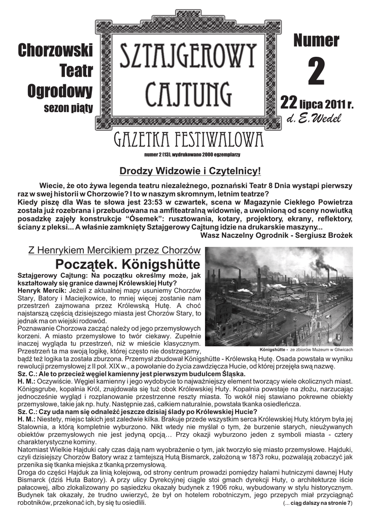 Numer Chorzowski Teatr Ogrodowy 2 22 lipca 2011 r. ¹ sezon piaty d.E.Wedel numer 2 (13), wydrukowano 2000 egzemplarzy Drodzy Widzowie i Czytelnicy! Wiecie, ¿e oto ¿ywa legenda teatru niezale¿nego, poznañski Teatr 8 Dnia wyst¹pi pierwszy raz w swej historii w Chorzowie? I to w naszym skromnym, letnim teatrze? Kiedy piszê dla Was te s³owa jest 23:53 w czwartek, scena w Magazynie Ciek³ego Powietrza zosta³a ju¿ rozebrana i przebudowana na amfiteatraln¹ widowniê, a uwolnion¹ od sceny nowiutk¹ posadzkê zajê³y konstrukcje “Ósemek”: rusztowania, kotary, projektory, ekrany, reflektory, œciany z pleksi... A w³aœnie zamkniêty Sztajgerowy Cajtung idzie na drukarskie maszyny... Wasz Naczelny Ogrodnik - Sergiusz Bro¿ek Z Henrykiem Mercikiem przez Chorzów Pocz¹tek. Königshütte Sztajgerowy Cajtung: Na pocz¹tku okreœlmy mo¿e, jak kszta³towa³y siê granice dawnej Królewskiej Huty? Henryk Mercik: Je¿eli z aktualnej mapy usuniemy Chorzów Stary, Batory i Maciejkowice, to mniej wiêcej zostanie nam przestrzeñ zajmowana przez Królewsk¹ Hutê. A choæ najstarsz¹ czêœci¹ dzisiejszego miasta jest Chorzów Stary, to jednak ma on wiejski rodowód. Poznawanie Chorzowa zacz¹æ nale¿y od jego przemys³owych korzeni. A miasto przemys³owe to twór ciekawy. Zupe³nie inaczej wygl¹da tu przestrzeñ, ni¿ w mieœcie klasycznym. Königshütte - ze zbiorów Muzeum w Gliwicach Przestrzeñ ta ma swoj¹ logikê, której czêsto nie dostrzegamy, b¹dŸ te¿ logika ta zosta³a zburzona. Przemys³ zbudowa³ Königshütte - Królewsk¹ Hutê. Osada powsta³a w wyniku rewolucji przemys³owej z II po³. XIX w., a powo³anie do ¿ycia zawdziêcza Hucie, od której przejê³a sw¹ nazwê. Sz. C.: Ale to przecie¿ wêgiel kamienny jest pierwszym budulcem Œl¹ska. H. M.: Oczywiœcie. Wêgiel kamienny i jego wydobycie to najwa¿niejszy element tworz¹cy wiele okolicznych miast. Königsgrube, kopalnia Król, znajdowa³a siê tu¿ obok Królewskiej Huty. Kopalnia powstaje na z³o¿u, narzucaj¹c jednoczeœnie wygl¹d i rozplanowanie przestrzenne reszty miasta. To wokó³ niej stawiano pokrewne obiekty przemys³owe, takie jak np. huty. Nastêpnie zaœ, ca³kiem naturalnie, powsta³a tkanka osiedleñcza. Sz. C.: Czy uda nam siê odnaleŸæ jeszcze dzisiaj œlady po Królewskiej Hucie? H. M.: Niestety, miejsc takich jest zaledwie kilka. Brakuje przede wszystkim serca Królewskiej Huty, którym by³a jej Stalownia, a któr¹ kompletnie wyburzono. Nikt wtedy nie myœla³ o tym, ¿e burzenie starych, nieu¿ywanych obiektów przemys³owych nie jest jedyn¹ opcj¹… Przy okazji wyburzono jeden z symboli miasta - cztery charakterystyczne kominy. Natomiast Wielkie Hajduki ca³y czas daj¹ nam wyobra¿enie o tym, jak tworzy³o siê miasto przemys³owe. Hajduki, czyli dzisiejszy Chorzów Batory wraz z tamtejsz¹ Hut¹ Bismarck, za³o¿on¹ w 1873 roku, pozwalaj¹ zobaczyæ jak przenika siê tkanka miejska z tkank¹ przemys³ow¹. Droga do czêœci Hajduk za lini¹ kolejow¹, od strony centrum prowadzi pomiêdzy halami hutniczymi dawnej Huty Bismarck (dziœ Huta Batory). A przy ulicy Dyrekcyjnej ci¹gle stoi gmach dyrekcji Huty, o architekturze iœcie pa³acowej, albo zlokalizowany po s¹siedzku okaza³y budynek z 1906 roku, wybudowany w stylu historycznym. Budynek tak okaza³y, ¿e trudno uwierzyæ, ¿e by³ on hotelem robotniczym, jego przepych mia³ przyci¹gn¹æ robotników, przekonaæ ich, by siê tu osiedlili. (... ci¹g dalszy na stronie 7) BEZ OGRÓDEK czyli wywiady i recenzje politycznego”. W czym dzisiaj przejawia siê ta politycznoœæ teatru? E.W.: Politycznoœæ, jako udzia³ w tworzeniu w³asnej przestrzeni, jest pojêciem ponadczasowym. Politycznoœæ to zaanga¿owanie we w³asny los i œwiat, w ¿ycie swoje, ale te¿ innych. Politycznoœæ to walka o wolnoœæ, prawo do godnego ¿ycia i swobodnego wypowiadania w³asnych pogl¹dów. A to prawie zawsze k³óci siê z interesami w³adzy... nawet w demokracji. Legendarne „Ósemki” w Chorzowie! Rozmowa z Ew¹ Wójciak, dyrektorem naczelnym i artystycznym oraz aktork¹ Teatru Ósmego Dnia Sztajgerowy Cajtung: Sk¹d najczêœciej czerpiecie inspiracje do swoich spektakli? Ewa Wójciak: Inspiruje nas nasze w³asne prze¿ywanie œwiata, obserwujemy rzeczywistoœæ wspó³czesn¹ i w niej znajdujemy tematy. Sz.C.: Pañstwa dzia³alnoœæ artystyczna ogranicza siê jedynie do tworzenia w ramach Teatru Ósmego Dnia, czy mo¿e bierzecie równie¿ udzia³ w innych projektach? E.W.: Przede wszystkim pracujemy w przestrzeni Teatru Ósmego Dnia. Robimy jednak rzeczy bardzo ró¿ne: od przedstawieñ salowych, intymnych, dziej¹cych siê w bardzo kameralnej przestrzeni, po wielkie spektakle plenerowe dla tysiêcy widzów. Bierzemy te¿ udzia³ w innych projektach, miêdzynarodowych, na przyk³ad w zesz³ym roku wspó³pracowaliœmy przy powstaniu wielkiego plenerowego widowiska z berliñsk¹ grup¹ Ramba Zamba (s³ynny niemiecki teatr niepe³nosprawnych umys³owo). Sz.C.: Teatr Ósmego Dnia znany jest równie¿ ze swojej dzia³alnoœci dydaktycznej mam tu na myœli warsztaty teatralne dla m³odzie¿y. M³ody cz³owiek XXI wieku chêtnie obcuje z teatrem? E.W.: Wbrew pozorom tak: zarówno nasze spektakle, jak i inne wydarzenia organizowane przez nas w teatrze, maj¹ g³ównie m³od¹ widowniê. Có¿, zawsze to m³odzi ludzie wykazywali najwiêksz¹ aktywnoœæ intelektualn¹, ciekawoœæ œwiata. Dlatego, myœlê, chêtnie odwiedzaj¹ teatry eksperymentalne, nie trzeba ich specjalnie organizowaæ i zachêcaæ. Sz.C.: Z dzia³alnoœci¹ Teatru Ósmego Dnia kojarzone jest nierozerwalnie pojêcie „teatru Sz.C.: Kim s¹ tytu³owi „Paranoicy i pszczelarze”, których ju¿ dziœ bêdziemy mogli zobaczyæ na scenie? E.W.: Pszczelarze to ludzie piêknie opowiadaj¹cy swoje historie, to ludzie-fundament, ci, którzy na w³asn¹ rêkê, na w³asn¹ odpowiedzialnoœæ, z godnoœci¹ i odwag¹ tworz¹ swój los, a te¿ i los naszego narodu. Paranoicy to 