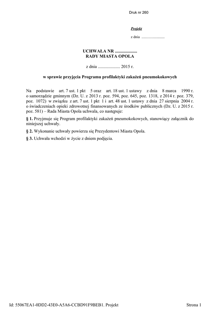 Druk nr 260 Projekt z dnia ......................... UCHWAŁA NR .................... RADY MIASTA OPOLA z dnia .................... 2015 r. w sprawie przyjęcia Programu profilaktyki zakażeń pneumokokowych Na podstawie art. 7 ust. 1 pkt 5 oraz art. 18 ust. 1 ustawy z dnia 8 marca 1990 r. o samorządzie gminnym (Dz. U. z 2013 r. poz. 594, poz. 645, poz. 1318, z 2014 r. poz. 379, poz. 1072) w związku z art. 7 ust. 1 pkt 1 i art. 48 ust. 1 ustawy z dnia 27 sierpnia 2004 r. o świadczeniach opieki zdrowotnej finansowanych ze środków publicznych (Dz. U. z 2015 r. poz. 581) – Rada Miasta Opola uchwala, co następuje: § 1. Przyjmuje się Program profilaktyki zakażeń pneumokokowych, stanowiący załącznik do niniejszej uchwały. § 2. Wykonanie uchwały powierza się Prezydentowi Miasta Opola. § 3. Uchwała wchodzi w życie z dniem podjęcia. Id: 55067EA1-0DD2-43E0-A5A6-CCBD91F9BEB1. Projekt Strona 1 Załącznik Nr 1 do Uchwały Nr .................... Rady Miasta Opola z dnia....................2015 r. PROGRAM PROFILAKTYKI ZAKAŻEŃ PNEUMOKOKOWYCH Urząd Miasta Opola Wydział Polityki Społecznej 1. Opis problemu zdrowotnego a. Problem zdrowotny Pneumokok (Streptococcus pneumoniae) jest bardzo rozpowszechnionym patogenem wywołującym zakażenia zarówno u dzieci, jak i dorosłych. Jest jedną z głównych przyczyn wywołujących zapalenie opon mózgowo-rdzeniowych u dzieci i odpowiada za największą ilość zgonów oraz powikłań neurologicznych w przebiegu tych zakażeń. Bakteria ta jest również główną przyczyną zakażeń inwazyjnych u dzieci, innych niż zapalenie opon mózgowordzeniowych, takich jak zapalenie płuc, posocznica (sepsa) oraz zakażenia nieinwazyjne – zapalenie ucha u niemowląt i zapalenie zatok u dzieci starszych. Istnieje 90 odmian pneumokoka, w tym 9 szczególnie zjadliwych, powodujących najcięższe zakażenia. Od wielu lat obserwuje się narastającą ich oporność na penicylinę. Szczepy bakterii niewrażliwe na penicylinę są często także oporne na inne antybiotyki, co w znacznym stopniu utrudnia leczenie dzieci zakażonych tą bakterią i powoduje znaczny wzrost kosztów leczenia tych zakażeń. Bakterie są przenoszone drogą kropelkową, a źródło zakażenia stanowi nosiciel. Nosicielami pneumokoków w górnych drogach oddechowych są ludzie. Nosicielstwo to jest najczęściej bezobjawowe, a dotyczy około 5-10 % zdrowych dorosłych i około 22-62 % zdrowych dzieci. Największy odsetek nosicielstwa, bo aż 80-98 %, występuje u małych dzieci od 6 miesiąca życia do 5 roku życia. Dzieci te, ze względu na niedojrzały układ immunologiczny, są szczególnie narażone na zachorowanie, a przebywanie w żłobku, przedszkolu, placówce opiekuńczo-wychowawczej, pora roku (sezon zimowy i wiosenny), nawracające zakażenia wirusowe dróg oddechowych, wcześniejsza antybiotykoterapia, złe warunki socjalne czy narażenie na dym tytoniowy potęguje to zagrożenie. b. Epidemiologia Światowa Organizacja Zdrowia alarmuje, że zakażenia pneumokokowe są jednym z najpoważniejszych problemów epidemiologicznych naszych czasów i jedną z głównych przyczyn zachorowalności i umieralności dzieci. Szacuje się, iż w wyniku chorób pneumokokowych, co roku umiera od 700.000 do 1.000.000 dzieci na świecie. Zapadalność na choroby pneumokokowe wśród dzieci poniżej 5 roku życia zróżnicowana jest pod względem kraju i regionu świata i występuje na poziomie od 188 do 6.387/100.000. Najwyższa zapadalność występuje w krajach Afryki (średnio 3.627/100.000), a najniższa w Europie (średnio 504/100.000). Umieralność z powodu chorób pneumokokowych wynosi średnio 133/100.000, przy czym najwyższa jest w Afryce (399/100.000), a najniższa w Europie (29/100.000). Id: 55067EA1-0DD2-43E0-A5A6-CCBD91F9BEB1. Projekt Strona 1 Zapadalność wśród dzieci od 0 do 23 miesiąca życia (na 100.000) na inwazyjną chorobę pneumokokową w krajach europejskich w latach 1990-2003 W Polsce ogólna częstość występowania inwazyjnej choroby pneumokokowej u dzieci jest podobna, jak w innych krajach europejskich (17,6/100.000 w grupie 0-5 lat oraz 19/100.000 w grupie 0-2 lata). Śmiertelność wywołana przez pneumokoka w zapaleniu opon mózgowordzeniowych wynosi 3,4 %. U ponad 10 % dzieci z zapaleniem opon mózgowo-rdzeniowych dochodzi do trwałych uszkodzeń w następstwie choroby. Zapadalność na inwazyjną chorobę pneumokokową w Polsce Według danych Światowej Organizacji Zdrowia liczba zachorowań spowodowanych zakażeniem pneumokokowym z roku na rok sukcesywnie rośnie. W 2010 r. w Polsce zapadło na inwazyjną chorobę pneumokokową 25 razy więcej dzieci w porównaniu z danymi z lat Id: 55067EA1-0DD2-43E0-A5A6-CCBD91F9BEB1. Projekt Strona 2 2001-2004. c. Populacja podlegająca jednostce samorządu terytorialnego i populacja kwalifikująca się do włączenia do Programu Liczba mieszkańców miasta Opola na dzień 31 maja 2015 r. to 119.445 osób. Populacja kwalifikująca się do włączenia do Programu to dzieci od 7 miesiąca życia do 48 miesiąca życia. Na terenie miasta Opola w ww. przedziale wiekowym zameldowanych jest 3.961 dzieci (według stanu na dzień 31 maja 2015 r.). d. Obecne postępowanie w omawianym problemie zdrowotnym ze szczególnym uwzględnieniem gwarantowanych świadczeń opieki zdrowotnej finansowanych ze środków publicznych Od października 2011 r., zgodnie z rozporządzeniem Ministra Zdrowia z dnia 18 sierpnia 2011 r. w sprawie obowiązkowych szczepień ochronnych (Dz. U. Nr 182, poz. 1068), szczepienia przeciwko tym bakteriom są refundowane ze środków publicznych wyłącznie u dzieci urodzonych przedwcześnie (poniżej 37 tygodnia ciąży) lub z niską masą urodzeniową (mniej niż 2.500 g), a także u dzieci do 5 roku życia z grup wysokiego ryzyka. Są to m.in. maluchy po urazach lub z wadami ośrodkowego układu nerwowego, zakażone HIV, po przeszczepieniu szpiku, przed przeszczepieniem lub po przeszczepieniu
