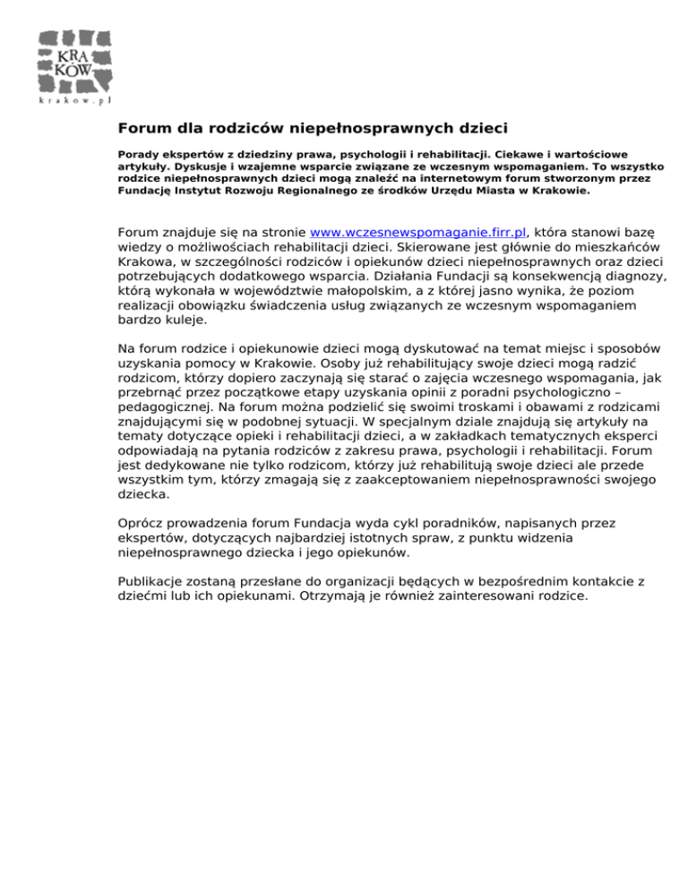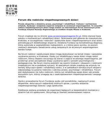 Forum dla rodziców niepełnosprawnych dzieci Porady ekspertów z dziedziny prawa, psychologii i rehabilitacji. Ciekawe i wartościowe artykuły. Dyskusje i wzajemne wsparcie związane ze wczesnym wspomaganiem. To wszystko rodzice niepełnosprawnych dzieci mogą znaleźć na internetowym forum stworzonym przez Fundację Instytut Rozwoju Regionalnego ze środków Urzędu Miasta w Krakowie. Forum znajduje się na stronie www.wczesnewspomaganie.firr.pl, która stanowi bazę wiedzy o możliwościach rehabilitacji dzieci. Skierowane jest głównie do mieszkańców Krakowa, w szczególności rodziców i opiekunów dzieci niepełnosprawnych oraz dzieci potrzebujących dodatkowego wsparcia. Działania Fundacji są konsekwencją diagnozy, którą wykonała w województwie małopolskim, a z której jasno wynika, że poziom realizacji obowiązku świadczenia usług związanych ze wczesnym wspomaganiem bardzo kuleje. Na forum rodzice i opiekunowie dzieci mogą dyskutować na temat miejsc i sposobów uzyskania pomocy w Krakowie. Osoby już rehabilitujący swoje dzieci mogą radzić rodzicom, którzy dopiero zaczynają się starać o zajęcia wczesnego wspomagania, jak przebrnąć przez początkowe etapy uzyskania opinii z poradni psychologiczno – pedagogicznej. Na forum można podzielić się swoimi troskami i obawami z rodzicami znajdującymi się w podobnej sytuacji. W specjalnym dziale znajdują się artykuły na tematy dotyczące opieki i rehabilitacji dzieci, a w zakładkach tematycznych eksperci odpowiadają na pytania rodziców z zakresu prawa, psychologii i rehabilitacji. Forum jest dedykowane nie tylko rodzicom, którzy już rehabilitują swoje dzieci ale przede wszystkim tym, którzy zmagają się z zaakceptowaniem niepełnosprawności swojego dziecka. Oprócz prowadzenia forum Fundacja wyda cykl poradników, napisanych przez ekspertów, dotyczących najbardziej istotnych spraw, z punktu widzenia niepełnosprawnego dziecka i jego opiekunów. Publikacje zostaną przesłane do organizacji będących w bezpośrednim kontakcie z dziećmi lub ich opiekunami. Otrzymają je również zainteresowani rodzice. Powered by TCPDF (www.tcpdf.org)