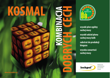 DOBRYCH CECH www.hrsmolice.pl KOMBINACJA KOSMAL wysoki plon ogólny suchej masy wysoki udział plonu suchej masy kolb substrat do produkcji biogazu wysoka zawartość suchej masy Wyłączny dystrybutor na terenie Polski Kosmal FAO 260 Zalety Kierunki użytkowania • odmiana gwarantująca bardzo wysoki plon ogólny suchej masy Charakterystyka Profil agronomiczny NOWOŚCI wzrost początkowy m m m tolerancja na suszę m m stay green mm Kolejna odmiana rodem z HR Smolice, obok znanych już odmian Vitras i Ułan, która może być uprawiana także z wykorzystaniem do biogazu. Zalecana obsada WCZESNE kiszonka 80 000 – 85 000 roślin/ha na glebach słabszych, 90 000 – 95 000 na lepszych stanowiskach glebowych Rejon uprawy kiszonka \ Plonsuchejmasyw%wzorcawlatach2011-2012 wgbadańCOBORU I, II i południowa część III rejonu uprawy kukurydzy w Polsce ŚREDNIOWCZESNE Wymagania glebowe średnie Zdrowotność Fusarium mm Plonowanie ŚREDNIOPÓŹNE W latach 2011‑2012 plon ogólny s.m. wyniósł 213,3 dt (103,3% wzorca), przy dobrym prawie 52% udziale plonu s.m. kolb i zawartości s.m. w kolbach wynoszącej 54,3% (wzorzec – 54,1%). Wyłączny dystrybutor na terenie Polski 22 Morfologia i genetyka typ odmiany: trójliniowa (TC) typ ziarna: semi dent
