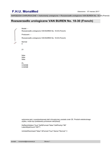 F.H.U. MonaMed Utworzono : 07 marzec 2017 NARZĘDZIA CHIRURGICZNE > Instrumenty urologiczne > Rozszerzadło urologiczne VAN BUREN No. 18-30 (French) Rozszerzadło urologiczne VAN BUREN No. 18-30 (French) Model : Rozszerzadło urologiczne VAN BUREN No. 18-30 (French) Producent : Rozszerzadło urologiczne VAN BUREN No. 18-30 (French) Normal 0 21 false false false PL X-NONE X-NONE wykonane jest z wysokostopowej stali chirurgicznej, posiada znak CE. Produkt wielokrotnego użytku, może być poddawany procesowi sterylizacji. DefSemiHidden="true" DefQFormat="false" DefPriority="99" LatentStyleCount="267"> UnhideWhenUsed="false" QFormat="true" Name="Normal" /> kontakt : - [email protected] Strona 1 F.H.U. MonaMed Utworzono : 07 marzec 2017 NARZĘDZIA CHIRURGICZNE > Instrumenty urologiczne > Rozszerzadło urologiczne VAN BUREN No. 18-30 (French) Rozszerzadło urologiczne VAN BUREN No. 18-30 (French) UnhideWhenUsed="false" QFormat="true" Name="heading 1" /> UnhideWhenUsed="false" QFormat="true" Name="Title" /> UnhideWhenUsed="false" QFormat="true" Name="Subtitle" /> UnhideWhenUsed="false" QFormat="true" Name="Strong" /> UnhideWhenUsed="false" QFormat="true" Name="Emphasis" /> UnhideWhenUsed="false" Name="Table Grid" /> UnhideWhenUsed="false" QFormat="true" Name="No Spacing" /> UnhideWhenUsed="false" Name="Light Shading" /> UnhideWhenUsed="false" Name="Light List" /> UnhideWhenUsed="false" Name="Light Grid" /> UnhideWhenUsed="false" Name="Medium Shading 1" /> UnhideWhenUsed="false" Name="Medium Shading 2" /> UnhideWhenUsed="false" Name="Medium List 1" /> UnhideWhenUsed="false" Name="Medium List 2" /> UnhideWhenUsed="false" Name="Medium Grid 1" /> UnhideWhenUsed="false" Name="Medium Grid 2" /> UnhideWhenUsed="false" Name="Medium Grid 3" /> UnhideWhenUsed="false" Name="Dark List" /> kontakt : - [email protected] Strona 2 F.H.U. MonaMed Utworzono : 07 marzec 2017 NARZĘDZIA CHIRURGICZNE > Instrumenty urologiczne > Rozszerzadło urologiczne VAN BUREN No. 18-30 (French) Rozszerzadło urologiczne VAN BUREN No. 18-30 (French) UnhideWhenUsed="false" Name="Colorful Shading" /> UnhideWhenUsed="false" Name="Colorful List" /> UnhideWhenUsed="false" Name="Colorful Grid" /> UnhideWhenUsed="false" Name="Light Shading Accent 1" /> UnhideWhenUsed="false" Name="Light List Accent 1" /> UnhideWhenUsed="false" Name="Light Grid Accent 1" /> UnhideWhenUsed="false" Name="Medium Shading 1 Accent 1" /> UnhideWhenUsed="false" Name="Medium Shading 2 Accent 1" /> UnhideWhenUsed="false" Name="Medium List 1 Accent 1" /> UnhideWhenUsed="false" QFormat="true" Name="List Paragraph" /> UnhideWhenUsed="false" QFormat="true" Name="Quote" /> UnhideWhenUsed="false" QFormat="true" Name="Intense Quote" /> UnhideWhenUsed="false" Name="Medium List 2 Accent 1" /> UnhideWhenUsed="false" Name="Medium Grid 1 Accent 1" /> UnhideWhenUsed="false" Name="Medium Grid 2 Accent 1" /> UnhideWhenUsed="false" Name="Medium Grid 3 Accent 1" /> UnhideWhenUsed="false" Name="Dark List Accent 1" /> UnhideWhenUsed="false" Name="Colorful Shading Accent 1" /> UnhideWhenUsed="false" Name="Colorful List Accent 1" /> UnhideWhenUsed="false" Name="Colorful Grid Accent 1" /> UnhideWhenUsed="false" Name="Light Shading Accent 2" /> UnhideWhenUsed="false" Name="Light List Accent 2" /> UnhideWhenUsed="false" Name="Light Grid Accent 2" /> UnhideWhenUsed="false" Name="Medium Shading 1 Accent 2" /> UnhideWhenUsed="false" Name="Medium Shading 2 Accent 2" /> UnhideWhenUsed="false" Name="Medium List 1 Accent 2" /> UnhideWhenUsed="false" Name="Medium List 2 Accent 2" /> kontakt : - [email protected] Strona 3 F.H.U. MonaMed Utworzono : 07 marzec 2017 NARZĘDZIA CHIRURGICZNE > Instrumenty urologiczne > Rozszerzadło urologiczne VAN BUREN No. 18-30 (French) Rozszerzadło urologiczne VAN BUREN No. 18-30 (French) UnhideWhenUsed="false" Name="Medium Grid 1 Accent 2" /> UnhideWhenUsed="false" Name="Medium Grid 2 Accent 2" /> UnhideWhenUsed="false" Name="Medium Grid 3 Accent 2" /> UnhideWhenUsed="false" Name="Dark List Accent 2" /> UnhideWhenUsed="false" Name="Colorful Shading Accent 2" /> UnhideWhenUsed="false" Name="Colorful List Accent 2" /> UnhideWhenUsed="false" Name="Colorful Grid Accent 2" /> UnhideWhenUsed="false" Name="Light Shading Accent 3" /> UnhideWhenUsed="false" Name="Light List Accent 3" /> UnhideWhenUsed="false" Name="Light Grid Accent 3" /> UnhideWhenUsed="false" Name="Medium Shading 1 Accent 3" /> UnhideWhenUsed="false" Name="Medium Shading 2 Accent 3" /> UnhideWhenUsed="false" Name="Medium List 1 Accent 3" /> UnhideWhenUsed="false" Name="Medium List 2 Accent 3" /> UnhideWhenUsed="false" Name="Medium Grid 1 Accent 3" /> UnhideWhenUsed="false" Name="Medium Grid 2 Accent 3" /> UnhideWhenUsed="false" Name="Medium Grid 3 Accent 3" /> UnhideWhenUsed="false" Name="Dark List Accent 3" /> UnhideWhenUsed="false" Name="Colorful Shading Accent 3" /> UnhideWhenUsed="false" Name="Colorful List Accent 3" /> UnhideWhenUsed="false" Name="Colorful Grid Accent 3" /> UnhideWhenUsed="false" Name="Light Shading Accent 4" /> UnhideWhenUsed="false" Name="Light List Accent 4" /> UnhideWhenUsed="false" Name="Light Grid Accent 4" /> UnhideWhenUsed="false" Name="Medium Shading 1 Accent 4" /> UnhideWhenUsed="false" Name="Medium Shading 2 Accent 4" /> UnhideWhenUsed="false" Name="Medium List 1 Accent 4" /> kontakt : - [email protected] Strona 4 F.H.U. MonaMed Utworzono : 07 marzec 2017 NARZĘDZIA CHIRURGICZNE > Instrumenty urologiczne > Rozszerzadło urologiczne VAN BUREN No. 18-30 (French) Rozszerzadło urologiczne VAN BUREN No. 18-30 (French) UnhideWhenUsed="false" Name="Medium List 2 Accent 4" /> UnhideWhenUsed="false" Name="Medium Grid 1 Accent 4" /> UnhideWhenUsed="false" Name="Medium Grid 2 Accent 4" /> UnhideWhenUsed="false" Name="Medium Grid 3 Accent 4" /> UnhideWhenUsed="false" Name="Dark List Accent 4" /> UnhideWhenUsed="false" Name="Colorful Shading Accent 4" /> UnhideWhenUsed="false" Name="Colorful List Accent 4" /> UnhideWhenUsed="false" Name="Colorful Grid Accent 4" /> UnhideWhenUsed
