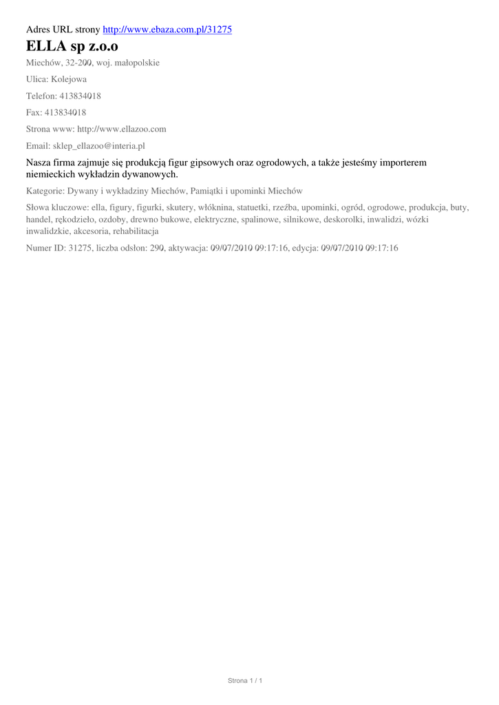 Adres URL strony http://www.ebaza.com.pl/31275 ELLA sp z.o.o Miechów, 32-200, woj. małopolskie Ulica: Kolejowa Telefon: 413834018 Fax: 413834018 Strona www: http://www.ellazoo.com Email: [email protected] Nasza firma zajmuje się produkcją figur gipsowych oraz ogrodowych, a także jesteśmy importerem niemieckich wykładzin dywanowych. Kategorie: Dywany i wykładziny Miechów, Pamiątki i upominki Miechów Słowa kluczowe: ella, figury, figurki, skutery, włóknina, statuetki, rzeźba, upominki, ogród, ogrodowe, produkcja, buty, handel, rękodzieło, ozdoby, drewno bukowe, elektryczne, spalinowe, silnikowe, deskorolki, inwalidzi, wózki inwalidzkie, akcesoria, rehabilitacja Numer ID: 31275, liczba odsłon: 290, aktywacja: 09/07/2010 09:17:16, edycja: 09/07/2010 09:17:16 Strona 1 / 1