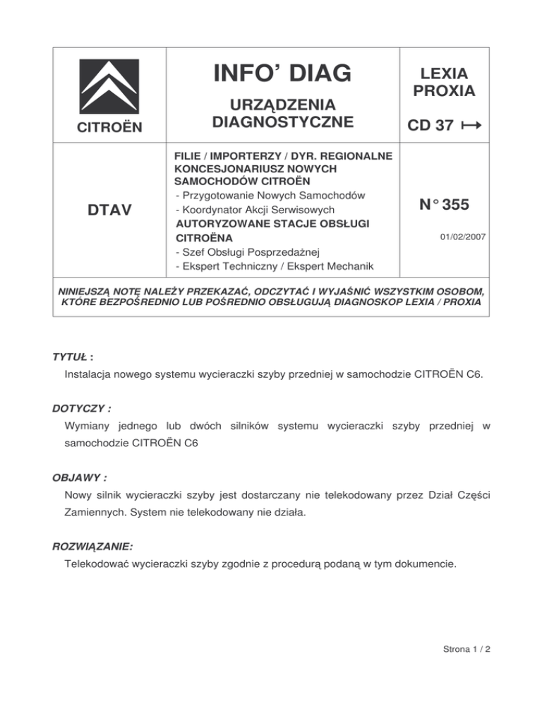 INFO’ DIAG URZ DZENIA DIAGNOSTYCZNE CITROËN DTAV FILIE / IMPORTERZY / DYR. REGIONALNE KONCESJONARIUSZ NOWYCH SAMOCHODÓW CITROËN - Przygotowanie Nowych Samochodów - Koordynator Akcji Serwisowych AUTORYZOWANE STACJE OBSŁUGI CITROËNA - Szef Obsługi Posprzeda nej - Ekspert Techniczny / Ekspert Mechanik LEXIA PROXIA CD 37 N° 355 01/02/2007 NINIEJSZ NOT NALE Y PRZEKAZA , ODCZYTA I WYJA NI WSZYSTKIM OSOBOM, KTÓRE BEZPO REDNIO LUB PO REDNIO OBSŁUGUJ DIAGNOSKOP LEXIA / PROXIA TYTUŁ : Instalacja nowego systemu wycieraczki szyby przedniej w samochodzie CITROËN C6. DOTYCZY : Wymiany jednego lub dwóch silników systemu wycieraczki szyby przedniej w samochodzie CITROËN C6 OBJAWY : Nowy silnik wycieraczki szyby jest dostarczany nie telekodowany przez Dział Cz ci Zamiennych. System nie telekodowany nie działa. ROZWI ZANIE: Telekodowa wycieraczki szyby zgodnie z procedur podan w tym dokumencie. Strona 1 / 2 OPERACJE DO WYKONANIA : • Z zastosowaniem urz dzenia LEXIA : o Wej do menu « DIAGNOSTYKA » o Wybra samochód « CITROËN C6 », nast pnie wprowadzi Nr OPR o Wej o Wybra « Wycieraczka szyby przedniej » o Przeprowadzi procedur telekodowania. do menu « INSTALOWANIE/ODINSTALOWANIE » Wył czy a nast pnie wł czy ponownie zapłon. System wycieraczki szyby przedniej powinien działa . • Z zastosowaniem urz dzenia PROXIA : o Wej do menu « TELEŁADOWANIE/TELEKODOWANIE » o Wej do menu « INSTALOWANIE/ODINSTALOWANIE » o Wybra samochód « CITROËN C6 », nast pnie wprowadzi Nr OPR o Wybra « Wycieraczka szyby przedniej » o Przeprowadzi procedur telekodowania. Wył czy a nast pnie wł czy ponownie zapłon. System wycieraczki szyby przedniej powinien działa . Strona 2 / 2