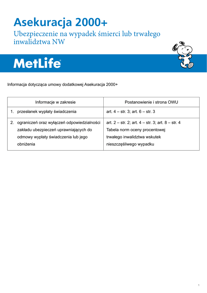 Asekuracja 2000+ Ubezpieczenie na wypadek śmierci lub trwałego inwalidztwa NW Informacja dotycząca umowy dodatkowej Asekuracja 2000+ Informacje w zakresie Postanowienie i strona OWU 1. przesłanek wypłaty świadczenia art. 4 – str. 3; art. 6 – str. 3 2. ograniczeń oraz wyłączeń odpowiedzialności art. 2 – str. 2; art. 4 – str. 3; art. 8 – str. 4 zakładu ubezpieczeń uprawniających do Tabela norm oceny procentowej odmowy wypłaty świadczenia lub jego trwałego inwalidztwa wskutek obniżenia nieszczęśliwego wypadku 1 Asekuracja 2000+ OGÓLNE WARUNKI UBEZPIECZENIA UMOWA DODATKOWA Niniejsze Ogólne Warunki Ubezpieczenia (dalej OWU) stanowią integralną część umowy ubezpieczenia i są dokumentem wiążącym strony. Znajdujące się w ramkach w treści OWU komentarze i wyjaśnienia nie stanowią treści OWU. Pełnią one jedynie funkcję informacyjną. POMOC Dla Państwa wygody wprowadziliśmy trzy rodzaje wyróżnień: Szanowni Państwo, w ramkach umieszczonych w treści OWU pojawia ją się nasze komentarze zawierające podsumowa nie najistotniejszych zagadnień. Mamy nadzieję, że SNOOPY – ambasador marki MetLife przybliży i ob jaśni Państwu trudne sformułowania użyte w OWU. Dodatkowo, słowa wyróżnione kursywą zostały zde finiowane na początku dokumentu lub w OWU umo wy podstawowej. WAŻNE Zwracamy Państwa uwagę na kluczowe kwestie dotyczące umowy dodat kowej. WYJAŚNIENIA Objaśniamy niektóre postanowienia umowy dodatkowej oraz trudne sformułowania użyte w treści OWU. PRZYKŁADY Wyjaśniamy, jak w praktyce stosowane są postanowie nia umowy dodatkowej i jakie mają znacze nie dla osoby objętej ubez pieczeniem. Drawn by LoBianco Studios for Life Advice "Protecting Your Child" Brochure 4/97 ROZDZIAŁ I. POSTANOWIENIA OGÓLNE ARTYKUŁ 1. WSTĘP 1.Niniejsze OWU mają zastosowanie do umowy dodatkowej Ubezpieczenie na wypadek śmierci lub trwałego inwalidztwa NW zawartej pomiędzy MetLife Towarzystwo Ubezpieczeń na Życie i Reasekuracji Spółka Akcyjna z siedzibą w Warszawie a Ubezpieczającym i stanowią integralną część tej umowy dodatkowej. 2. Umowa dodatkowa wraz z Tabelą norm oceny procentowej trwałego inwalidztwa wskutek nieszczęśliwego wypadku jest częścią umowy ubezpieczenia (dalej Umowa). Umowa dodatkowa obejmuje ochroną Ubezpieczonego wskazanego w Szczegółowej Umowie Ubezpieczenia, który w dniu zawarcia umowy dodatkowej ukończył 18. rok życia, a nie ukończył 61. roku życia i jest zawierana na wniosek Ubezpieczającego. Składkę należną z tytułu umowy dodatkowej określa Szczegółowa Umowa Ubezpieczenia. ARTYKUŁ 2. DEFINICJE Użyte w niniejszych OWU określenia oznaczają: 1. nieszczęśliwy wypadek (NW) – niezależne od woli Ubezpieczonego, gwałtowne i nagłe zdarzenie wywołane przyczyną zewnętrzną, niezwiązane z jakim kolwiek istniejącym stanem chorobowym, WAŻNE: Prosimy o zwrócenie uwagi, iż zdarzenia takie jak zawał serca, udar lub wylew nie są wywołane przyczyną zewnętrzną, a zatem nie są nieszczęśliwym wypadkiem w rozumieniu umowy dodatkowej. Drawn by LoBianco Studios for Life Advice "Protecting Your Child" 2. pasażerskie licencjonowane linie lotnicze – przedsiębiorstwo transportu lotniczego posiadające wszelkie zezwolenia uprawniające zarówno do regularnego, jakBrochure i na4/97 podstawie umowy czarteru, odpłatnego przewozu osób, 3.reklamacja – każde wystąpienie Ubezpieczającego, Ubezpieczonego, Uposażonego lub uprawnionego z Umowy kierowane do Towarzystwa, w którym zgłasza zastrze żenia dotyczące usług świadczonych przez Towarzystwo lub jego działalności, 4. śmierć wskutek NW – śmierć Ubezpieczonego, która nastąpiła w terminie 180 dni od daty nieszczęśliwego wypadku i której bezpośrednią i wyłączną przyczyną były fizyczne obrażenia ciała Ubezpieczonego powstałe wskutek nieszczęśliwego wypadku, 5. trwałe inwalidztwo wskutek NW – w skład którego wchodzą: a) całkowite i trwałe inwalidztwo – 100% inwalidztwo Ubezpieczonego spowodowane fizycznymi obrażeniami jego ciała powstałymi w wyniku tego samego NW, określone w Tabeli norm oceny procentowej trwałego inwalidztwa wskutek nieszczęśliwego wypadku. Obrażenia, o których mowa powyżej, muszą pozostawać bezpo średnią i wyłączną przyczyną całkowitego i trwałego inwalidztwa Ubezpieczonego, muszą być stwierdzone w ciągu 180 dni od daty NW oraz trwać przez 12 kolejnych miesięcy i w świetle aktualnej wiedzy medycznej nie rokują dalszej poprawy po zakończeniu okresu leczenia i rehabilitacji, b) częściowe i trwałe inwalidztwo – uszkodzenie ciała Ubezpieczonego powstałe w wyniku tego samego NW polegające na fizycznej, nieodwracalnej utracie funkcji narządu lub kończyny, zgodnie z warunkami umowy dodatkowej, określone w Tabeli norm oceny procentowej trwałego inwalidztwa wskutek nieszczęśliwego wypadku. Obrażenia, o których mowa powyżej, muszą pozostawać bezpośrednią i wyłączną przyczyną częściowego i trwałego inwalidztwa Ubezpieczonego, muszą być stwierdzone w ciągu 180 dni od daty NW oraz w świetle aktualnej wiedzy medycznej nie rokują dalszej poprawy po zakończeniu okresu leczenia i rehabilitacji, WYJAŚNIENIE: W przypadku utraty np. prawej dłoni Towarzystwo wypłaca świadczenie w wysokości 60% sumy ubezpieczenia. W sytuacji utraty części ciała ocena trwałości inwalidztwa i wypłata świadczenia dokonywana jest przed zakończeniem procesu leczenia i rehabilitacji. 6.wojna – zorganizowana walka zbrojna między państwami, narodami lub grupami społecznymi, religijnymi, lub operacje wojenne, lub inwazja, wrogie działania obcych państw, działania wojenne, bunt, rozruchy społeczne, zamieszki, wojna domowa, rebelia, powstanie, spisek, działania władz wojskowych lub uzurpatorskich, stan wojenny lub oblężenia, ogłoszenie lub wypowiedzenie stanu wojennego albo wojny, 7. zawody z użyciem pojazdów kołowych – rywali