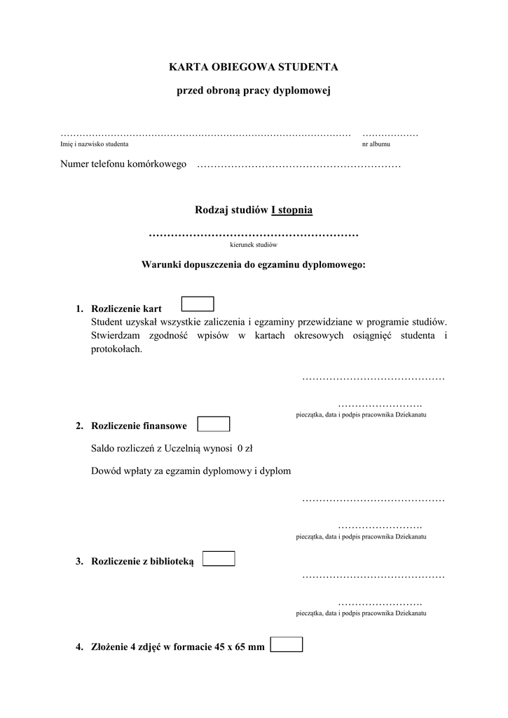 KARTA OBIEGOWA STUDENTA przed obroną pracy dyplomowej ………………………………………………………………………………… ……………… Imię i nazwisko studenta nr albumu Numer telefonu komórkowego …………………………………………………… Rodzaj studiów I stopnia ………………………………………………… kierunek studiów Warunki dopuszczenia do egzaminu dyplomowego: 1. Rozliczenie kart Student uzyskał wszystkie zaliczenia i egzaminy przewidziane w programie studiów. Stwierdzam zgodność wpisów w kartach okresowych osiągnięć studenta i protokołach. …………………………………… ……………………. pieczątka, data i podpis pracownika Dziekanatu 2. Rozliczenie finansowe Saldo rozliczeń z Uczelnią wynosi 0 zł Dowód wpłaty za egzamin dyplomowy i dyplom …………………………………… ……………………. pieczątka, data i podpis pracownika Dziekanatu 3. Rozliczenie z biblioteką …………………………………… ……………………. pieczątka, data i podpis pracownika Dziekanatu 4. Złożenie 4 zdjęć w formacie 45 x 65 mm 5. Potwierdzenie kompletności akt studenckich …………………………………… ……………………. pieczątka, data i podpis pracownika Dziekanatu 6. Potwierdzenie złożenia pracy dyplomowej 7. Praca: dwustronnie drukowany egzemplarz do akt (podpisany przez promotora) drukowane dwa egzemplarze (podpisane przez promotora) jeden egzemplarz w formie elektronicznej została złożona w dniu ………………………………………………….. …………………………………… ……………………. pieczątka, data i podpis pracownika Dziekanatu Potwierdzam spełnienie w/w wymogów. …………………………………… ……………………. pieczątka, data i podpis pracownika Dziekanatu