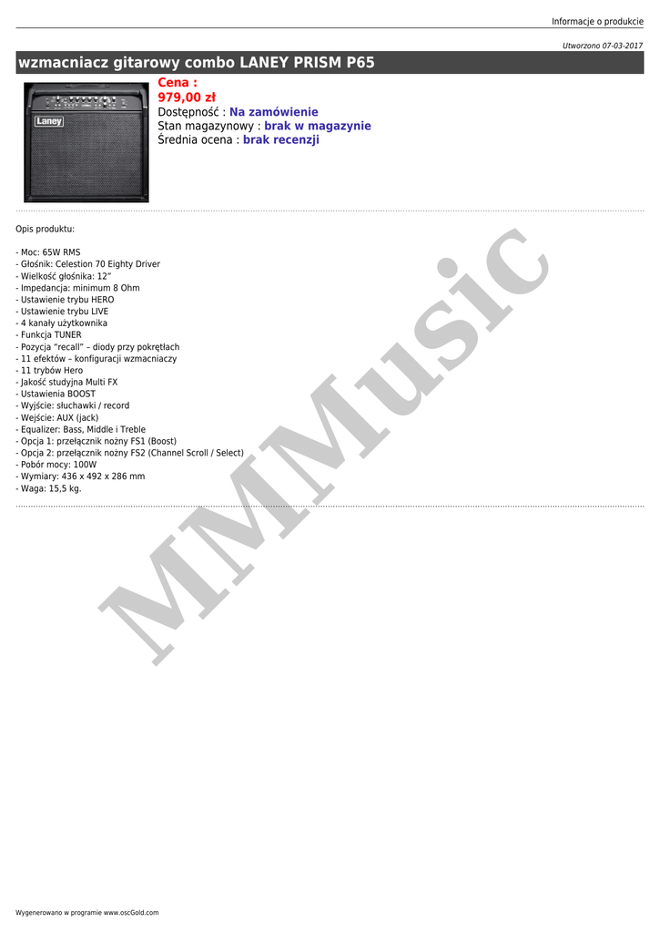 Informacje o produkcie Utworzono 07-03-2017 wzmacniacz gitarowy combo LANEY PRISM P65 Cena : 979,00 zł Dostępność : Na zamówienie Stan magazynowy : brak w magazynie Średnia ocena : brak recenzji M M us M - Moc: 65W RMS - Głośnik: Celestion 70 Eighty Driver - Wielkość głośnika: 12” - Impedancja: minimum 8 Ohm - Ustawienie trybu HERO - Ustawienie trybu LIVE - 4 kanały użytkownika - Funkcja TUNER - Pozycja “recall” – diody przy pokrętłach - 11 efektów – konfiguracji wzmacniaczy - 11 trybów Hero - Jakość studyjna Multi FX - Ustawienia BOOST - Wyjście: słuchawki / record - Wejście: AUX (jack) - Equalizer: Bass, Middle i Treble - Opcja 1: przełącznik nożny FS1 (Boost) - Opcja 2: przełącznik nożny FS2 (Channel Scroll / Select) - Pobór mocy: 100W - Wymiary: 436 x 492 x 286 mm - Waga: 15,5 kg. ic Opis produktu: Wygenerowano w programie www.oscGold.com