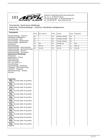 Miejskie Przedsiębiorstwo Komunikacyjne Sp. z o. o. w Nowym Sączu 33-310 Nowy Sącz, ul. Wyspiańskiego 22 tel. 18 443 88 97 www.mpk.sacz.pl 101 Przystanek: Kazimierza Wielkiego Kierunek: Prażmowskiego - Centrum Handlowe Gołąbkowice Ważny od: Przystanki Godz Prażmowskiego - Centrum Handlowe Gołąbkowice Sucharskiego - LIDL Sucharskiego - Westerplatte Sucharskiego - Batalionów Chłopskich Broniewskiego Paderewskiego - Naściszowska Paderewskiego - Kochanowskiego Paderewskiego - Romera Paderewskiego - Tarnowska Kazimierza Wielkiego Kościuszki Jagiellońska - Planty Aleja Wolności Aleja Batorego Dw. Aut. MPK st. 3 Łukasińskiego Łukasińskiego - Kotłownia I Brygady - Wiśniowieckiego Freislera - Traugutta Wiśniowieckiego - Osiedle Stramki Legenda: Wig - Kursuje (Wigilia) Wig - Kursuje (Wigilia) Wig - Kursuje (Wigilia) Wig - Kursuje (Wigilia) Wig - Kursuje (Wigilia) Wig - Kursuje (Wigilia) Wig - Kursuje (Wigilia) Wig - Kursuje (Wigilia) Wig - Kursuje (Wigilia) Wig - Kursuje (Wigilia) Wig - Kursuje (Wigilia) Wig - Kursuje (Wigilia) Wig - Kursuje (Wigilia) Wig - Kursuje (Wigilia) Dni robocze Godz Soboty Godz 18 18 09 Wig, 39 Wig 18 19 19 10 Wig, 40 Wig 19 20 20 10 Wig, 40 Wig 20 Niedziele 21 40 21 10 Wig, 40 21 40 22 09, 44 22 09, 44 22 09, 44 23 14, 44 23 14, 44 23 14, 44 tylko 24 grudnia tylko 24 grudnia tylko 24 grudnia tylko 24 grudnia tylko 24 grudnia tylko 24 grudnia tylko 24 grudnia tylko 24 grudnia tylko 24 grudnia tylko 24 grudnia tylko 24 grudnia tylko 24 grudnia tylko 24 grudnia tylko 24 grudnia 1/1 Powered by TCPDF (www.tcpdf.org)
