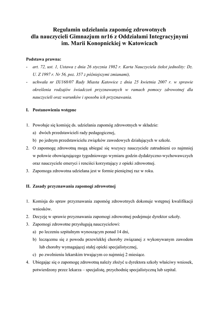 Regulamin udzielania zapomóg zdrowotnych dla nauczycieli Gimnazjum nr16 z Oddziałami Integracyjnymi im. Marii Konopnickiej w Katowicach Podstawa prawna: - art. 72, ust. 1, Ustawa z dnia 26 stycznia 1982 r. Karta Nauczyciela (tekst jednolity: Dz. U. Z 1997 r. Nr 56, poz. 357 z późniejszymi zmianami), - uchwała nr IX/168/07 Rady Miasta Katowice z dnia 25 kwietnia 2007 r. w sprawie określenia rodzajów świadczeń przyznawanych w ramach pomocy zdrowotnej dla nauczycieli oraz warunków i sposobu ich przyznawania. I. Postanowienia wstępne 1. Powołuje się komisję ds. udzielania zapomóg zdrowotnych w składzie: a) dwóch przedstawicieli rady pedagogicznej, b) po jednym przedstawicielu związków zawodowych działających w szkole. 2. O zapomogę zdrowotną mogą ubiegać się wszyscy nauczyciele zatrudnieni co najmniej w połowie obowiązującego tygodniowego wymiaru godzin dydaktyczno-wychowawczych oraz nauczyciele emeryci i renciści korzystający z opieki zdrowotnej. 3. Zapomoga zdrowotna udzielana jest w formie pienięŜnej raz w roku. II. Zasady przyznawania zapomogi zdrowotnej 1. Komisja do spraw przyznawania zapomóg zdrowotnych dokonuje wstępnej kwalifikacji wniosków. 2. Decyzję w sprawie przyznawania zapomogi zdrowotnej podejmuje dyrektor szkoły. 3. Zapomogi zdrowotne przysługują nauczycielowi: a) po leczeniu szpitalnym wynoszącym ponad 14 dni, b) leczącemu się z powodu przewlekłej choroby związanej z wykonywanym zawodem lub choroby wymagającej stałej opieki specjalistycznej, c) po zwolnieniu lekarskim trwającym co najmniej 2 miesiące. 4. Ubiegając się o zapomogę zdrowotną naleŜy złoŜyć u dyrektora szkoły właściwy wniosek, potwierdzony przez lekarza – specjalistę, przychodnię specjalistyczną lub szpital. 5. Do wniosku naleŜy dołączyć dokumenty poświadczające wydatki poniesione na leczenie, na zakup lekarstw, oświadczenie o wysokości miesięcznych dochodów przypadających na jednego członka rodziny, obliczane na podstawie wysokości dochodów uzyskanych w okresie 3 miesięcy poprzedzających złoŜenie wniosku. 6. Wysokość zapomogi zdrowotnej proponuje komisja ds. przyznawania zapomóg zdrowotnych, natomiast decyzję podejmuje dyrektor szkoły. 7. Dołączone rachunki za lekarstwa muszą posiadać datę roku kalendarzowego, w którym złoŜony jest wniosek. 8. Posiedzenia komisja ds. zapomóg zdrowotnych odbywają się dwa razy w roku. 9. W pierwszej kolejności rozpatrywane będą wnioski po leczeniu szpitalnym oraz zwolnieniu lekarskim trwającym co najmniej 2 miesiące. 10. W następnej kolejności wnioski osób, które jeszcze nie korzystały z zapomóg zdrowotnych lub korzystały 3 lata wstecz. 11. Ograniczona ilość funduszy na ten cel nie pozwala zrealizować wszystkich złoŜonych wniosków. III. Postanowienia końcowe Regulamin wchodzi w Ŝycie z dniem: ………………………….. Podpis komisji: ……………………………… ……………………………. ……………………………… …………………………….
