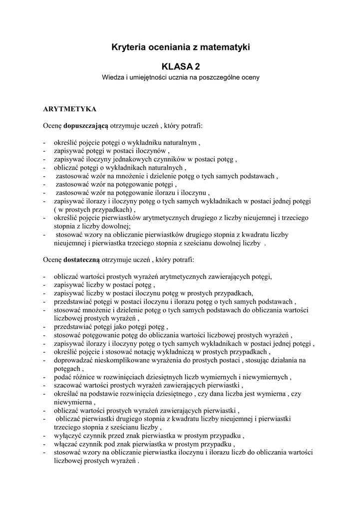 Kryteria oceniania z matematyki KLASA 2 Wiedza i umiejętności ucznia na poszczególne oceny ARYTMETYKA Ocenę dopuszczającą otrzymuje uczeń , który potrafi: - określić pojęcie potęgi o wykładniku naturalnym , zapisywać potęgi w postaci iloczynów , zapisywać iloczyny jednakowych czynników w postaci potęg , obliczać potęgi o wykładnikach naturalnych , zastosować wzór na mnożenie i dzielenie potęg o tych samych podstawach , zastosować wzór na potęgowanie potęgi , zastosować wzór na potęgowanie ilorazu i iloczynu , zapisywać ilorazy i iloczyny potęg o tych samych wykładnikach w postaci jednej potęgi ( w prostych przypadkach) , określić pojęcie pierwiastków arytmetycznych drugiego z liczby nieujemnej i trzeciego stopnia z liczby dowolnej; stosować wzory na obliczanie pierwiastków drugiego stopnia z kwadratu liczby nieujemnej i pierwiastka trzeciego stopnia z sześcianu dowolnej liczby . Ocenę dostateczną otrzymuje uczeń , który potrafi: - obliczać wartości prostych wyrażeń arytmetycznych zawierających potęgi, zapisywać liczby w postaci potęg , zapisywać liczby w postaci iloczynu potęg w prostych przypadkach, przedstawiać potęgi w postaci iloczynu i ilorazu potęg o tych samych podstawach , stosować mnożenie i dzielenie potęg o tych samych podstawach do obliczania wartości liczbowej prostych wyrażeń , przedstawiać potęgi jako potęgi potęg , stosować potęgowanie potęg do obliczania wartości liczbowej prostych wyrażeń , zapisywać ilorazy i iloczyny potęg o tych samych wykładnikach w postaci jednej potęgi , określić pojęcie i stosować notację wykładniczą w prostych przypadkach , doprowadzać nieskomplikowane wyrażenia do prostych postaci , stosując działania na potęgach , podać różnice w rozwinięciach dziesiętnych liczb wymiernych i niewymiernych , szacować wartości prostych wyrażeń zawierających pierwiastki , określać na podstawie rozwinięcia dziesiętnego , czy dana liczba jest wymierna , czy niewymierna , obliczać wartości prostych wyrażeń zawierających pierwiastki , obliczać pierwiastki drugiego stopnia z kwadratu liczby nieujemnej i pierwiastki trzeciego stopnia z sześcianu liczby , wyłączyć czynnik przed znak pierwiastka w prostym przypadku , włączać czynnik pod znak pierwiastka w prostym przypadku , stosować wzory na obliczanie pierwiastka iloczynu i ilorazu liczb do obliczania wartości liczbowej prostych wyrażeń . Ocenę dobrą otrzymuje uczeń , który potrafi: - zapisywać liczby w postaci iloczynu potęg , obliczać wartości wyrażeń arytmetycznych zawierających potęgi , stosować mnożenie i dzielenie potęg o tych samych podstawach do obliczania wartości liczbowej wyrażeń , porównywać potęgi , sprowadzając je do tych samych podstaw , stosować potęgowanie potęg do obliczania wartości liczbowej wyrażeń , doprowadzać wyrażenia do prostych postaci , stosując działania na potęgach , określić pojęcie potęgi o wykładniku całkowitym ujemnym , obliczyć potęgę o wykładniku całkowitym ujemnym , obliczać wartości wyrażeń arytmetycznych zawierających potęgi o wykładniku całkowitym , zapisywać liczby w notacji wykładniczej , wykonywać porównywanie ilorazowe liczb podanych w notacji wykładniczej , szacować wartości wyrażeń zawierających pierwiastki , obliczać wartości wyrażeń zawierających pierwiastki , wyłączyć czynnik przed znak pierwiastka , włączać czynnik pod znak pierwiastka , stosować wzory na obliczanie pierwiastka iloczynu i ilorazu liczb do obliczania wartości liczbowej wyrażeń , wykonywać działania na liczbach niewymiernych , usuwać niewymierność z mianownika ułamka , korzystając z własności pierwiastków , doprowadzać wyrażenia algebraiczne zawierające potęgi i pierwiastki do prostszej postaci. Ocenę bardzo dobrą otrzymuje uczeń , który potrafi: - obliczać wartości wyrażeń arytmetycznych zawierających potęgi , doprowadzać wyrażenia do prostszej postaci , stosując działania na potęgach , wykonywać porównania ilorazowe potęg o wykładnikach ujemnych , wykonywać działania na potęgach o wykładnikach całkowitych , stosować działania na potęgach w prostych zadaniach tekstowych , obliczać wartości bardziej skomplikowanych wyrażeń arytmetycznych zawierających pierwiastki , wykonywać działania na liczbach niewymiernych , porównywać pierwiastki , podnosząc je do odpowiedniej potęgi , doprowadzać wyrażenia algebraiczne zawierające potęgi i pierwiastki do prostszej postaci. Ocenę celującą otrzymuje uczeń , który potrafi: - stosować działania na potęgach w zadaniach tekstowych , obliczać wartości bardziej skomplikowanych wyrażeń arytmetycznych zawierających pierwiastki i usuwając niewymierności z mianowników; usuwać niewymierność z mianowników, w których są pierwiastki różnych stopni , doprowadzać złożone wyrażenia algebraiczne zawierające potęgi i pierwiastki do prostszej postaci. GEOMETRIA Ocenę dopuszczającą otrzymuje uczeń , który potrafi: - - podać wzór na obliczanie długości okręgu , podać wartość przybliżoną liczby , obliczyć długość okręgu mając dany jego promień , podać wzór na obliczanie pola koła , obliczyć pole koła mając dany jego promień, określić pojęcie kąta środkowego, określić pojęcie łuku i wycinka koła , obliczyć długość łuku jako części okręgu , obliczyć pole wycinka koła jako części określonego koła , podać treść twierdzenia Pitagorasa , obliczać długość przeciwprostokątnej , korzystając z twierdzenia Pitagorasa , podać treść twierdzenia odwrotnego do twierdzenia Pitagorasa , sprawdzić , czy trójkąty o podanych długościach boków są prostokątne ( gdy długość wyrażona jest liczbą całkowitą ) , wskazywać trójkąty prostokątne w figurze , odczytywać odległości między punktami o równych odciętych lub rzędnych , obliczyć długość