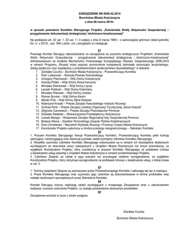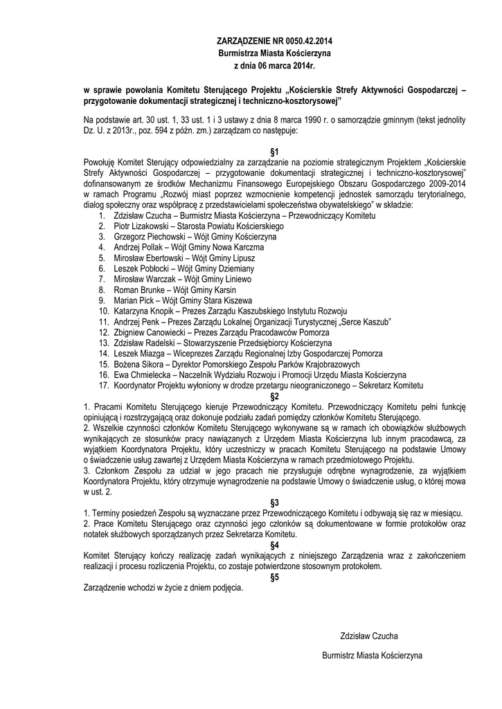 ZARZĄDZENIE NR 0050.42.2014 Burmistrza Miasta Kościerzyna z dnia 06 marca 2014r. w sprawie powołania Komitetu Sterującego Projektu „Kościerskie Strefy Aktywności Gospodarczej – przygotowanie dokumentacji strategicznej i techniczno-kosztorysowej” Na podstawie art. 30 ust. 1, 33 ust. 1 i 3 ustawy z dnia 8 marca 1990 r. o samorządzie gminnym (tekst jednolity Dz. U. z 2013r., poz. 594 z późn. zm.) zarządzam co następuje: §1 Powołuję Komitet Sterujący odpowiedzialny za zarządzanie na poziomie strategicznym Projektem „Kościerskie Strefy Aktywności Gospodarczej – przygotowanie dokumentacji strategicznej i techniczno-kosztorysowej” dofinansowanym ze środków Mechanizmu Finansowego Europejskiego Obszaru Gospodarczego 2009-2014 w ramach Programu „Rozwój miast poprzez wzmocnienie kompetencji jednostek samorządu terytorialnego, dialog społeczny oraz współpracę z przedstawicielami społeczeństwa obywatelskiego” w składzie: 1. Zdzisław Czucha – Burmistrz Miasta Kościerzyna – Przewodniczący Komitetu 2. Piotr Lizakowski – Starosta Powiatu Kościerskiego 3. Grzegorz Piechowski – Wójt Gminy Kościerzyna 4. Andrzej Pollak – Wójt Gminy Nowa Karczma 5. Mirosław Ebertowski – Wójt Gminy Lipusz 6. Leszek Pobłocki – Wójt Gminy Dziemiany 7. Mirosław Warczak – Wójt Gminy Liniewo 8. Roman Brunke – Wójt Gminy Karsin 9. Marian Pick – Wójt Gminy Stara Kiszewa 10. Katarzyna Knopik – Prezes Zarządu Kaszubskiego Instytutu Rozwoju 11. Andrzej Penk – Prezes Zarządu Lokalnej Organizacji Turystycznej „Serce Kaszub” 12. Zbigniew Canowiecki – Prezes Zarządu Pracodawców Pomorza 13. Zdzisław Radelski – Stowarzyszenie Przedsiębiorcy Kościerzyna 14. Leszek Miazga – Wiceprezes Zarządu Regionalnej Izby Gospodarczej Pomorza 15. Bożena Sikora – Dyrektor Pomorskiego Zespołu Parków Krajobrazowych 16. Ewa Chmielecka – Naczelnik Wydziału Rozwoju i Promocji Urzędu Miasta Kościerzyna 17. Koordynator Projektu wyłoniony w drodze przetargu nieograniczonego – Sekretarz Komitetu §2 1. Pracami Komitetu Sterującego kieruje Przewodniczący Komitetu. Przewodniczący Komitetu pełni funkcję opiniującą i rozstrzygającą oraz dokonuje podziału zadań pomiędzy członków Komitetu Sterującego. 2. Wszelkie czynności członków Komitetu Sterującego wykonywane są w ramach ich obowiązków służbowych wynikających ze stosunków pracy nawiązanych z Urzędem Miasta Kościerzyna lub innym pracodawcą, za wyjątkiem Koordynatora Projektu, który uczestniczy w pracach Komitetu Sterującego na podstawie Umowy o świadczenie usług zawartej z Urzędem Miasta Kościerzyna w ramach przedmiotowego Projektu. 3. Członkom Zespołu za udział w jego pracach nie przysługuje odrębne wynagrodzenie, za wyjątkiem Koordynatora Projektu, który otrzymuje wynagrodzenie na podstawie Umowy o świadczenie usług, o której mowa w ust. 2. §3 1. Terminy posiedzeń Zespołu są wyznaczane przez Przewodniczącego Komitetu i odbywają się raz w miesiącu. 2. Prace Komitetu Sterującego oraz czynności jego członków są dokumentowane w formie protokołów oraz notatek służbowych sporządzanych przez Sekretarza Komitetu. §4 Komitet Sterujący kończy realizację zadań wynikających z niniejszego Zarządzenia wraz z zakończeniem realizacji i procesu rozliczenia Projektu, co zostaje potwierdzone stosownym protokołem. §5 Zarządzenie wchodzi w życie z dniem podjęcia. Zdzisław Czucha Burmistrz Miasta Kościerzyna