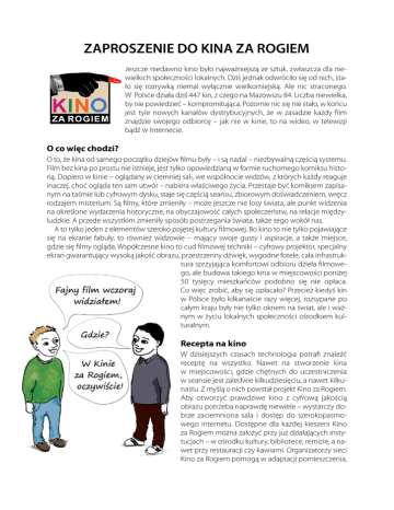 ZAPROSZENIE DO KINA ZA ROGIEM Jeszcze niedawno kino było najważniejszą ze sztuk, zwłaszcza dla niewielkich społeczności lokalnych. Dziś jednak odwróciło się od nich, stało się rozrywką niemal wyłącznie wielkomiejską. Ale nic straconego. W Polsce działa dziś 447 kin, z czego na Mazowszu 84. Liczba niewielka, by nie powiedzieć – kompromitująca. Pozornie nic się nie stało, w końcu jest tyle nowych kanałów dystrybucyjnych, że w zasadzie każdy film znajdzie swojego odbiorcę – jak nie w kinie, to na wideo, w telewizji bądź w Internecie. O co więc chodzi? O to, że kina od samego początku dziejów filmu były – i są nadal – niezbywalną częścią systemu. Film bez kina po prostu nie istnieje, jest tylko opowiedzianą w formie ruchomego komiksu historią. Dopiero w kinie – oglądany w ciemniej sali, we wspólnocie widzów, z których każdy reaguje inaczej, choć ogląda ten sam utwór – nabiera właściwego życia. Przestaje być komiksem zapisanym na taśmie lub cyfrowym dysku, staje się częścią seansu, zbiorowym doświadczeniem, wręcz rodzajem misterium. Są filmy, które zmieniły – może jeszcze nie losy świata, ale punkt widzenia na określone wydarzenia historyczne, na obyczajowość całych społeczeństw, na relacje międzyludzkie. A przede wszystkim zmieniły sposób postrzegania świata, także tego wokół nas. A to tylko jeden z elementów szeroko pojętej kultury filmowej. Bo kino to nie tylko pojawiające się na ekranie fabuły, to również widzowie – mający swoje gusty i aspiracje, a także miejsce, gdzie się filmy ogląda. Współczesne kino to cud filmowej techniki – cyfrowy projektor, specjalny ekran gwarantujący wysoką jakość obrazu, przestrzenny dźwięk, wygodne fotele, cała infrastruktura sprzyjająca komfortowi odbioru dzieła filmowego, ale budowa takiego kina w miejscowości poniżej 50 tysięcy mieszkańców podobno się nie opłaca. Co więc zrobić, aby się opłacało? Przecież kiedyś kin w Polsce było kilkanaście razy więcej, rozsypane po całym kraju były nie tylko oknem na świat, ale i ważnym w życiu lokalnych społeczności ośrodkiem kulturalnym. Recepta na kino W dzisiejszych czasach technologia potrafi znaleźć receptę na wszystko. Nawet na stworzenie kina w miejscowości, gdzie chętnych do uczestniczenia w seansie jest zaledwie kilkudziesięciu, a nawet kilkunastu. Z myślą o nich powstał projekt Kino za Rogiem. Aby otworzyć prawdziwe kino z cyfrową jakością obrazu potrzeba naprawdę niewiele – wystarczy dobrze zaciemniona sala i dostęp do szerokopasmowego internetu. Dostępne dla każdej kieszeni Kino za Rogiem można założyć przy już działających instytucjach – w ośrodku kultury, bibliotece, remizie, a nawet przy restauracji czy kawiarni. Organizatorzy sieci Kino za Rogiem pomogą w adaptacji pomieszczenia, w doborze wyposażenia, a także zapewnią bogatą ofertą atrakcyjnych tytułów dla każdego. Jednak sukces zależy od operatywności prowadzącego kino – liczby projekcji i doboru repertuaru. Krajowa Izba Gospodarcza Elektroniki i Telekomunikacji (KIGEiT) ogłosiła właśnie konkurs ofert na „Kino za Rogiem”. Każda instytucja, która do 30.08.14 r. zdecyduje się na prowadzenie takiego kina przeznaczonego dla miłośników filmu, przyjaciół i sąsiadów, może zgłosić się do KIGEiT i wziąć udział w konkursie. Nagrodą jest wszechstronna pomoc (także materialna) w zorganizowaniu Kina za Rogiem. Konkurs został zorganizowany w ramach projektu „Stworzenie powiązania kooperacyjnego: Mazowiecki Klaster – Małe Kina Społecznościowe (MKS)”, współfinansowanego z Europejskiego Funduszu Rozwoju Regionalnego w ramach Priorytetu I „Tworzenie warunków dla rozwoju potencjału innowacyjnego i przedsiębiorczości na Mazowszu” oraz Regionalnego Programu Operacyjnego Województwa Mazowiecekigo 2007–2013. Stawka jest wysoka Ideą sieci Kino z Rogiem jest zaproponowanie alternatywy kulturowej, która wykorzystując potencjał technologii cyfrowych, pozwala na integrację małych grup towarzyskich czy grona przyjaciół wokół polskiej i światowej sztuki filmowej. A właściciel kina może liczyć na wdzięczność prawdziwych kinomanów, podziw sąsiadów i świadomość, że kiedy ktoś z nich stwierdzi „Fajny film wczoraj widziałem!”, nikt nie zapyta „Gdzie?”, bo odpowiedź będzie zawsze taka sama: „W Kinie za Rogiem, oczywiście!” Kino za Rogiem, fot. Ze zbiorów KzR Klimatyczne Kino za Rogiem, fot. Kuba Kiljan/Kuźnia Zapraszamy wszystkich zainteresowanych do udziału w Konkursie! Regulamin Konkursu, formularz zgłoszeniowy oraz wymagane załączniki dostępne są na stronie internetowej www.kigeit.pl oraz www.kinozarogiem.pl.
