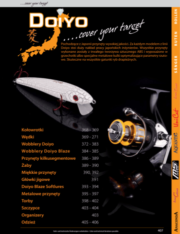 e v o c . . .. Pochodzące z Japonii przynęty wysokiej jakości. Za każdym modelem z linii Doiyo stoi duży nakład pracy japońskich inżynierów. Wszystkie przynęty wykonane zostały z trwałego tworzywa sztucznego ABS i wyposażone w grzechotki albo specjalne metalowe kulki optymalizujące parametry rzutowe. Skuteczne na wszystkie gatunki ryb drapieżnych. Kołowrotki 368 - 369 Wędki 369 - 271 Wobblery Doiyo 372 - 383 Wobblery Doiyo Blaze 384 - 385 Przynęty kilkusegmentowe 386 - 389 Żaby 389 - 390 Miękkie przynęty Główki jigowe 390, 392 393 - 394 Metalowe przynęty 395 - 397 Torby 398 - 402 Szczypce 403 - 404 Odzież ® 391 Doiyo Blaze Softlures Organizery RUTEN t e g r a t r your SÄNGER Doiyo ROLLEN ...cover your target 403 405 - 406 Farb- und technische Änderungen vorbehalten - Color and technical Variations possible 407 ROLLEN SÄNGER RUTEN t e g r a t r ver you ....co Mikata II Jig Tak jak zapowiada to nazwa, te kołowrotki najlepiej sprawdzają się w połączeniu z przynętami Doiyo Skirted Jig. Ponieważ dostępne są w dwóch mniejszych rozmiarach 1000 i 2000, przeznaczone są do łowienia na lżejsze zestawy. Gumowy pierścień na aluminiowej szpuli zapobiega prześligiwaniu się plecionki pod szpulę. Dzięki płaskiej szpuli i gumowemu pierścieniowi nawijanie nawet bardzo cieńkich plecionek przebiega wyjątkowo płynnie. art.-nr model waga przeł. pojemność 2717 110 1000 214 g 5,2 : 1 110 m / 0,165 mm 2717 120 2000 291 g 5,2 : 1 120 m / 0,205 mm nakuma CX Długo oczekiwany multiplikator w ofercie Doiyo. Nakuma CX to nie tylko świetny wygląd, ale także doskonałe wyposażenie: 13 + 1 łożysk kulkowych i przełożenie High Speed 7.2:1. Pomimo niedużej wagi własnej jest bardzo wytrzymały. • 13 + 1 łożysk kulkowych • 100% Carbon Handle • przekładnia Hard-Aluminium • High Speed 7,2 : 1 i 13 Art.-Nr model waga przeł. pojemność 2732 900 Nakuma CX 162 g 7,2 : 1 260 m / 0,20 mm 408 Alle Preise per Stück oder per SB - All prices per piece or per pack 7,2 : 1 High Speed ...cover your target ROLLEN Mikata S II SÄNGER RUTEN Bardzo udany model Doiyo Mikata S został zastąpiony przez Mikata S II. Zmieniono i ulepszono obudowę, przekładnię i kilka innych drobiazgów, dzięki czemu np. obudowa jest odporna na uderzenia, a przekładnia dysponuje większą mocą. Mimo poprawek utrzymaliśmy korzystną cenę poprzedniego modelu! Art.-Nr model waga przeł. pojemność 2717 510 1000 235 g 5,1 : 1 125 m / 0,20 mm 2717 520 2000 250 g 5,1 : 1 195 m / 0,20 mm 2717 530 3000 280 g 5,1 : 1 170 m / 0,30 mm 2717 540 4000 295 g 5,1 : 1 145 m / 0,35 mm Doiyo Yujin NX to model bardzo minimalistyczny, ale nie zapomnieliśmy o ważnych parametrach takich jak blank z włókna węglowego, wysokiej jakości przelotkach SIC i dobrej klasy uchwycie na kołowrotek. W odróżnieniu od poprzedniej serii, dostępna jest jeszcze jedna długość. Tak jak wcześniej bardzo dobry stosunek ceny do jakości. Art.-Nr dł. dł. trans. elem. waga ciężar rzut. 1,98 m 102 cm 2 82 g 3 - 12 g 2,13 m 110 cm 2 102 g 6 - 16 g 5638 228 2,28 m 119 cm 2 118 g 12 - 24 g ® 5638 198 5638 213 Farb- und technische Änderungen vorbehalten - Color and technical Variations possible 409 ROLLEN RUTEN SÄNGER Ninjin Kompletnie zmieniona seria wędek Doiyo Ninjin składa się teraz z 5 różnych modeli (3 na kołowrotek ze stałą szpulą, 2 na multiplikator). Blanki wędek Ninjin NX wykonane są z 30-T włókna węglowego. Przelotki zaopatrzone we wkładki SIC o konstrukcji Tangle Free zapobiegają plątaniu się żylki. Ninjin Art.-Nr dł. 5644 198 1,98 m dł. trans. elem. waga ciężar rzut. 104 cm 2 135 g 17 - 42 g 5644 228 2,28 m 117 cm 2 164 g 25 - 55 g Ninjin Art.-Nr dł. 5644 193 1,93 m 102 cm 2 112 g 5644 213 2,13 m 110 cm 2 135g 8 - 25 g 5644 262 2,62 m 138 cm 2 188 g 28 - 52 g 410 dł. trans. elem. waga ciężar rzut. 7 - 22 g Alle Preise per Stück oder per SB - All prices per piece or per pack RUTEN Wędki Doiyo Daikon wykonane są z 30- i 40-T włókna węglowego i w całości wyposażone w komponenty Fuji, a także nowe przelotki K-Guides. Wędki najwyższej klasy w ofercie Doiyo dostępne w 5 modelach - 2 na multiplikator, 3 na kołowrotek ze stałą szpulą. Każdy model ma swoje specjalne przeznaczenie, np. CD-X 228 świetnie sprawdzi się podczas łowienia z użyciem przynęt spinningowych Ikasama, ale również jako szybka wędka do metody Twitch. SD-X 203 dopasowana jest do przynęt Kentoka, Sukato i innych z tej serii. SD-X 243 służy do połowów z gumowymi przynętami jak Togari 10cm, Yakusha 10cm itd., ale także mniejszymi, twardymi przynętami jak Nomin albo Sokai Ukabu. CD-X 213 to wędka na cięższe twarde przynęty, takie jak np. Kunshu 140 Hiratai i Yuragu 115. Na końcu mamy jeszcze model SD-X 228 na większe gumowe przynęty, takie jak Senaka 17,5cm albo Togari 18cm. Oczywiście, każda z wędek Daikon ma szereg innych możliwych zastosowań. SÄNGER DAIKON ROLLEN ...cover your target SD-X-Serie Art.-Nr dł. 5639 203 2,03 m dł. trans. elem. waga ciężar rzut. 105 cm 2 133 g 4 - 18 g 5639 228 2,28 m 119 cm 2 140 g 18 - 48 g 5639 243 2,43 m 125 cm 2 154 g 12 - 38 g CD-X-Serie Art.-Nr dł. 5639 213 2,13 m dł. trans. elem. waga ciężar rzut. 111 cm 2 152 g 24 - 62 g 5639 229 2,28 m 120 cm 2 156 g 14 - 42 g SD-V-Serie dł. dł. trans. elem. waga ciężar rzut. 5639 182 1,82 m 98 cm 2 104 g 12 - 28 g 5639 198 1,98 m 106 cm 2 124 g 12 -32 g ® Art.-Nr Farb- und technische Änderungen vorbehalten - Color and technical Variations possible 411 ROLLEN RUTEN SÄNGER Opracowane w Japonii wysokiej jakości przynęty. W każdym modelu z oferty Doiyo kryje się duży nakład pracy japońskich inżynierów. Wszystkie przynęty zostały wykonane z niełamliwego tworzywa sztucznego ABS i wyposażone w grzechotki albo specjalne metalowe kulki optymalizujące parametry lotu. Perfekcyjne przynęty na każdy gatunek ryb drapieżnych. Oznaczenia: Fukai Shudan Hiratai Omote Ukabu = głęb