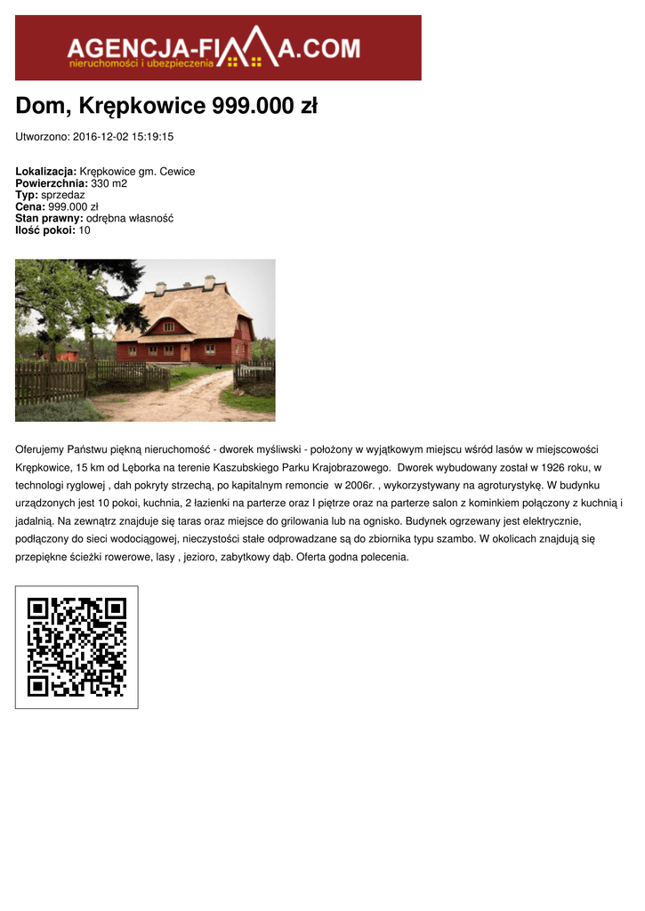 Dom, Krępkowice 999.000 zł Utworzono: 2016-12-02 15:19:15 Lokalizacja: Krępkowice gm. Cewice Powierzchnia: 330 m2 Typ: sprzedaz Cena: 999.000 zł Stan prawny: odrębna własność Ilość pokoi: 10 Oferujemy Państwu piękną nieruchomość - dworek myśliwski - położony w wyjątkowym miejscu wśród lasów w miejscowości Krępkowice, 15 km od Lęborka na terenie Kaszubskiego Parku Krajobrazowego. Dworek wybudowany został w 1926 roku, w technologi ryglowej , dah pokryty strzechą, po kapitalnym remoncie w 2006r. , wykorzystywany na agroturystykę. W budynku urządzonych jest 10 pokoi, kuchnia, 2 łazienki na parterze oraz I piętrze oraz na parterze salon z kominkiem połączony z kuchnią i jadalnią. Na zewnątrz znajduje się taras oraz miejsce do grilowania lub na ognisko. Budynek ogrzewany jest elektrycznie, podłączony do sieci wodociągowej, nieczystości stałe odprowadzane są do zbiornika typu szambo. W okolicach znajdują się przepiękne ścieżki rowerowe, lasy , jezioro, zabytkowy dąb. Oferta godna polecenia.