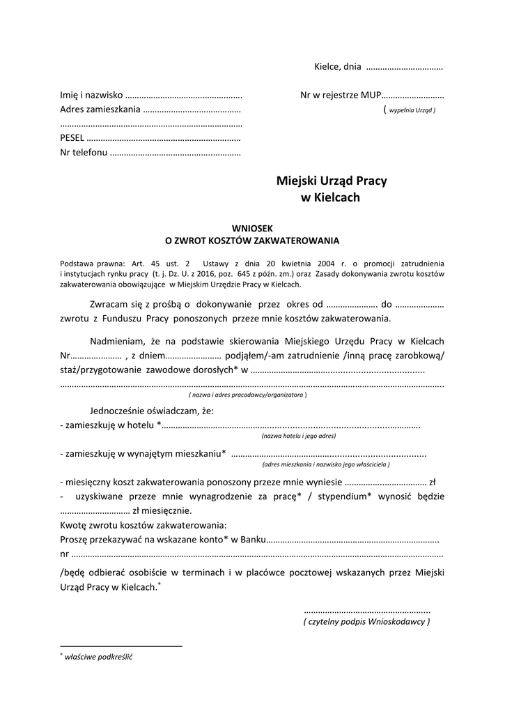Kielce, dnia …………………………… Imię i nazwisko …………………………………….……. Adres zamieszkania …………………………………… …………………………………………………………………… PESEL ………………………………………………………… Nr telefonu ……………………………………..………… Nr w rejestrze MUP……………………… ( wypełnia Urząd ) Miejski Urząd Pracy w Kielcach WNIOSEK O ZWROT KOSZTÓW ZAKWATEROWANIA Podstawa prawna: Art. 45 ust. 2 Ustawy z dnia 20 kwietnia 2004 r. o promocji zatrudnienia i instytucjach rynku pracy (t. j. Dz. U. z 2016, poz. 645 z późn. zm.) oraz Zasady dokonywania zwrotu kosztów zakwaterowania obowiązujące w Miejskim Urzędzie Pracy w Kielcach. Zwracam się z prośbą o dokonywanie przez okres od …………………. do ………………… zwrotu z Funduszu Pracy ponoszonych przeze mnie kosztów zakwaterowania. Nadmieniam, że na podstawie skierowania Miejskiego Urzędu Pracy w Kielcach Nr………….……… , z dniem…………………… podjąłem/-am zatrudnienie /inną pracę zarobkową/ staż/przygotowanie zawodowe dorosłych* w ……………………………...................................... ……………………………………………………………………………………………………………………………………………….. ( nazwa i adres pracodawcy/organizatora ) Jednocześnie oświadczam, że: - zamieszkuję w hotelu *………………………………………................................................…………. (nazwa hotelu i jego adres) - zamieszkuję w wynajętym mieszkaniu* ……………………………………...................................... (adres mieszkania i nazwisko jego właściciela ) - miesięczny koszt zakwaterowania ponoszony przeze mnie wyniesie ……………..……………… zł - uzyskiwane przeze mnie wynagrodzenie za pracę* / stypendium* wynosid będzie ………………………… zł miesięcznie. Kwotę zwrotu kosztów zakwaterowania: Proszę przekazywad na wskazane konto* w Banku……………………………………………………………….. nr …………………………………………………………………………………………………………………………………………… /będę odbierad osobiście w terminach i w placówce pocztowej wskazanych przez Miejski Urząd Pracy w Kielcach. ……………………………………………... ( czytelny podpis Wnioskodawcy ) właściwe podkreślić OŚWIADCZAM, ŻE - Wszystkie dane zawarte w niniejszym wniosku są prawdziwe. - Czas dojazdu do miejscowości będącej siedzibą pracodawcy/organizatora i powrotu do miejsca mojego stałego zamieszkania środkami transportu zbiorowego wynosi łącznie ponad 3 godziny dziennie. Zostałem/-am pouczony/-a o odpowiedzialności karnej przewidzianej w art. 233 § 1 w związku z art. 233 § 6 Kodeksu karnego za zatajenie prawdy lub zeznanie nieprawdy. Art. 233 § 1 K.k.: „Kto, składając zeznanie mające służyd za dowód w postępowaniu sądowym lub innym postępowaniu prowadzonym na podstawie ustawy, zeznaje nieprawdę lub zataja prawdę, podlega karze pozbawienia wolności od 6 miesięcy do lat 8”. Przepis ten stosuje się odpowiednio do osoby, która składa fałszywe oświadczenia ( art. 233 § 6 K.k.). Zobowiązuję się: - przedstawiad za każdy miesiąc rozliczenie faktycznie poniesionych kosztów zakwaterowania na obowiązującym formularzu: „Rozliczenie faktycznie poniesionych kosztów zakwaterowania w danym miesiącu” , wraz z wymienionymi w formularzu załącznikami. - niezwłocznie informowad Miejski Urząd Pracy w Kielcach o fakcie przerwania: zatrudnienia, innej pracy zarobkowej, stażu lub przygotowania zawodowego dorosłych oraz o innych okolicznościach mogących mied wpływ na przyznany zwrot kosztów zakwaterowania. .............................................................. (czytelny podpis Wnioskodawcy) Załączniki: - umowa najmu lub dokument potwierdzający zakwaterowanie w hotelu. - Umowa potwierdzająca podjęcie zatrudnienia lub innej pracy zarobkowej* *Dotyczy osób które podjęły zatrudnienie lub inną pracę zarobkową W/w dokumenty należy przedłożyć w oryginale lub ich kserokopie wraz z oryginałami pracownika Urzędu przyjmującego dokumenty. do wglądu dla (Wypełnia Miejski Urząd Pracy w Kielcach) Potwierdzenie przez pracownika urzędu uczestnictwa osoby bezrobotnej w danej formie aktywizacji …………………………………………………………………………………………………………………… ……………………………………………………………………………………………………………………. ……………………………………………………………………………………………………………………. ……………………………………………………………………………………………………………………. ………………………………………………. (data, podpis i pieczątka pracownika MUP) Opinia pracownika merytorycznego …………………………………………………………………………………………………………………….. …………………………………………………………………………………………………………………….. ……………………………………………………………………………………………………………………. ………...………………………………………………. (data, podpis i pieczątka pracownika merytorycznego)