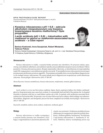Anestezjologia i Ratownictwo 2015; 9: 180-185 Nauka praktyce / Science for medical practice O P I S P R Z Y PA D K U / C A S E R E P O R T Otrzymano/Submitted: 02.03.2015 • Zaakceptowano/Accepted: 21.06.2015 © Akademia Medycyny Kwasica mleczanowa z pH < 6,8 – zatrucie alkoholem niespożywczym czy kwasica towarzysząca leczeniu metforminą? Opis przypadku Lactic acidosis (pH < 6,8) – intoxication with methanol or glycol or metformin-associated lactic acidosis – a case report Bartosz Kozłowski, Anna Szczęśniak, Robert Włodarski, Tadeusz Piekarz Kliniczny Oddział Anestezjologii i Intensywnej Terapii im. płk. prof. dr. n. med. Stanisława Pokrzywnickiego, 10 Wojskowy Szpital Kliniczny z Polikliniką w Bydgoszczy Streszczenie Kwasica mleczanowa to rzadki, a zarazem bardzo poważny stan chorobowy. Do przyczyn należą: sepsa, wstrząs, niewydolność oddechowa, niewydolność wątroby, zatrucia alkoholem niespożywczym oraz lekami. Połowa pacjentów z kwasicą mleczanową umiera. Skrajnie niepomyślne rokowanie, ze śmiertelnością wewnątrzszpitalną rzędu 94%, mają pacjenci z niewydolnością wątroby oraz nerek. W przypadku kwasicy mleczanowej towarzyszącej przyjmowaniu metforminy przeżycie sięga 68%. Prezentujemy przypadek, który stworzył problemy diagnostyczne co do etiologii kwasicy mleczanowej. Nie mniej jednak proces diagnostyczno-terapeutyczny został zakończony sukcesem. Anestezjologia i Ratownictwo 2015; 9: 180-185. Słowa kluczowe: kwasica metaboliczna, kwasica mleczanowa, metformina, metanol, glikol etylenowy Abstract Lactic acidosis is a very rare but serious condition. Sepsis, shock, respiratory failure, liver failure, methanol/ glycol or drug intoxication may cause lactic acidosis. It is potentially fatal and half of the patients die. In-hospital mortality in patients with liver or renal failure reaches up to 94%. In patients with metformin-associated lactic acidosis survival reaches 68%. We present a case of a man with severe lactic acidosis, which etiology was unknown. Nevertheless, diagnostic and therapeutic process has been completed successfully.Anestezjologia i Ratownictwo 2015; 9: 180-185. Keywords: metabolic acidosis, lactic acidosis, metformin, methanol, glycol Wstęp czanów oraz protonów. Zwiększona produkcja kwasu mlekowego jest następstwem zaburzeń perfuzji tkankowej i nasilenia glikolizy beztlenowej. Wyróżniamy 2 typy kwasicy mleczanowej: A - beztlenowa, B - tlenowa. Niektórzy autorzy wyodrębniają jeszcze typ Kwasica mleczanowa to rzadko występujący, a zarazem bardzo poważny stan chorobowy, wynikający z nagromadzenia w przestrzeni płynowej mle180 180 Anestezjologia i Ratownictwo 2015; 9: 180-185 Nauka praktyce / Science for medical practice zatruć metanolem. W czasie przyjęcia do Szpitalnego Oddziału Ratunkowego (SOR) pacjent: przytomny, w ograniczonym kontakcie słowno-logicznym, GCS 9 pkt (3+3+3), źrenice wąskie, równe, słabo reagujące na światło. Podczas badania podmiotowego chory zaprzeczał spożywaniu jakiegokolwiek alkoholu. Podczas dalszej egzaminacji doszło do nagłej depresji oddechowej z towarzyszącą bradykardią do 30 uderzeń/ minutę. Pacjenta zaintubowano i rozpoczęto terapię wentylacyjną. Chorego zakwalifikowano do leczenia w Oddziale Intensywnej Terapii (OIT). W badaniach laboratoryjnych wykonanych w SOR a następnie w OIT odnotowano narastającą kwasicę metaboliczną z bardzo wysokim stężeniem kwasu mlekowego we krwi tętniczej (28,48 mmol/l; zakres referencyjny 0,50-2,20) (tabela II). U chorego niezwłocznie wdrożono: respiratoroterapię, wlew amin presyjnych oraz ciągłą terapię nerkozastępczą z przepływem dializatu 4000 ml/h. Pobrano krew na badanie toksykologiczne w kierunku zatrucia metanolem albo glikolem. Ze względu na znaczny niedobór wodorowęglanów rozpoczęto ich podaż w ciągłym wlewie dożylnym. Przez pierwsze dwie godziny podawano je z prędkością 200 mEq/h a następne trzy godziny - 100 mEq/h. Do hemodializy stosowano standardowy płyn z zawartością wodorowęglanów o stężeniu 20 mmol/l. Na podstawie obrazu klinicznego u chorego rozpoznano zatrucie alkoholem niespożywczym oraz włączono celem leczenia wlew 10% etanolu. Terapię wodorowęglanami kontrolowano powtarzanymi badaniami gazometrii krwi tętniczej, łącznie z badaniami poziomu sodu, potasu i glikemii. Podaż etanolu zakończono po 10 godzinach wlewu. Ciągła terapia nerkozastępcza trwała około 18 h i została zakończona po ustabilizowaniu się stanu pacjenta. Wyniki badań toksykologicznych nie potwierdziły obecności metanolu ani glikolu we krwi pacjenta. W 5. dobie pobytu pacjent przestał wymagać podaży amin presyjnych. Po dwóch dniach od zaprzestania sedacji, ze względu na jakościowe zaburzenia świadomości, wykonano u chorego CT głowy, w którym opisane zostało drobne ognisko hipodensyjne średnicy 8 mm w obrębie jąder podkorowych po stronie prawej. Zmiana ta była niewidoczna w badaniu CT głowy wykonanym w dniu przyjęcia. W 7. dobie pobytu zakończono terapię wentylacyjną oraz ekstubowano chorego. W przeprowadzonej konsultacji okulistycznej nie odnotowano cech uszkodzenia nerwów wzrokowych. W 12. dobie pobytu, pacjenta z rozpoznaniem udar mózgu przekazano celem dalszego D - u pacjentów z zespołem krótkiego jelita [1]. Typ A występuje w stanach niedotlenienia tkankowego, np. we wstrząsie, zatruciu tlenkiem węgla, ciężkiej hipoksemii czy też ciężkiej anemii. Kwasica mleczanowa typu B, tzw. tlenowa, występuje natomiast z innych przyczyn niż niedotlenienie i towarzyszy innym stanom chorobowym, takim jak: nowotwory, cukrzyca, niedobór tiaminy, uszkodzenia wątroby. Ponadto może być efektem zatruć: salicylanami, etanolem, alkoholem niespożywczym, metforminą lub innych zaburzeń metabolicznych [2,3]. Do objawów klinicznych kwasicy mleczanowej (poza objawami choroby podstawowej) należą: osłabienie, nudności, wymioty, ból brzucha, majaczenie, śpiącz