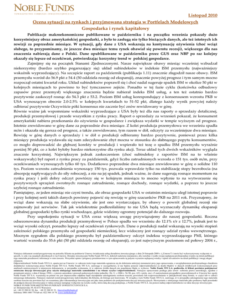 Listopad 2010 Ocena sytuacji na rynkach i przyjmowana strategia w Portfelach Modelowych Gospodarka i rynek kapitałowy Publikacje makroekonomiczne publikowane w październiku i na początku września pokazały dużo korzystniejszy obraz amerykańskiej gospodarki, a było to zasługą nie tylko bieżących danych, ale też istotnych ich rewizji za poprzednie miesiące. W sytuacji, gdy dane z USA wskazują na kontynuację ożywienia (choć wciąż słabego, to przypominamy, że jeszcze dwa miesiące temu rynek obawiał się powrotu recesji), większego dla nas znaczenia nabierają dane z Polski. Dane opublikowane w październiku przez GUS oraz NBP po raz kolejny okazały się lepsze od oczekiwań, potwierdzając korzystny trend w polskiej gospodarce. Zajmijmy się na początek Stanami Zjednoczonymi. Nasze największe obawy miesiąc wcześniej wzbudzał niekorzystny (bardzo szybko pogarszający się) układ subindeksów w indeksie ISM przemysłu (najważniejszy wskaźnik wyprzedzający). Na szczęście raport za październik (publikacja 1.11) znacznie złagodził nasze obawy. ISM przemysłu wzrósł do 56.9 pkt z 54.4 (50 oddziela recesję od ekspansji), znacznie powyżej prognoz i tym samym mocno rozpoczął ostatni kwartał roku. Układ subindeksów poprawił się i choć nadal sugeruje spadek ISM w okolice 50 pkt w kolejnych miesiącach to powinno to być tymczasowe zejście. Ponadto w tej fazie cyklu (końcówka odbudowy zapasów przez przemysł) większego znaczenia będzie nabierał indeks ISM usług, a ten też ostatnio bardzo pozytywnie zaskoczył rosnąc do 54.3 pkt z 53.2. Poziom ISM usług korespondujący z konsensusem wzrostu PKB w USA wynoszącym obecnie 2.0-2.5% w kolejnych kwartałach to 51-52 pkt, dlatego każdy wynik powyżej należy odbierać pozytywnie Oczywiście póki konsensus nie zacznie być znów rewidowany w górę. Równie ważne jak wspomniane wskaźniki wyprzedzające z USA były też dla nas raporty o sprzedaży detalicznej, produkcji przemysłowej i przede wszystkim z rynku pracy. Raport o sprzedaży za wrzesień pokazał, że konsument amerykański nabiera przekonania do ożywienia w gospodarce i zwiększa wydatki w tempie wyższym od prognoz. Istotnie zrewidowano w górę dane za poprzednie dwa miesiące. Z kolei produkcja przemysłowa we wrześniu spadła m/m i okazała się gorsza od prognoz, a także zrewidowano, tym razem w dół, odczyty za wcześniejsze dwa miesiące. Rewizję w górę danych o sprzedaży i w dół o produkcji odbieramy bardzo pozytywnie, ponieważ przez kilka miesięcy produkcja wydawała się nam zdecydowanie zbyt mocna w stosunku do słabnącego popytu konsumentów, co mogło doprowadzić do głębszej korekty w produkcji i wspierało też tezę o spadku ISM przemysłu wyraźnie poniżej 50 pkt, co z kolei byłoby bardzo niekorzystne dla rynku akcji. Teraz układ tych dwóch wskaźników wygląda znacznie korzystniej. Największym jednak zaskoczeniem (choć subindeksy z raportów ISM na to właśnie wskazywały) był raport z rynku pracy za październik, gdyż liczba zatrudnionych wzrosła o 151 tys. osób m/m, przy oczekiwaniach wynoszących tylko 60 tys. Dodatkowo poprzednie dwa miesiące zrewidowano w górę o solidne 110 tys. Poziom wzrostu zatrudnienia wynoszący 150 tys. pozwala wprawdzie tylko na stabilizację stopy bezrobocia (na absorpcję napływających do siły roboczej), a nie na jej spadek, jednak ważne, że dane sugerują rosnące momentum na rynku pracy i jeśli dobry odczyt powtórzy się w kolejnym miesiącu to mocno wpłynie to na wytworzenie się pozytywnych sprzężeń zwrotnych: rosnące zatrudnienie, rosnące dochody, rosnące wydatki, a poprzez to jeszcze szybciej rosnące zatrudnienie. Pamiętajmy, ze jeden miesiąc nie czyni trendu, ale obraz gospodarki USA w ostatnim miesiącu uległ istotnej poprawie i przy kolejnej serii takich danych powinny pojawić się rewizję w górę szacunków PKB na 2011 rok. Przyznajemy, że wciąż dane wskazują na słabe ożywienie, ale jest ono wystarczające, by obawy o powrót globalnej recesji nie zajmowały już serwisów. Tak jak wielokrotnie podkreślaliśmy to nie USA będą wyznaczały dynamikę ekspansji globalnej gospodarki tylko rynki wschodzące, gdzie widzimy ogromny potencjał do dalszego rozwoju. Przy uspokojeniu sytuacji w USA coraz większą uwagę przywiązujemy do naszej gospodarki. Roczna odsezonowana dynamika produkcji przemysłowej w Polsce spadła we wrześniu do 12.1% r/r z 12.7%, jednak jest to wciąż wysoki odczyt, ponadto lepszy od oczekiwań rynkowych. Dane o produkcji nadal wskazują na wysoki stopień zależności polskiego przemysłu od gospodarki niemieckiej, lecz widoczny jest rosnący udział rynku wewnętrznego. Mocnym sygnałem dla polskiego przemysłu był październikowy odczyt indeksu wyprzedzającego PMI, którego wartość wzrosła do 55.6 pkt (50 pkt oddziela recesję od ekspansji), co jest najwyższym poziomem od połowy 2004 r., Niniejszy dokument został przygotowany na potrzeby Klienta na podstawie Umowy świadczenia usług doradztwa inwestycyjnego z dnia 24 listopada 2008 r. („Umowa”) i moŜe być wykorzystywany wyłącznie w sposób, w celu i na zasadach określonych w tej Umowie. Doradcy inwestycyjni Noble Funds TFI S.A. dołoŜyli naleŜytej staranności, aby rzetelnie i wedle swojej najlepszej profesjonalnej wiedzy na dzień publikacji tego materiału przedstawić informacje w nim zawarte. Wszystkie opinie i prognozy przedstawione w tym opracowaniu są jedynie wyrazem najlepszej wiedzy i opinii ich autorów na dzień publikacji i mogą ulegać zmianom. Odpowiedzialność Noble Funds TFI S.A. oparta jest na Umowie i w zakresie treści tego materiału ogranicza się do dołoŜenia naleŜytej staranności przy jego opracowaniu, z uwzględnieniem profesjonalnego charakteru działalności wykonywanej przez Noble Funds TFI S.A. Noble Funds TFI S.A. zastrzega w szczególności, iŜ nie będzie ponosić odpowiedzialności za 